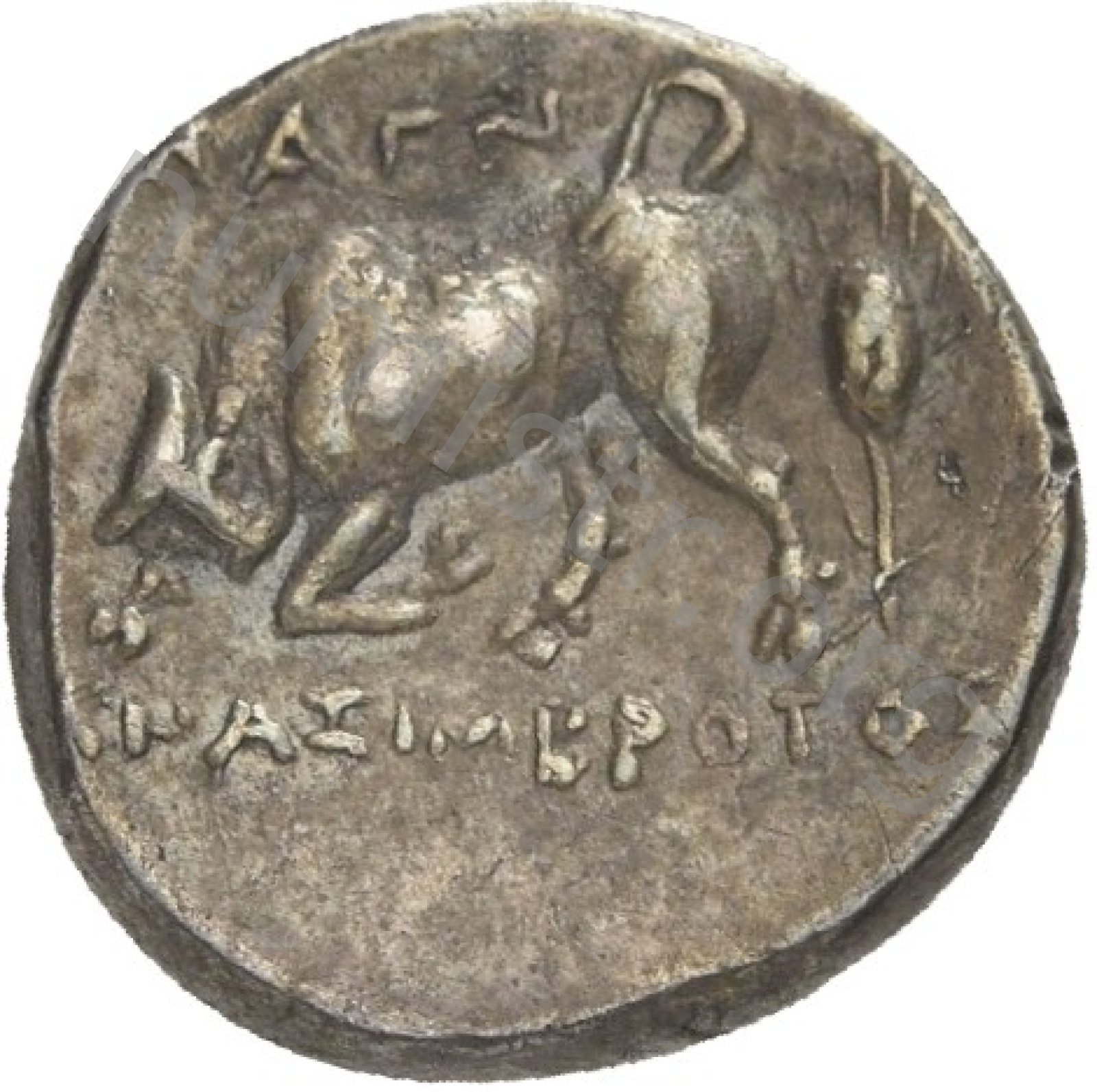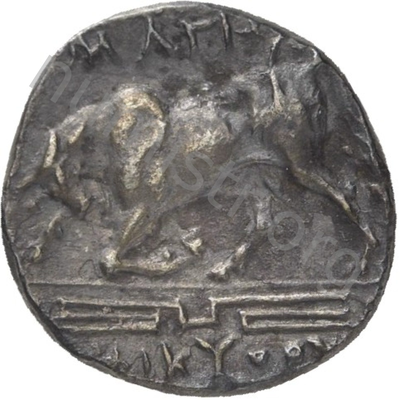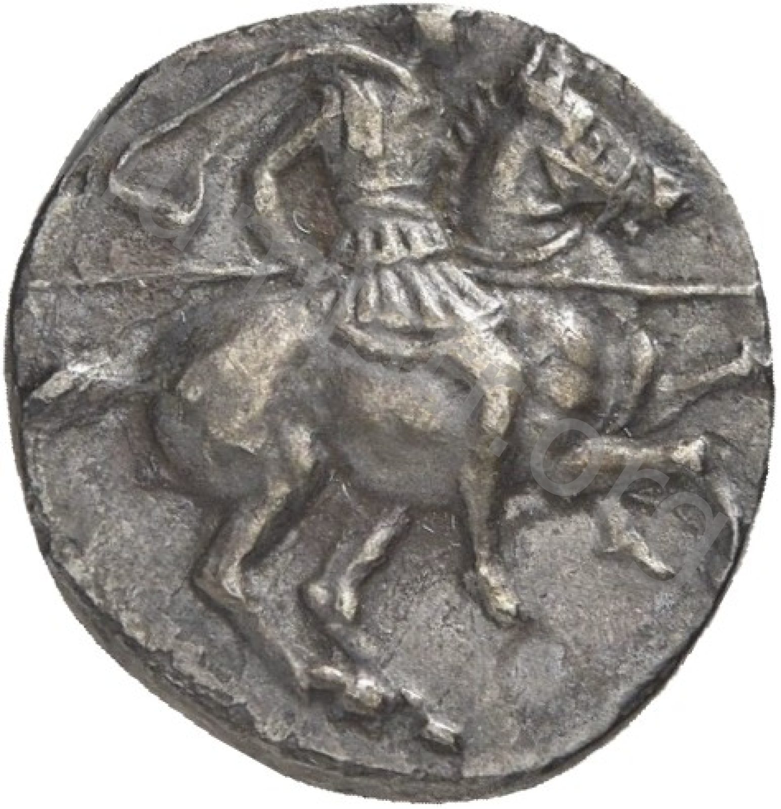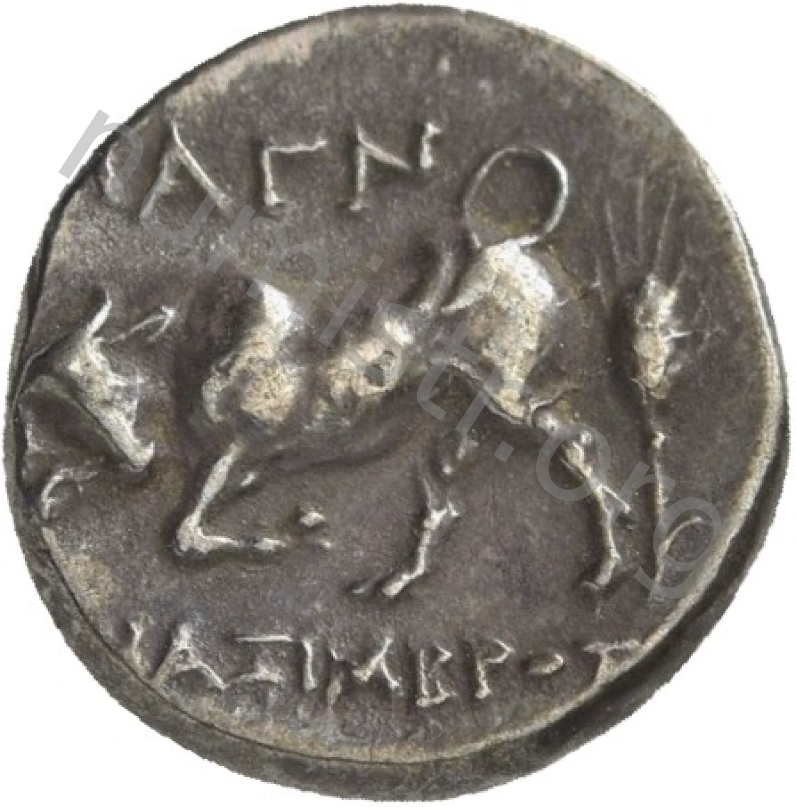 Horseman galloping wearing a helmet and wearing a chlamys (cloak) and a breastplate holding a spear; beneath magistrate's name and sometimes maeander pattern. -[en]