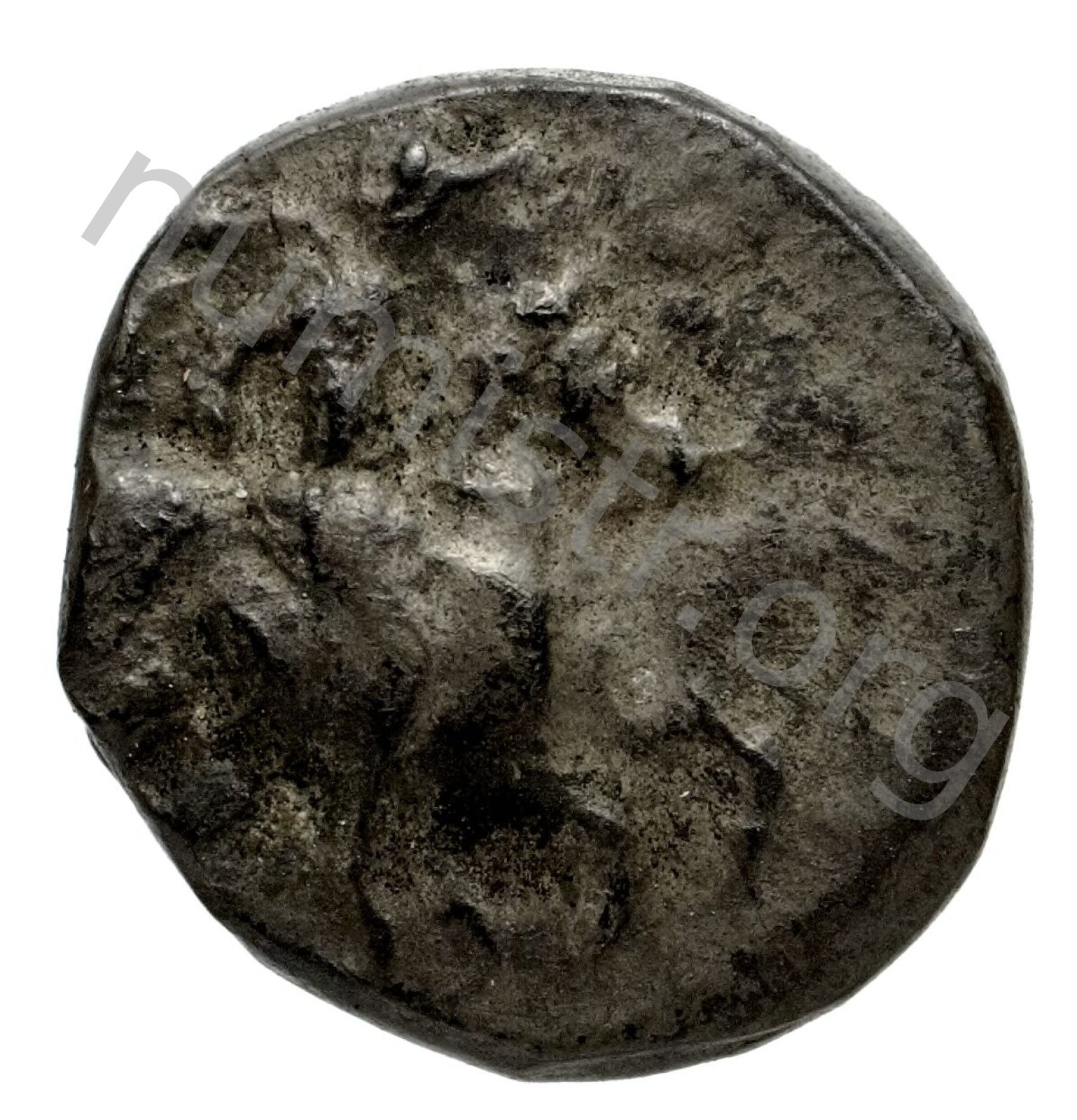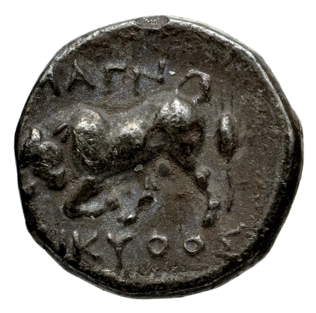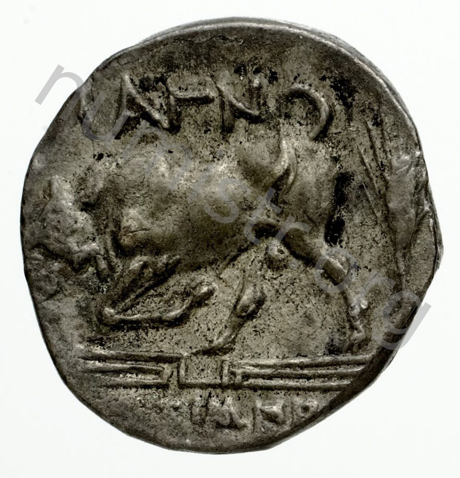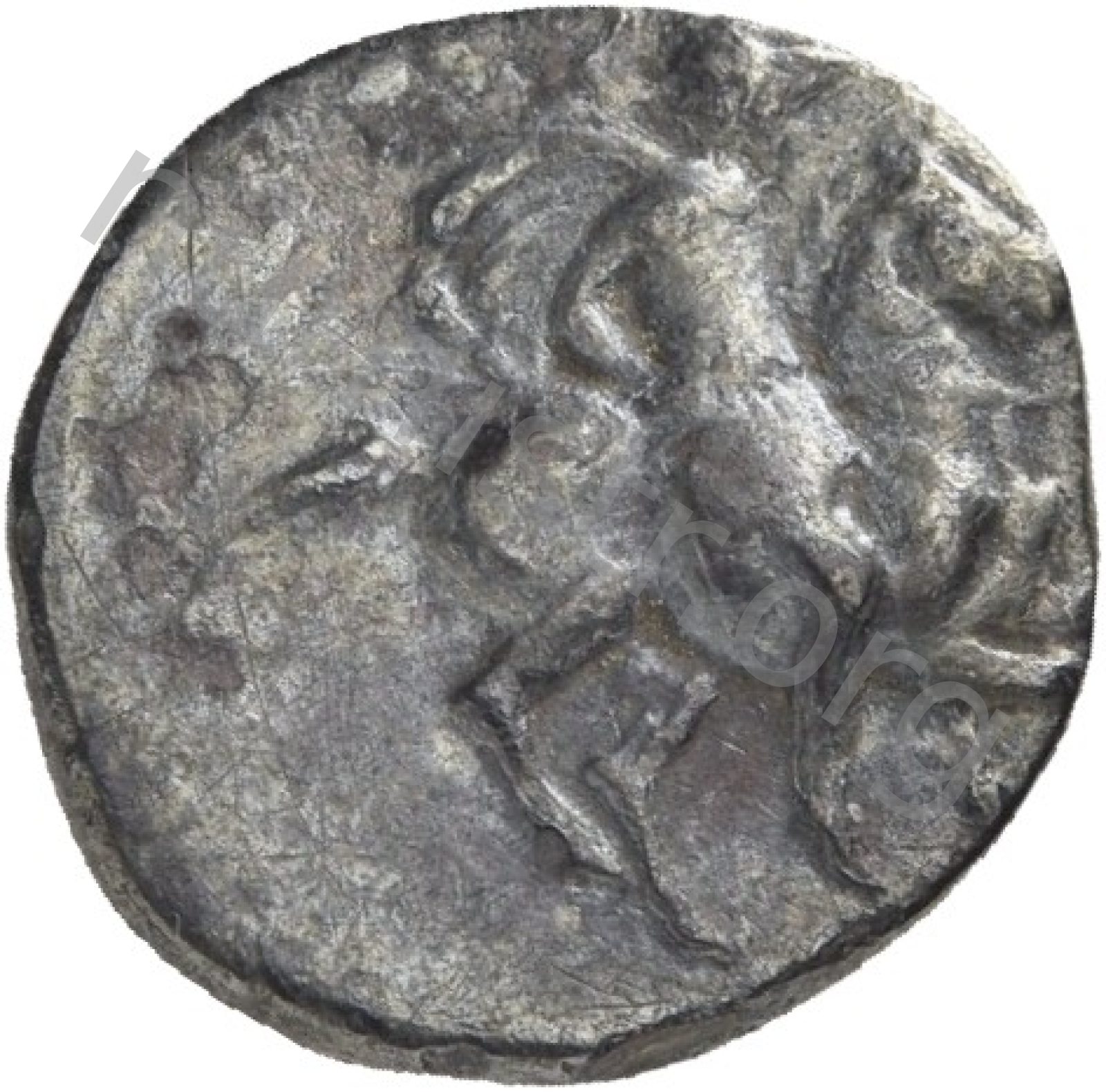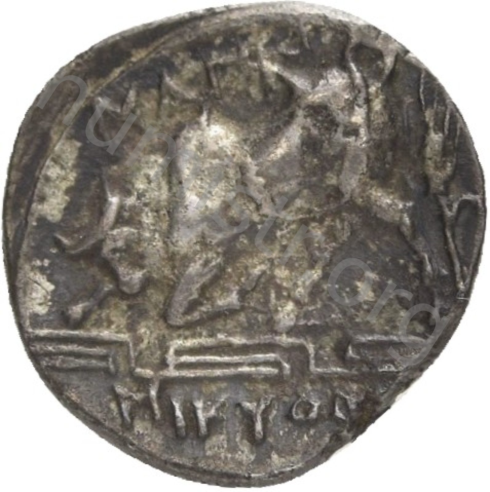 Horseman galloping wearing a helmet and wearing a chlamys (cloak) and a breastplate holding a spear; beneath magistrate's name and sometimes maeander pattern. -[en]