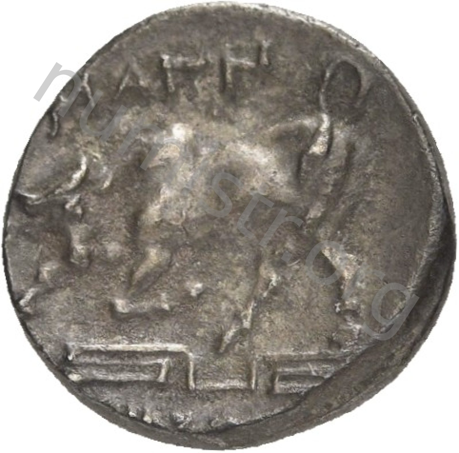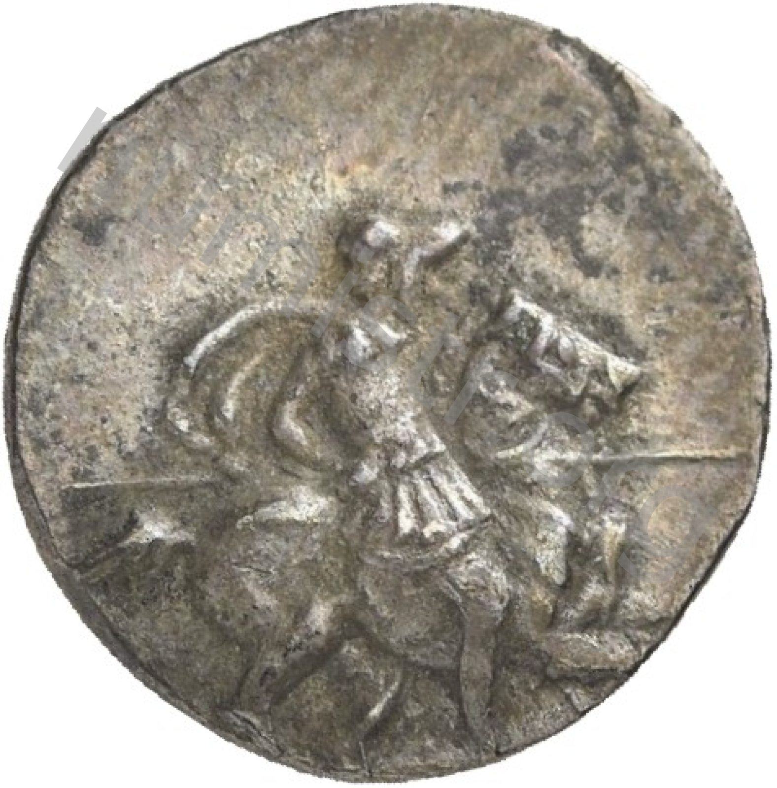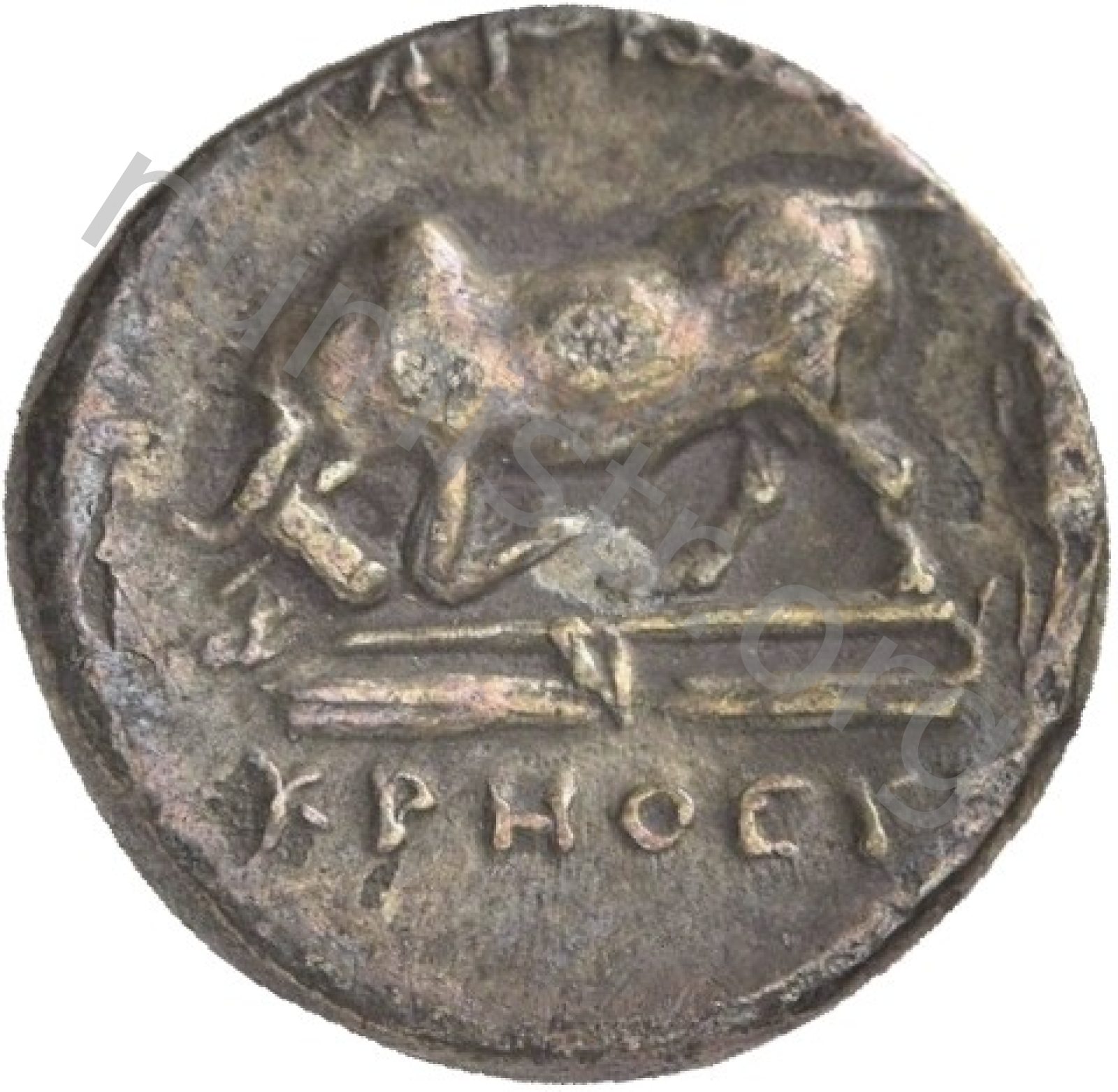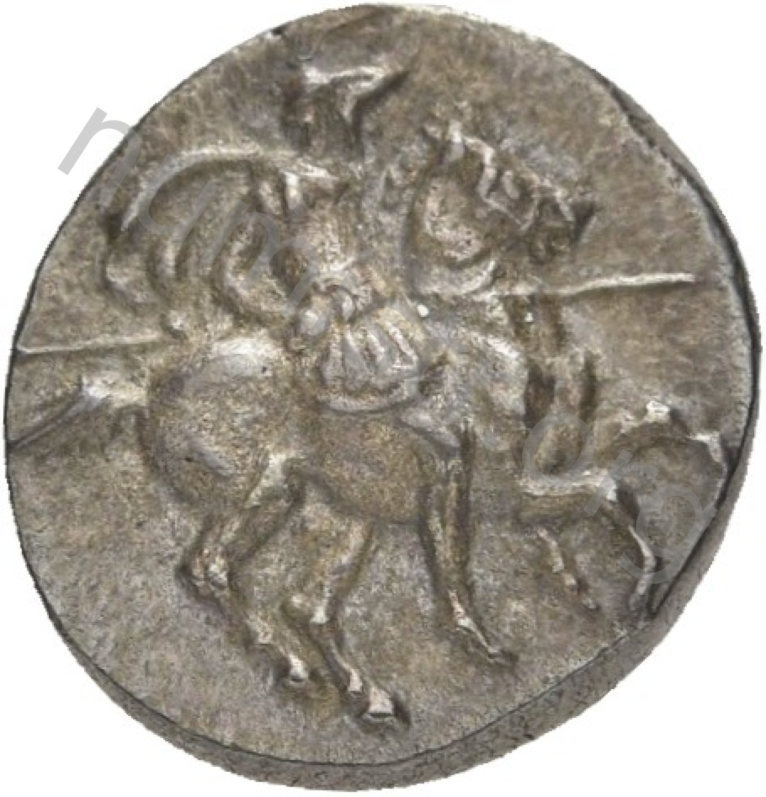 Miğferli klamis (pelerin) ve elinde mızrak tutan bir göğüs zırhı giymiş dörtnala koşan atlı; altında yargıcın adı ve bazen de maeander deseni yazılı.