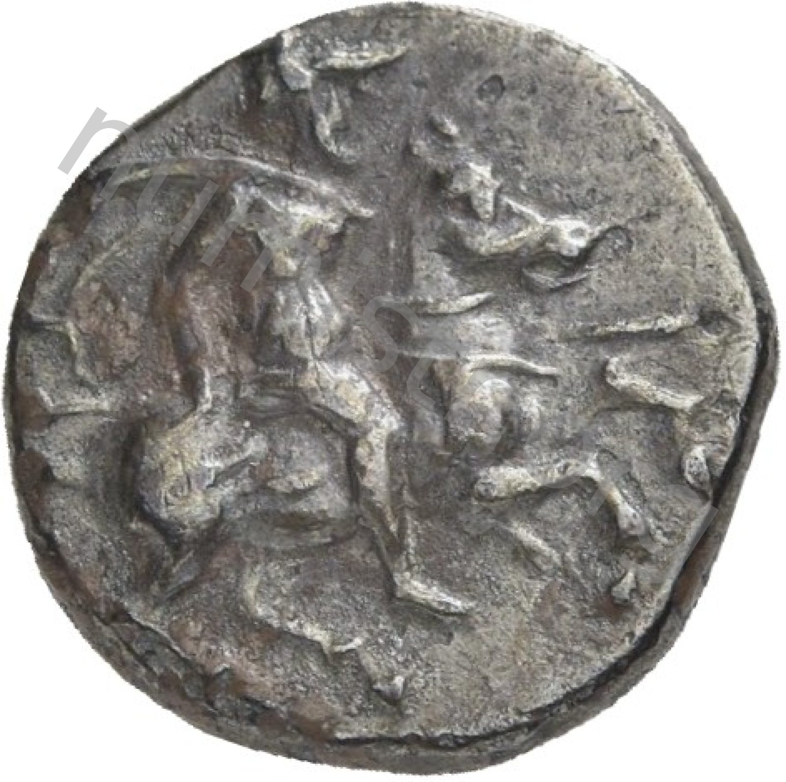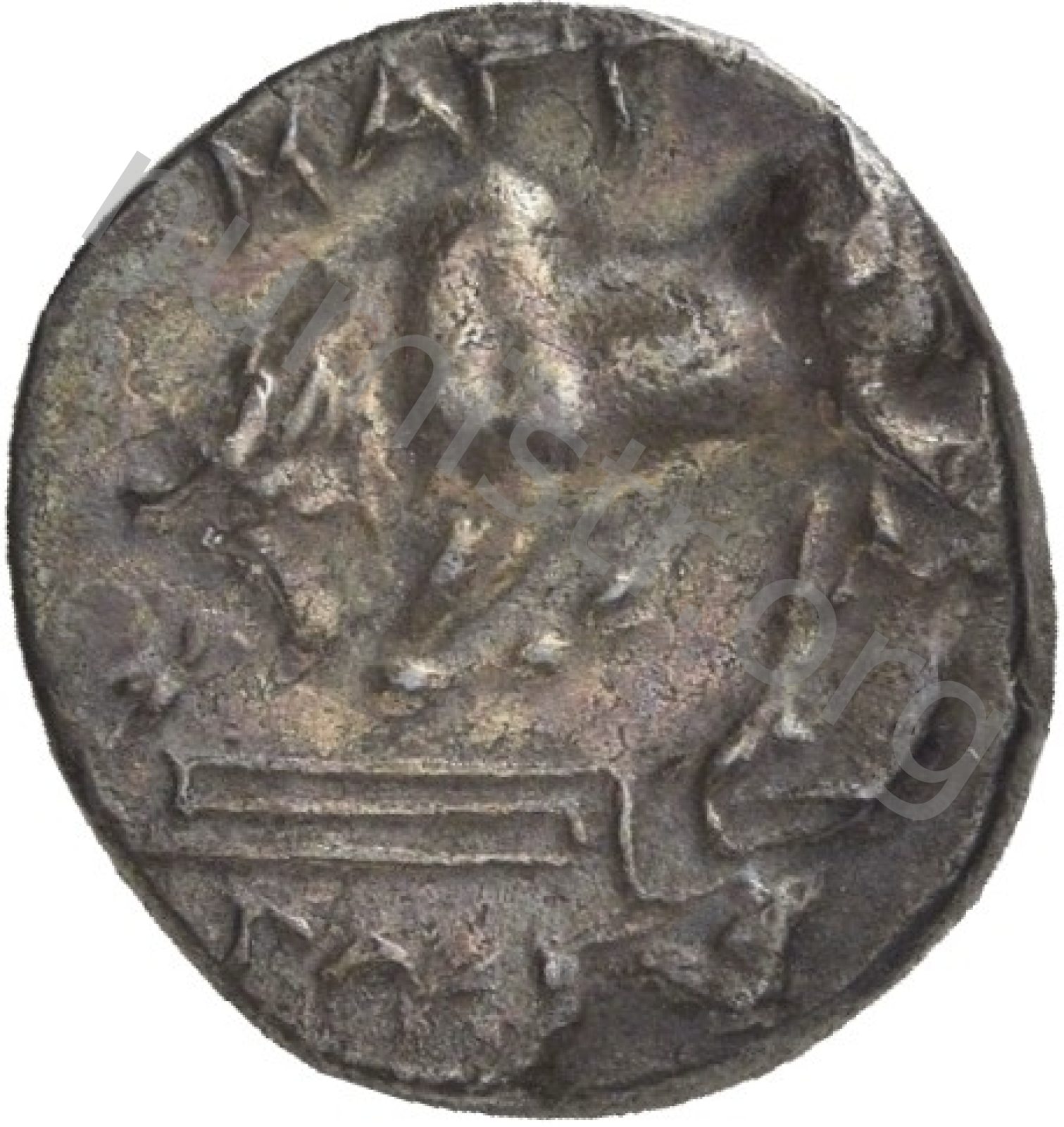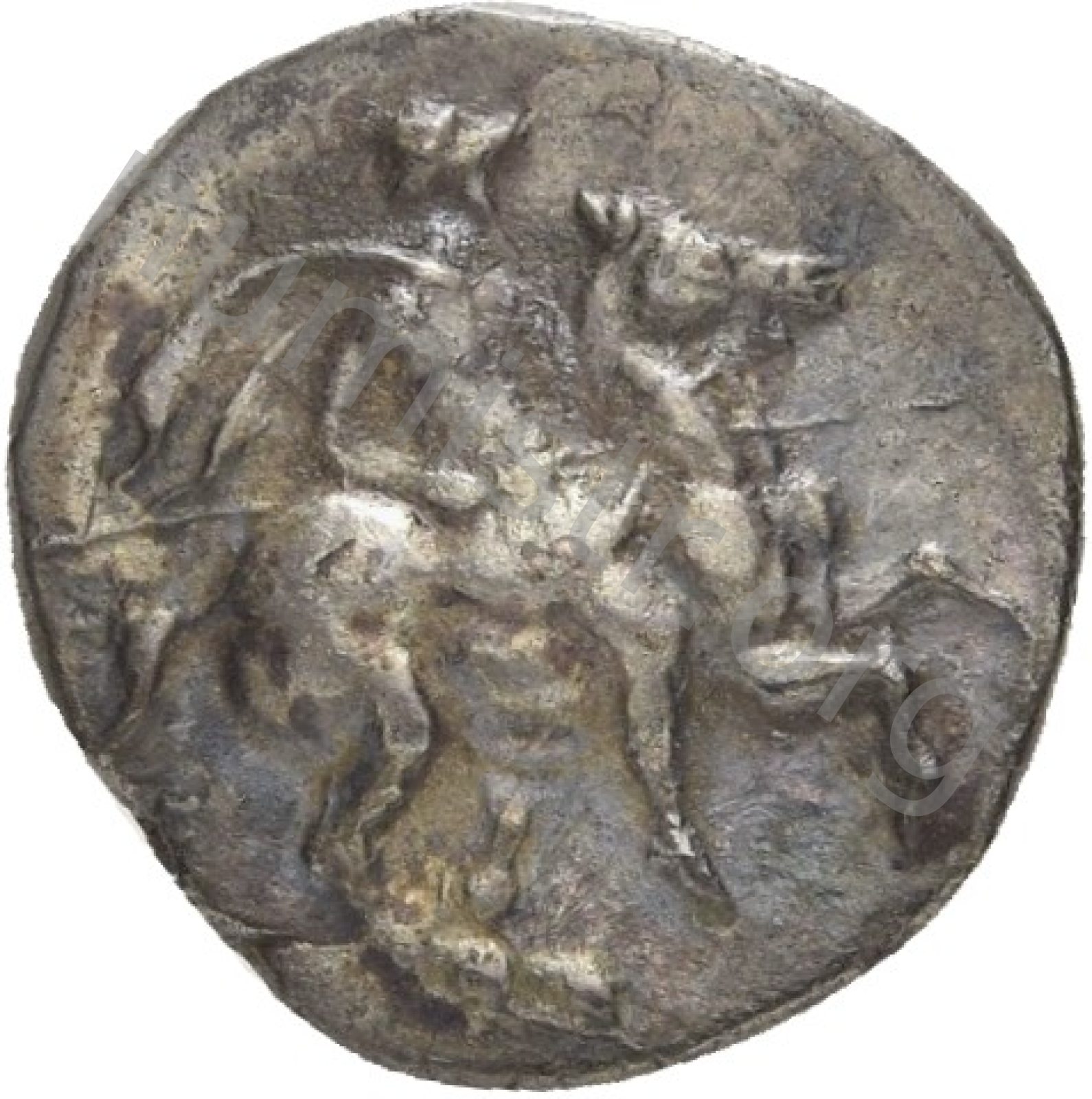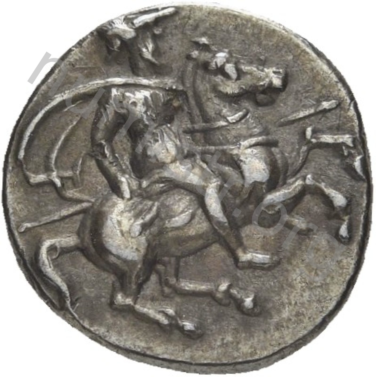 Miğferli klamis (pelerin) ve elinde mızrak tutan bir göğüs zırhı giymiş dörtnala koşan atlı; altında yargıcın adı ve bazen de maeander deseni yazılı.