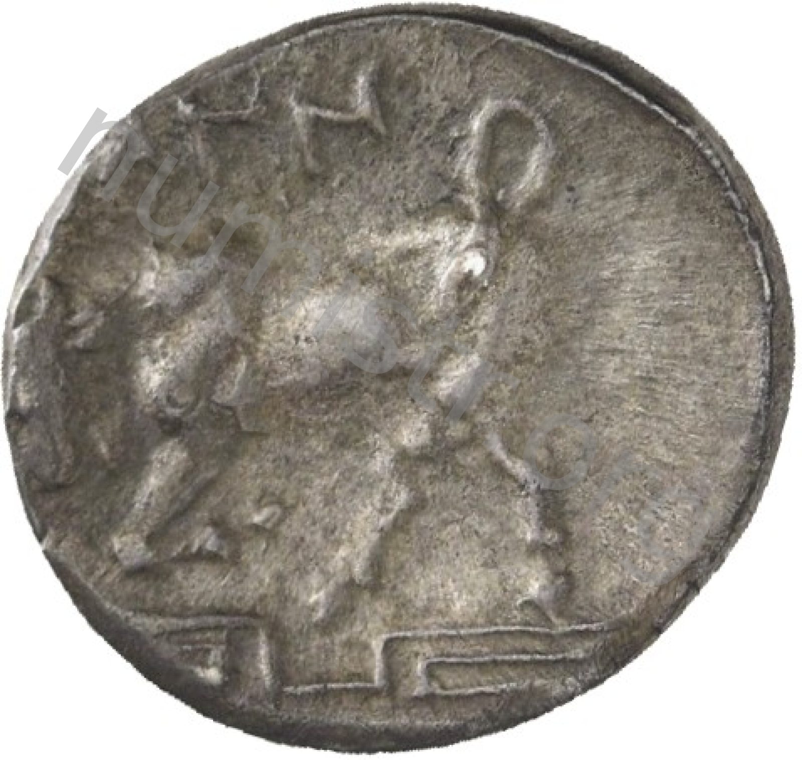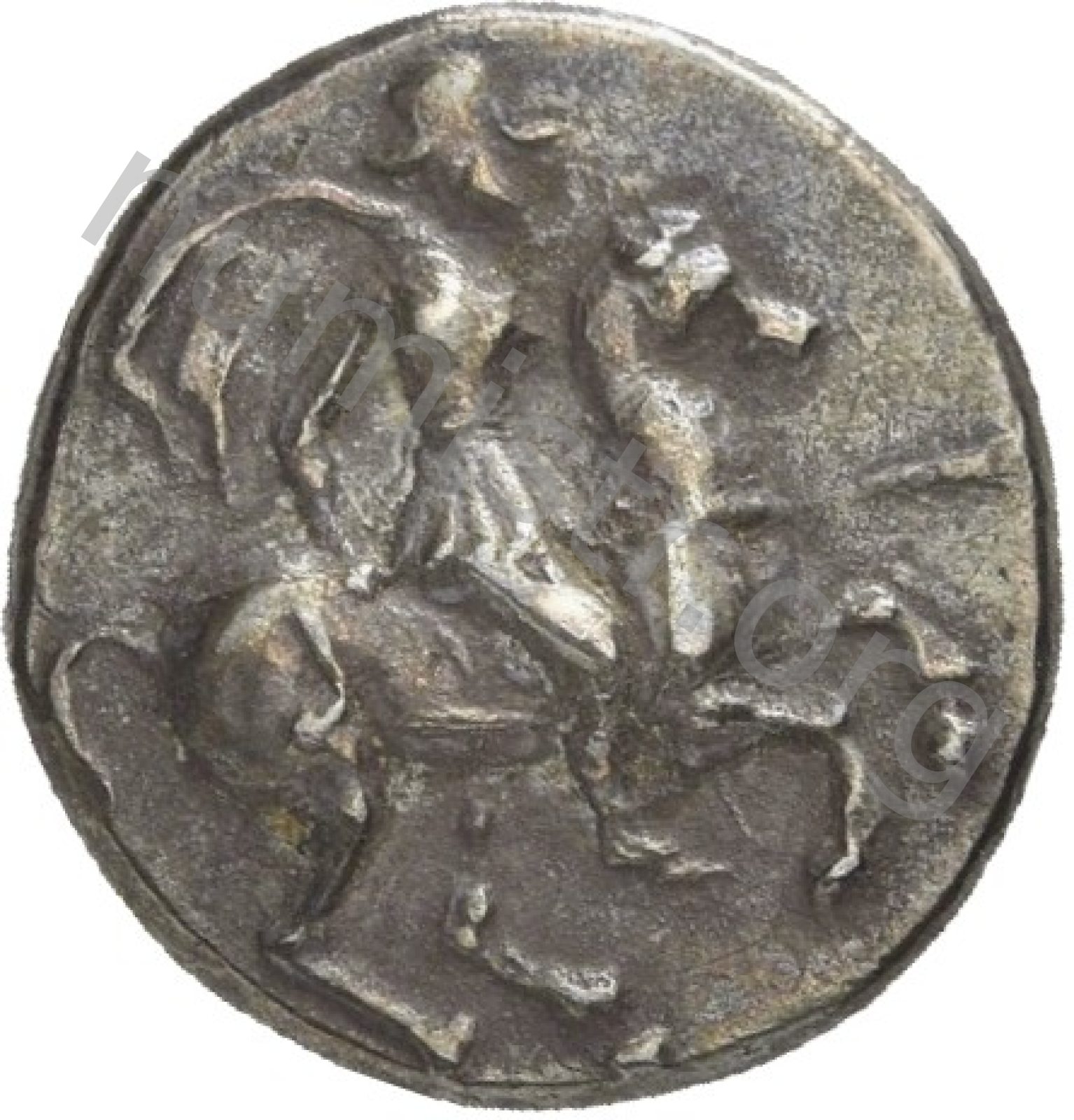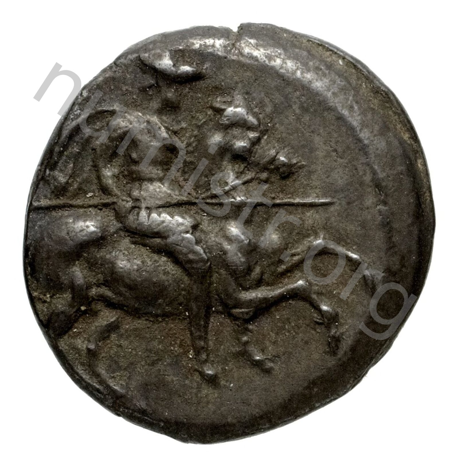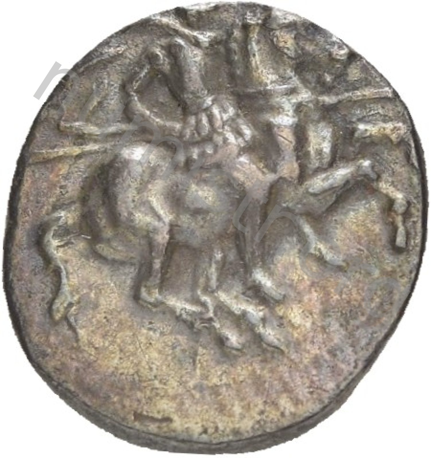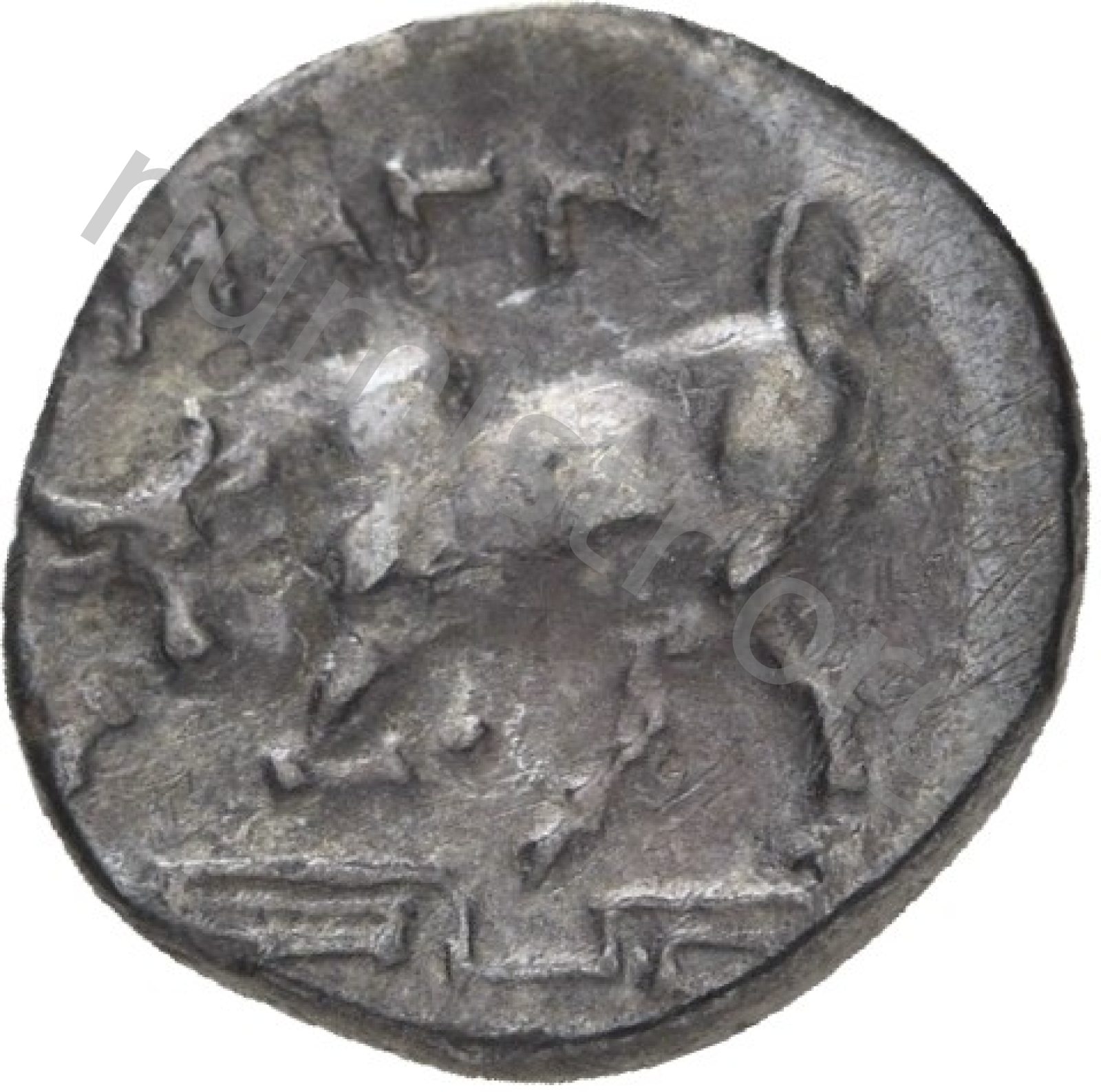 Miğferli klamis (pelerin) ve elinde mızrak tutan bir göğüs zırhı giymiş dörtnala koşan atlı; altında yargıcın adı ve bazen de maeander deseni yazılı.
