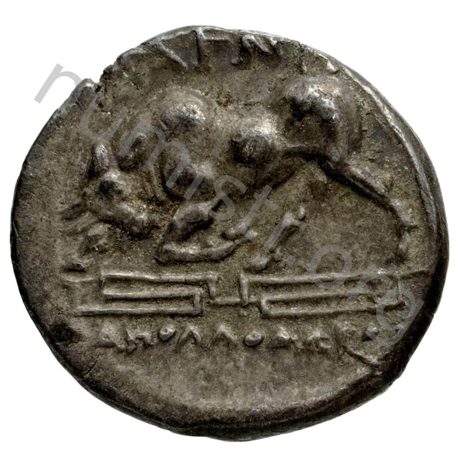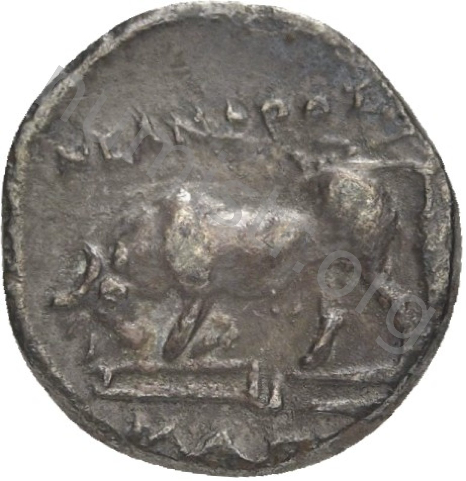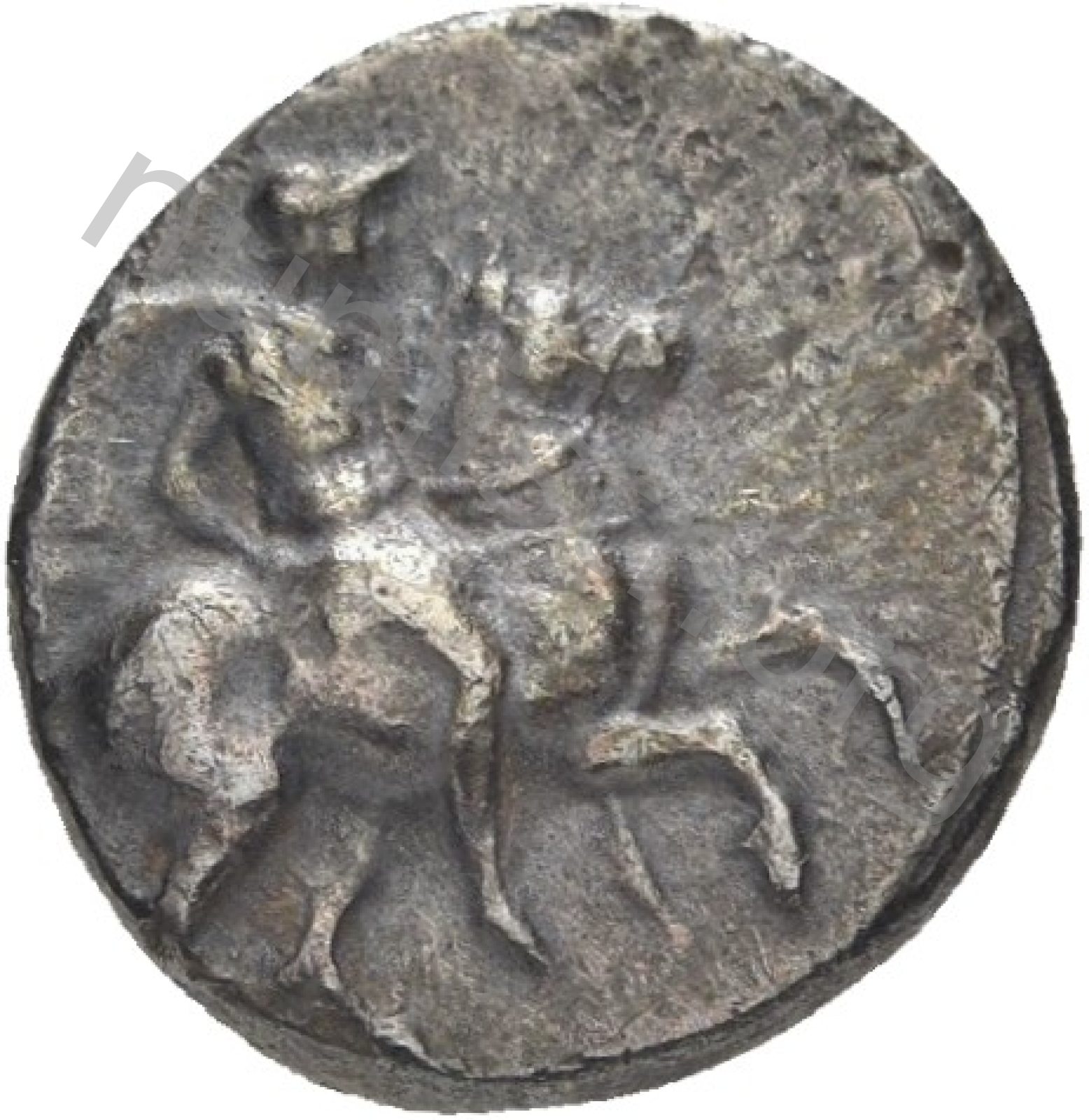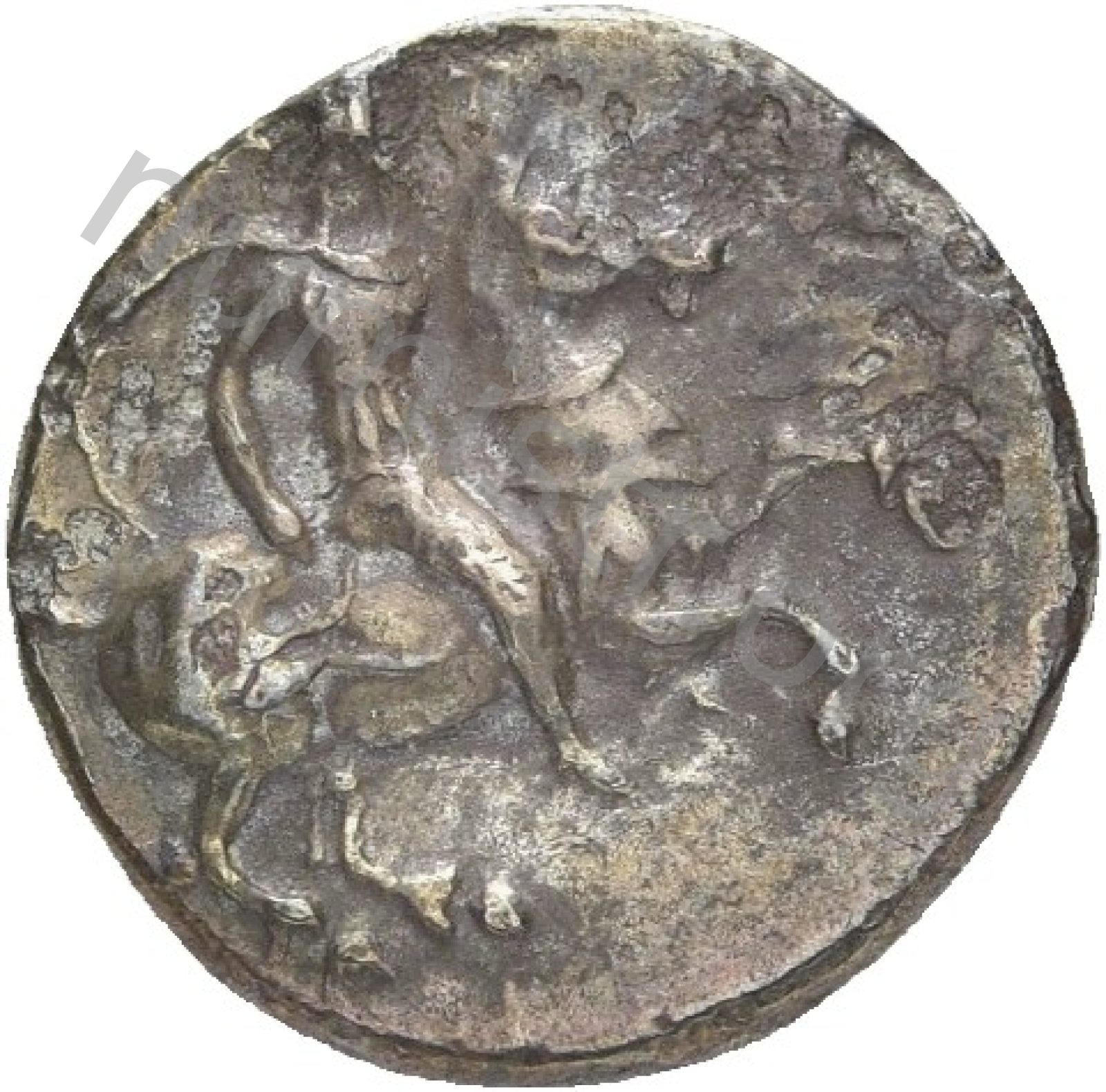 Miğferli klamis (pelerin) ve elinde mızrak tutan bir göğüs zırhı giymiş dörtnala koşan atlı; altında yargıcın adı ve bazen de maeander deseni yazılı.