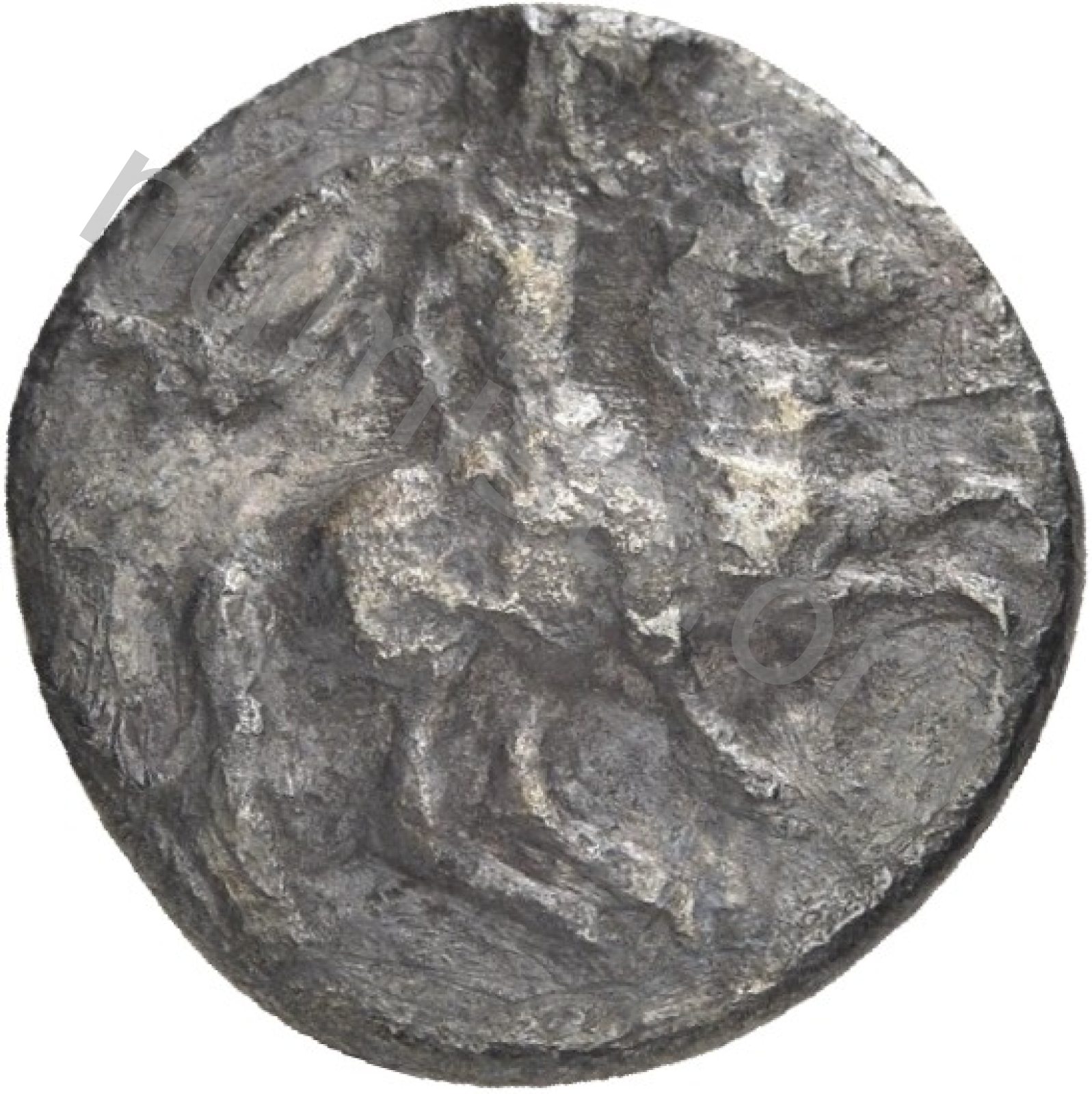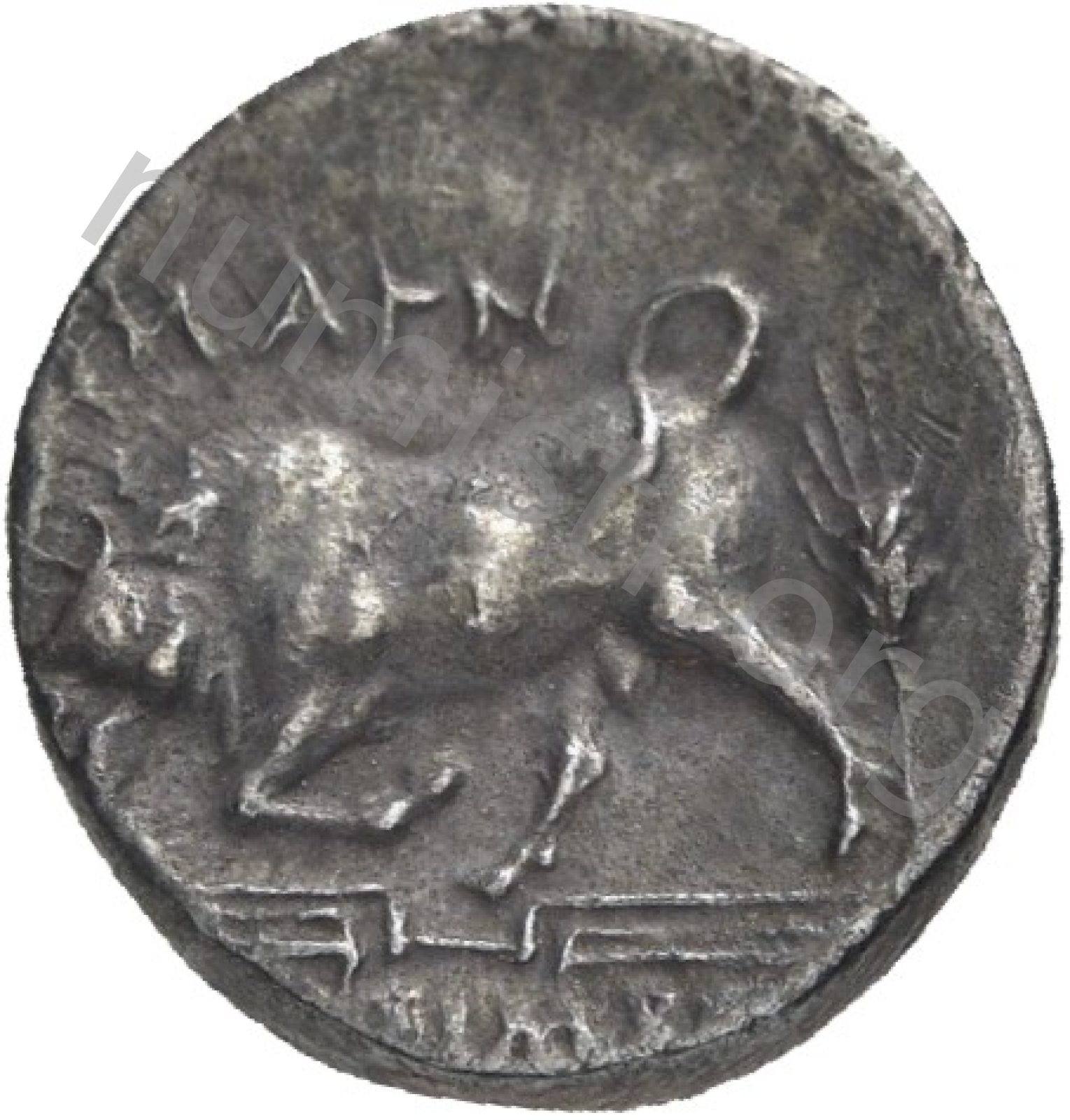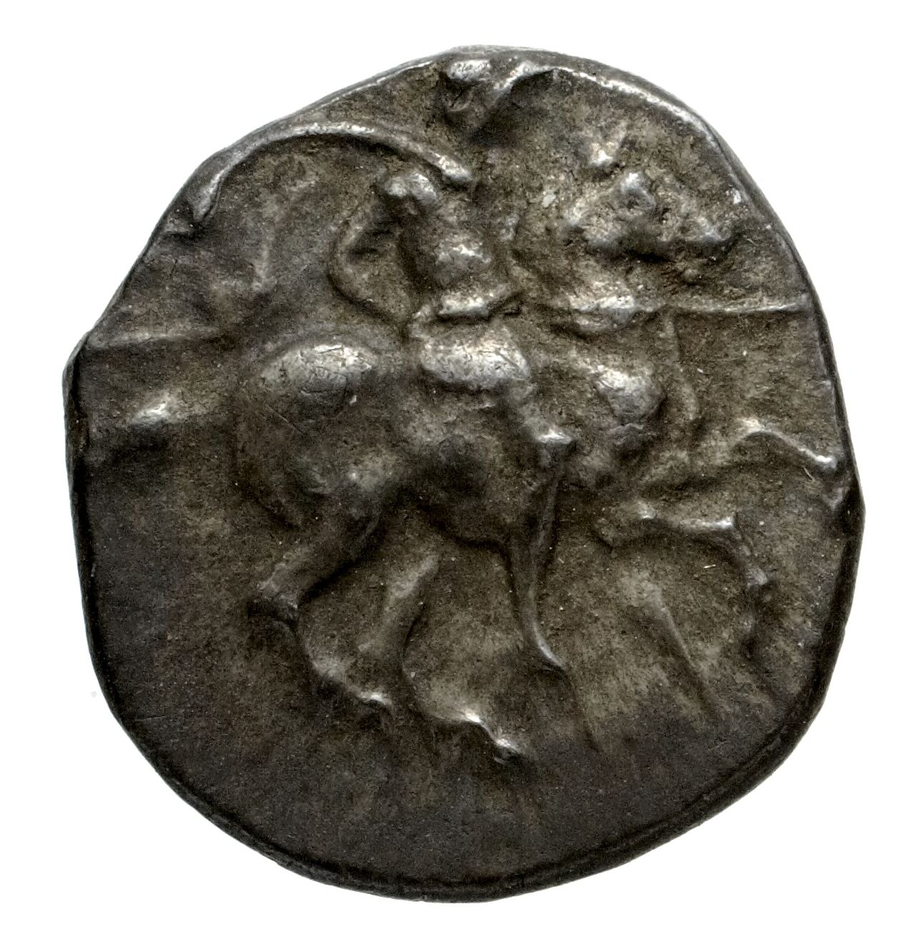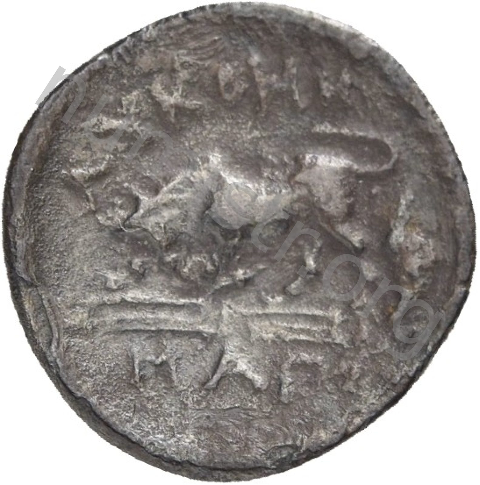 Miğferli klamis (pelerin) ve elinde mızrak tutan bir göğüs zırhı giymiş dörtnala koşan atlı; altında yargıcın adı ve bazen de maeander deseni yazılı.