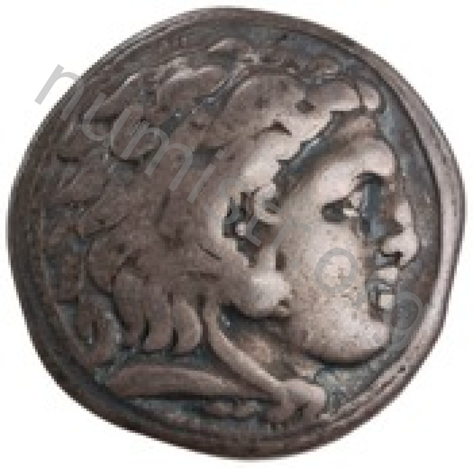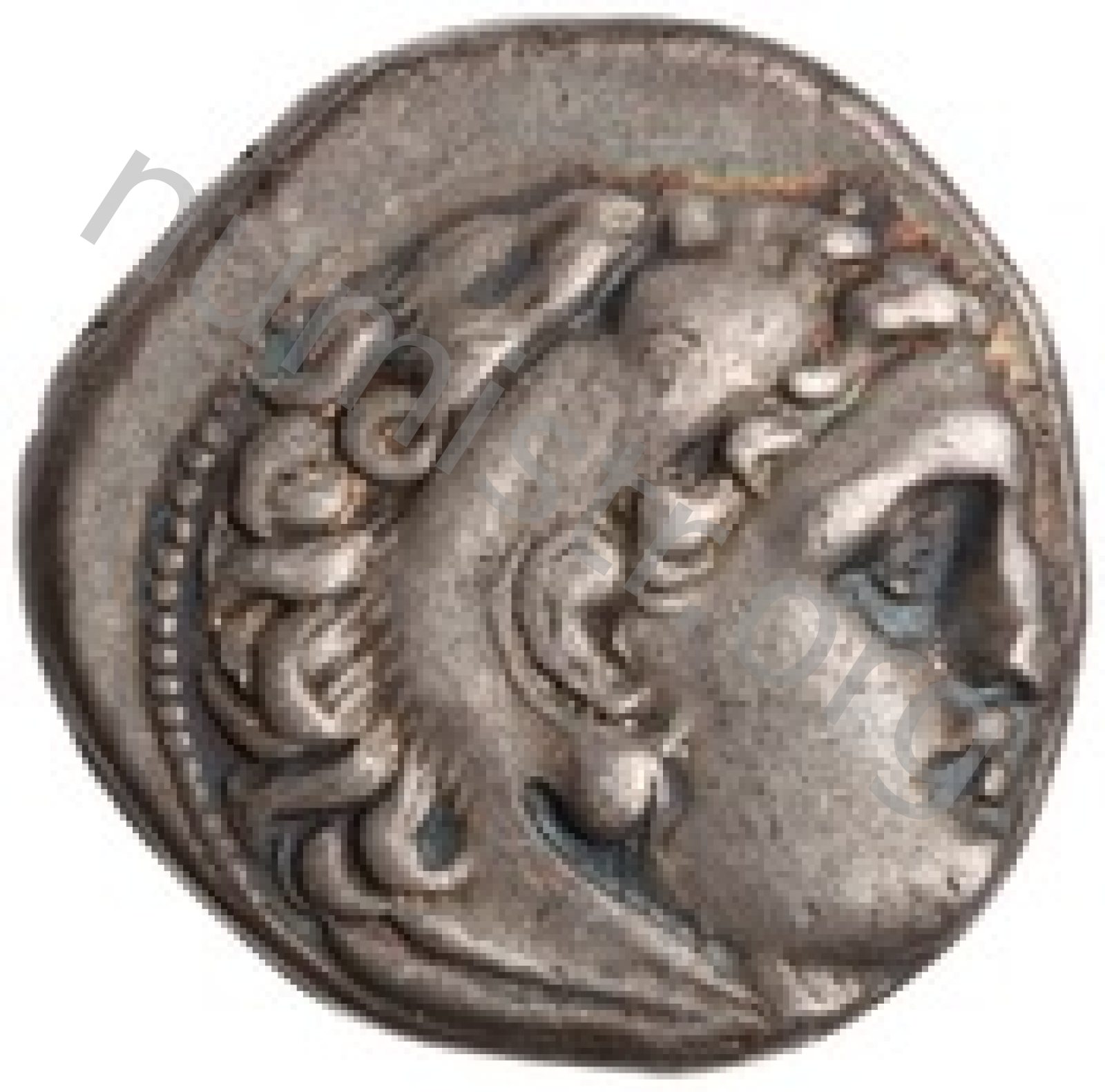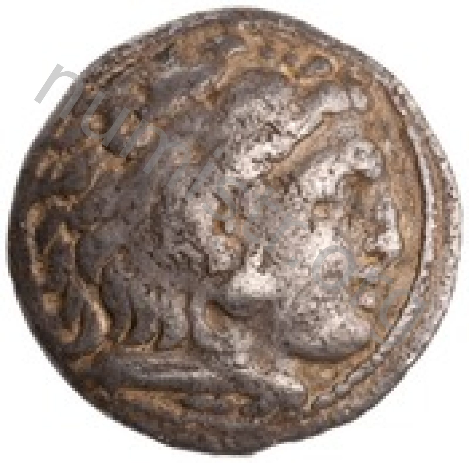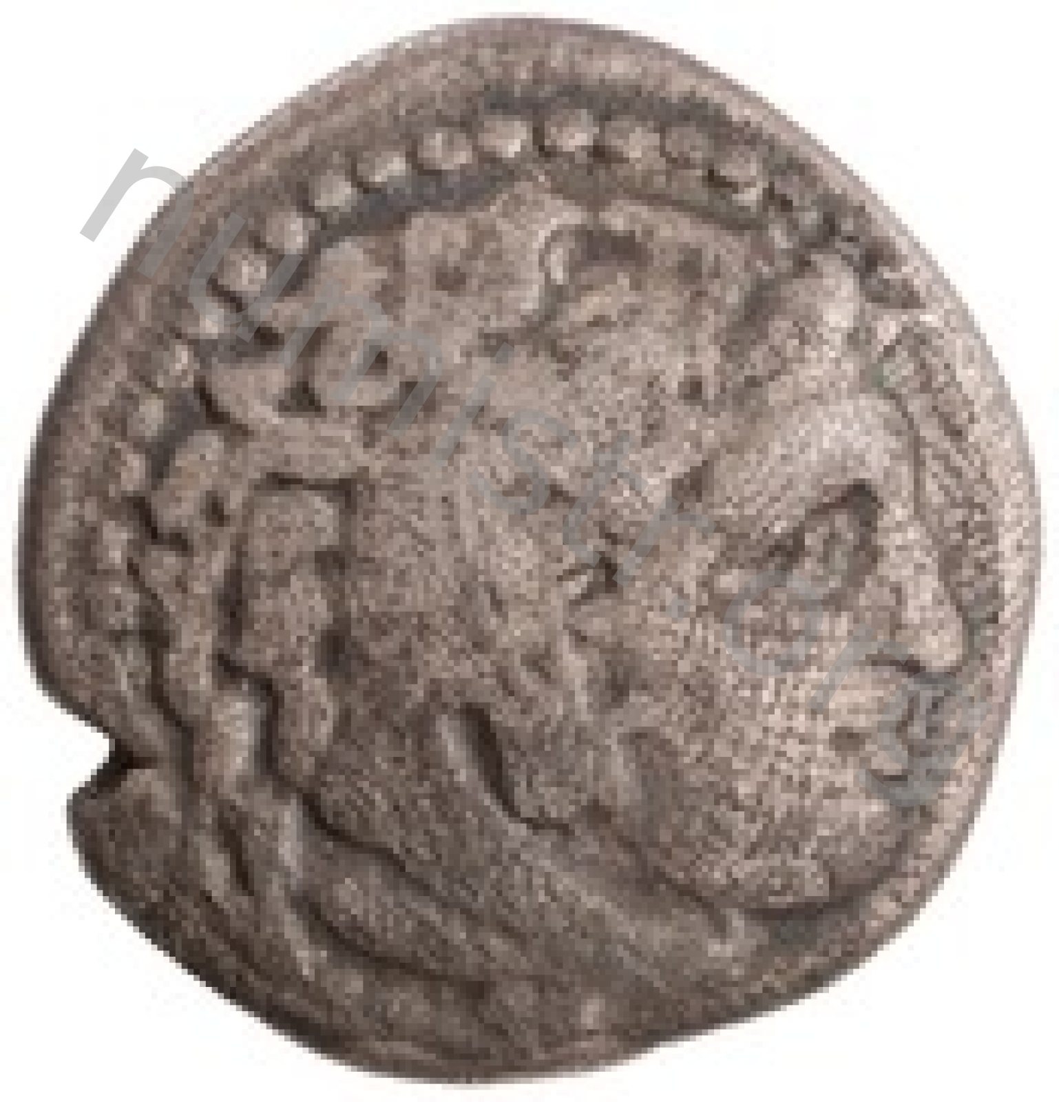 Head of beardless Heracles right wearing lion skin headdress -[en]