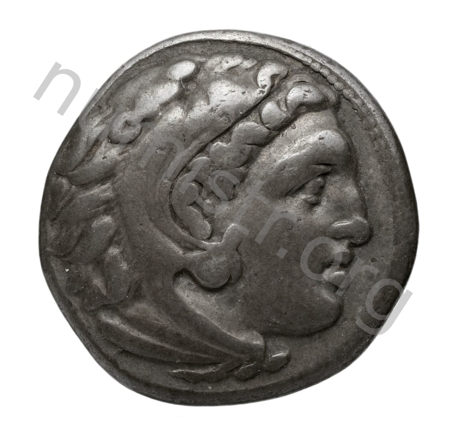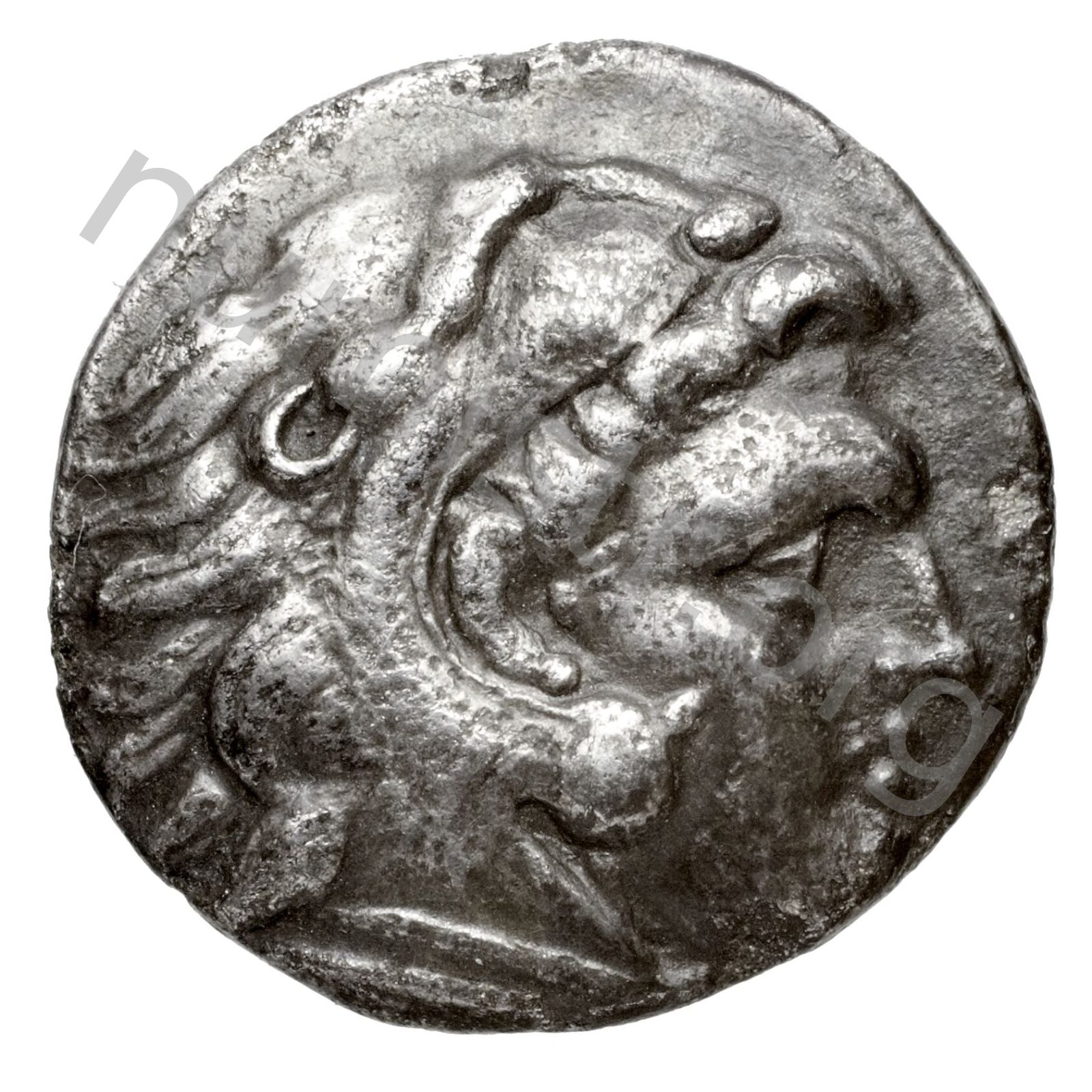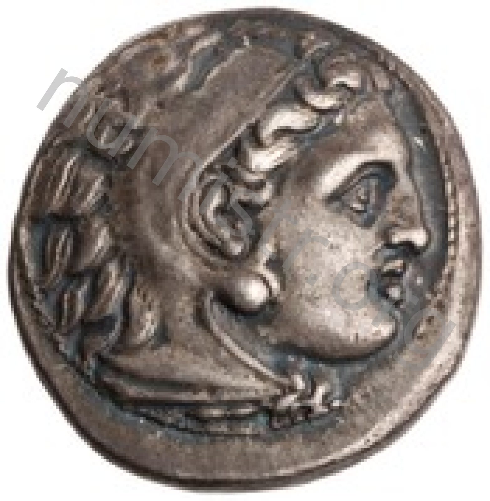 Head of beardless Heracles right wearing lion skin headdress -[en]