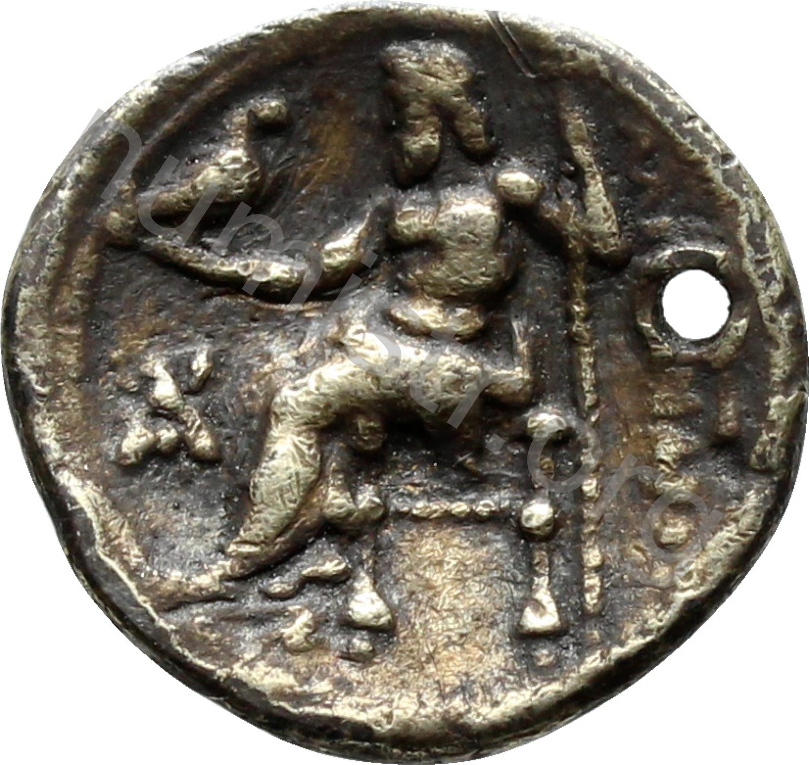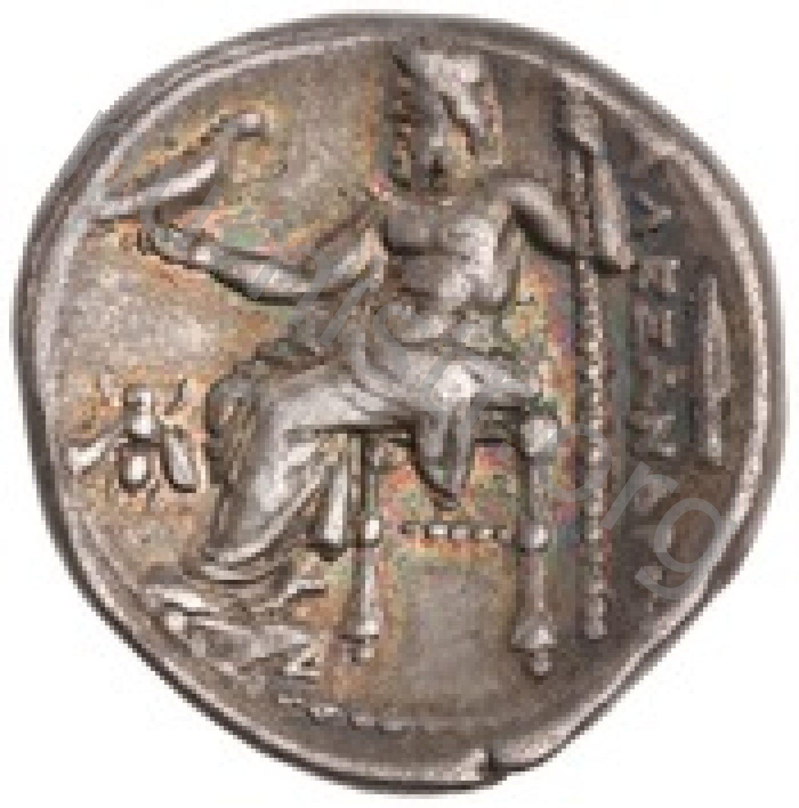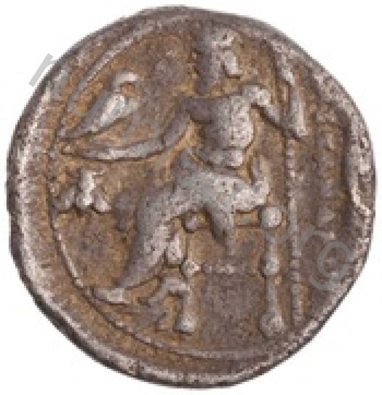 Zeus tabure-tahtta oturuyor sol elinde kartal sağ elinde asa var.