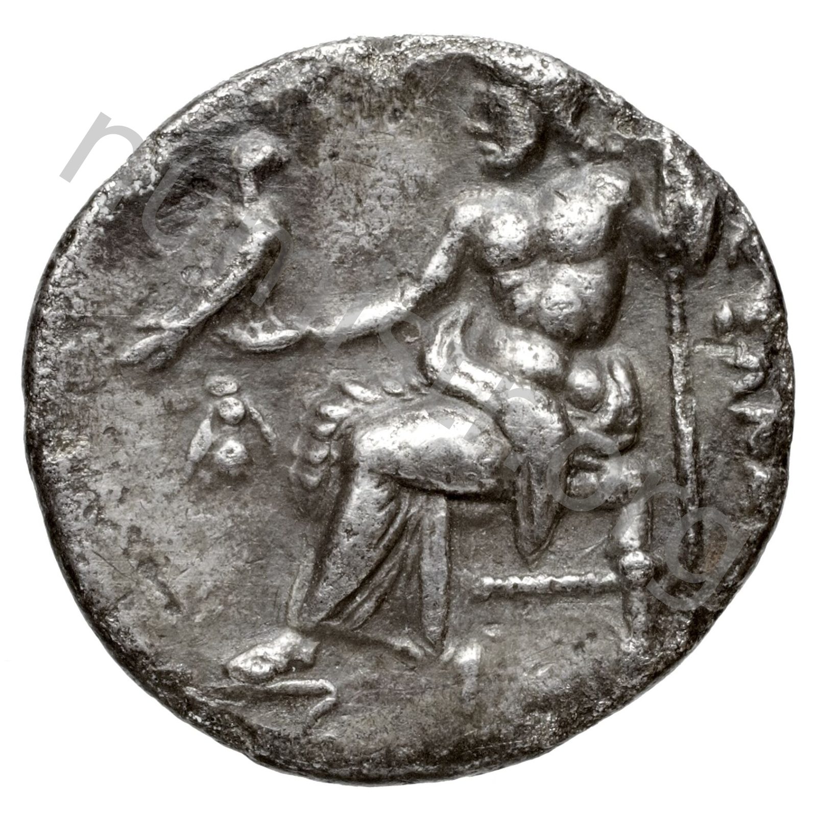 Zeus seated on stool-throne left eagle on outstretched right hand sceptre in left hand -[en]