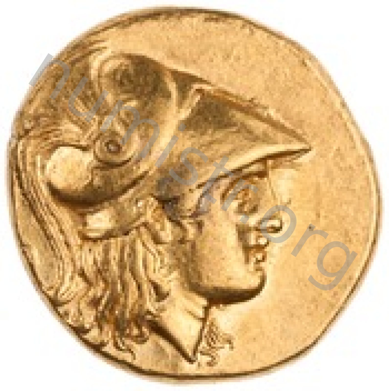Head of Athena right wearing Corinthian helmet with crest -[en]