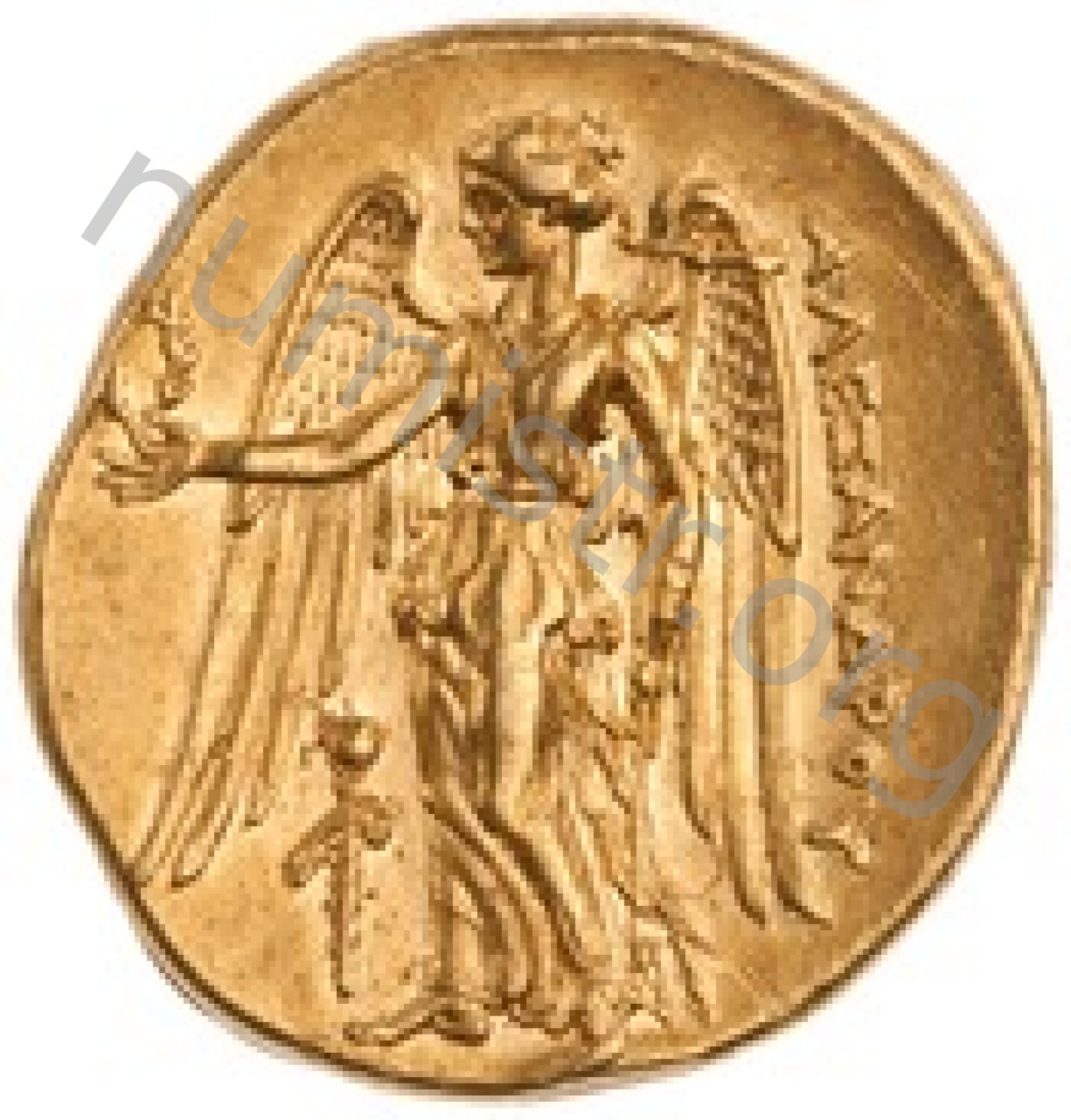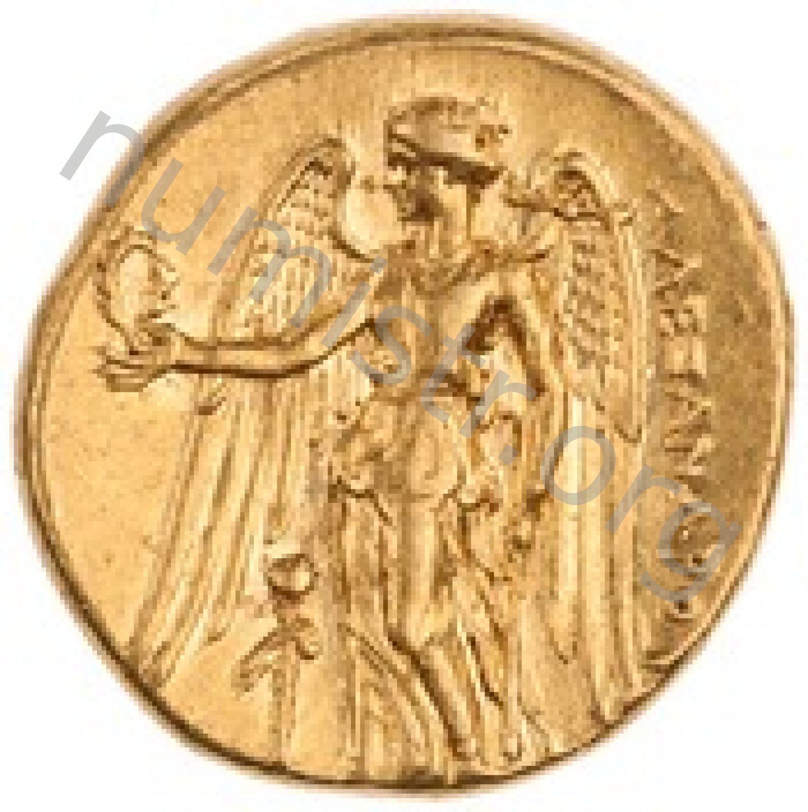 Nike standing left holding wreath in right hand and stylis in her left hand -[en]
