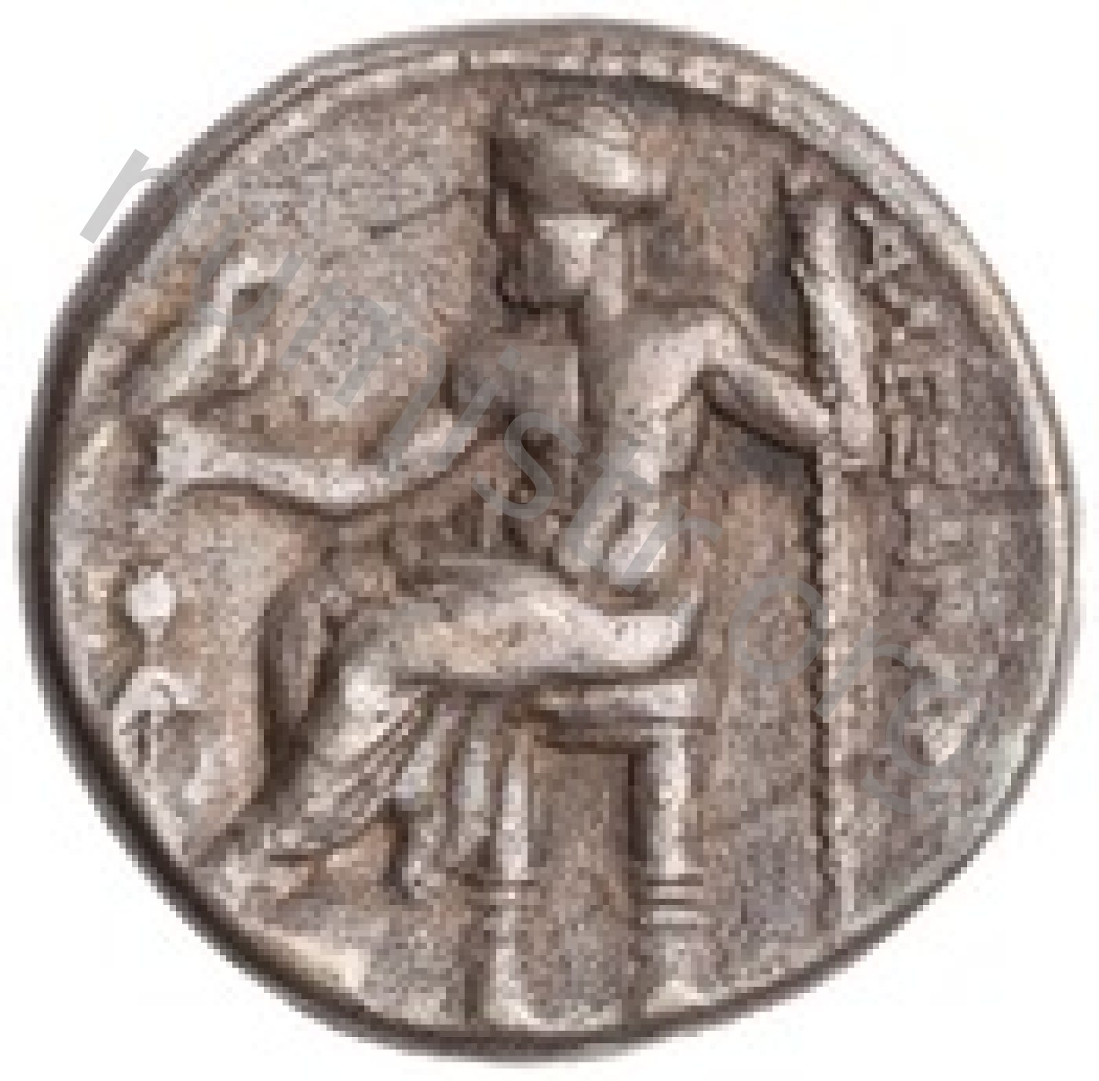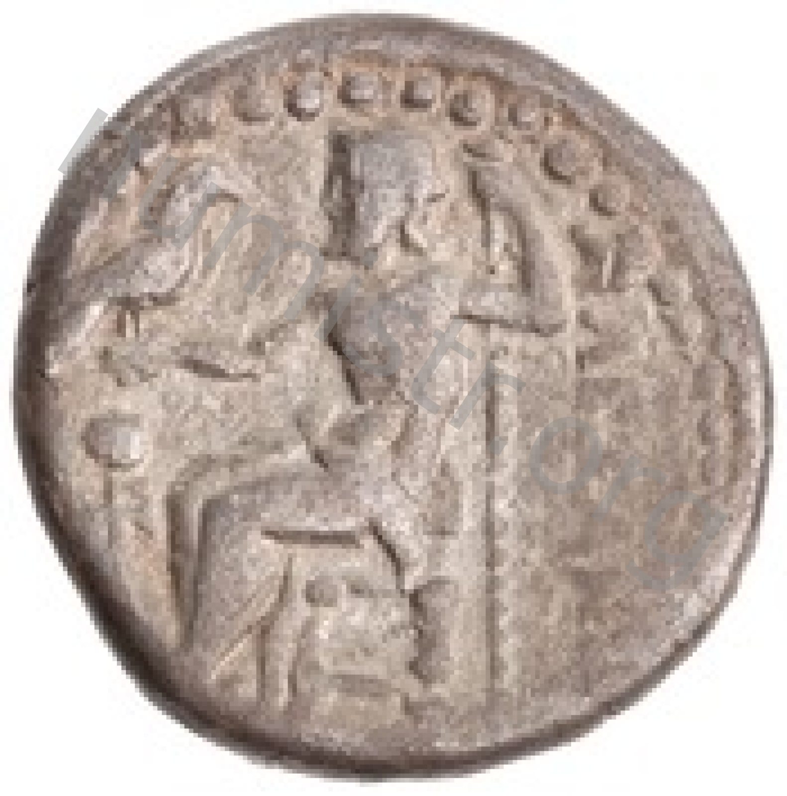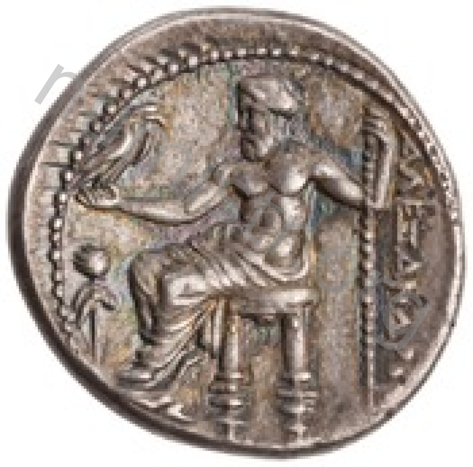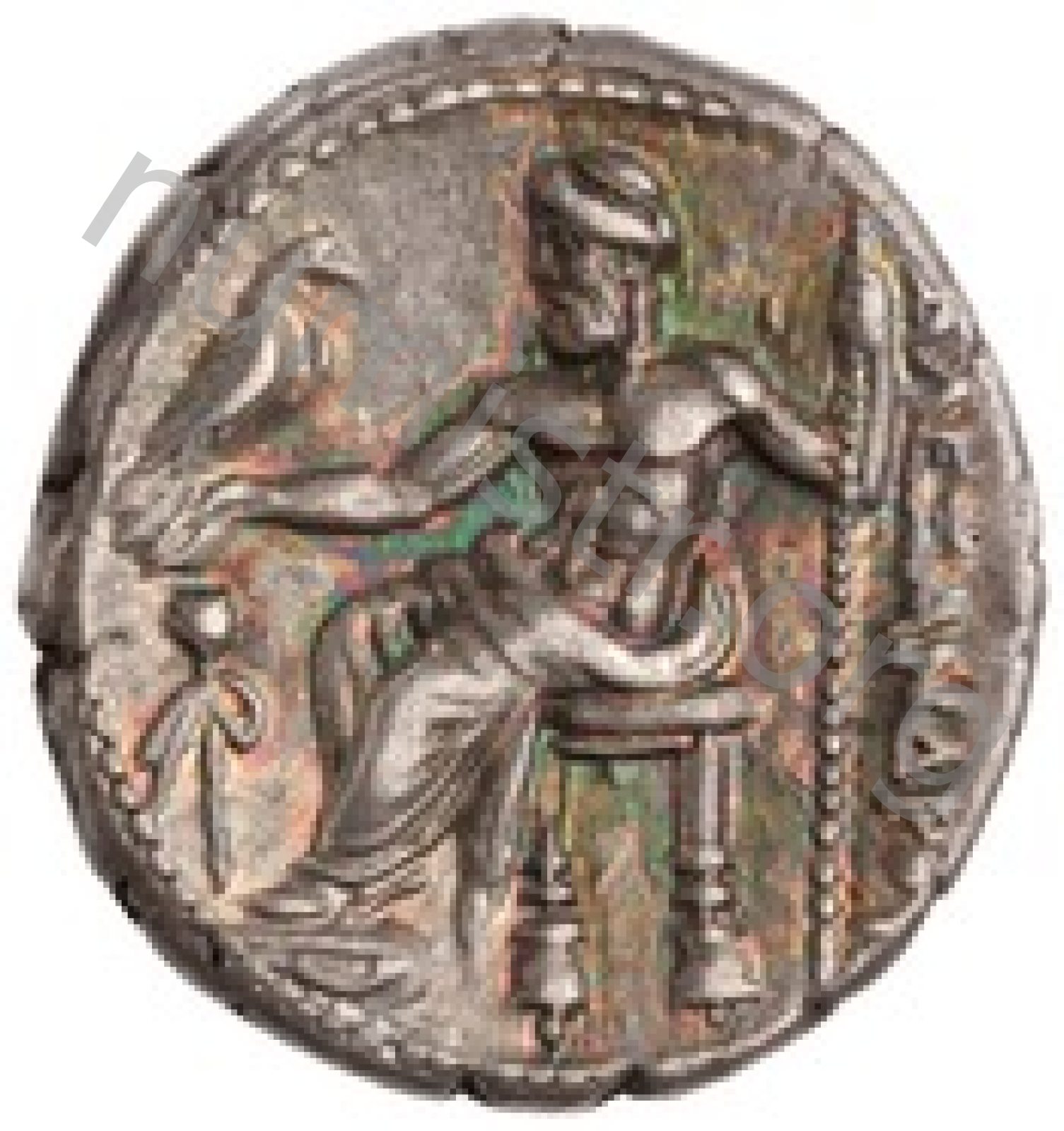 Zeus tabure-tahtta oturuyor sol elinde kartal sağ elinde asa var.