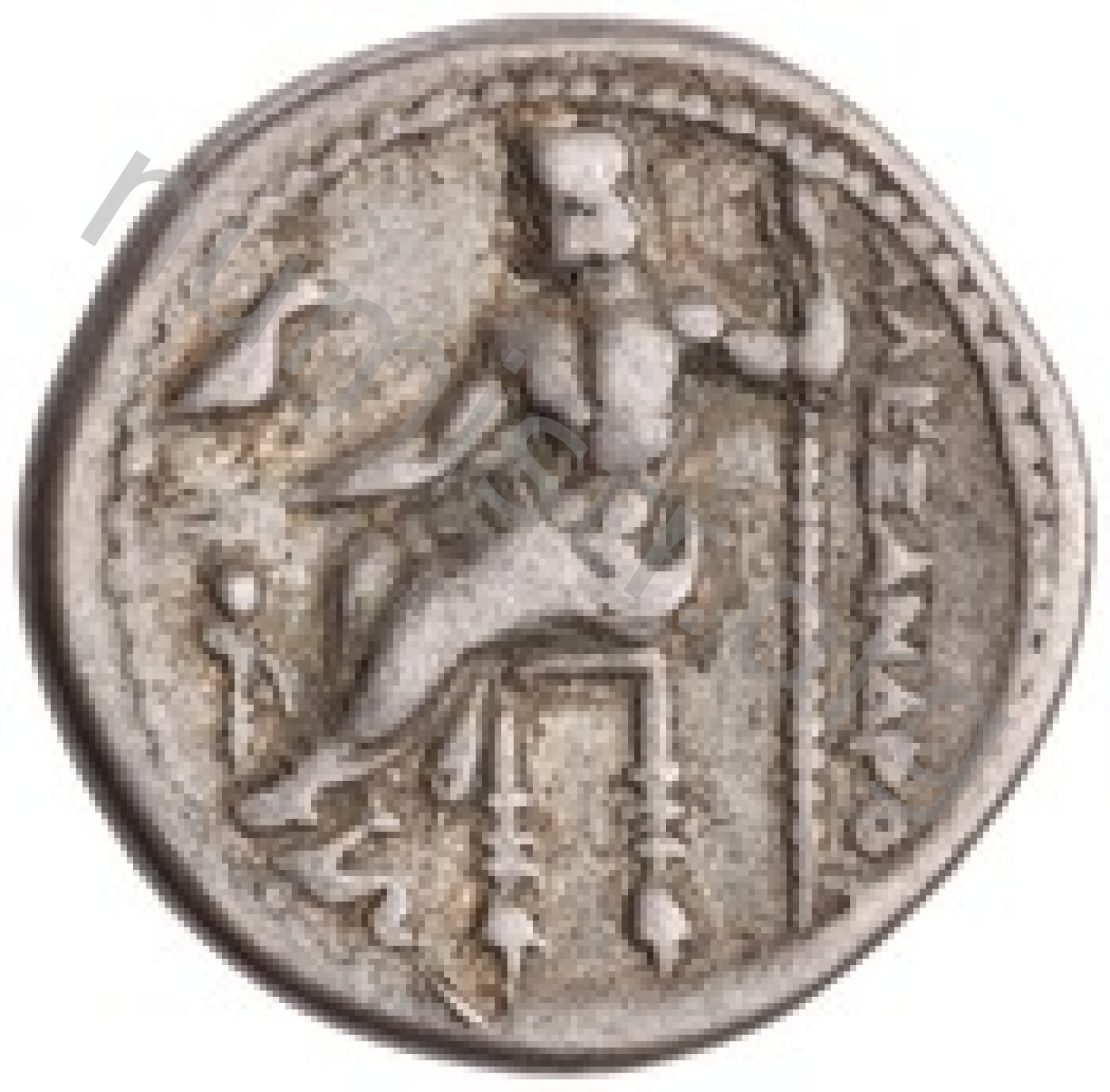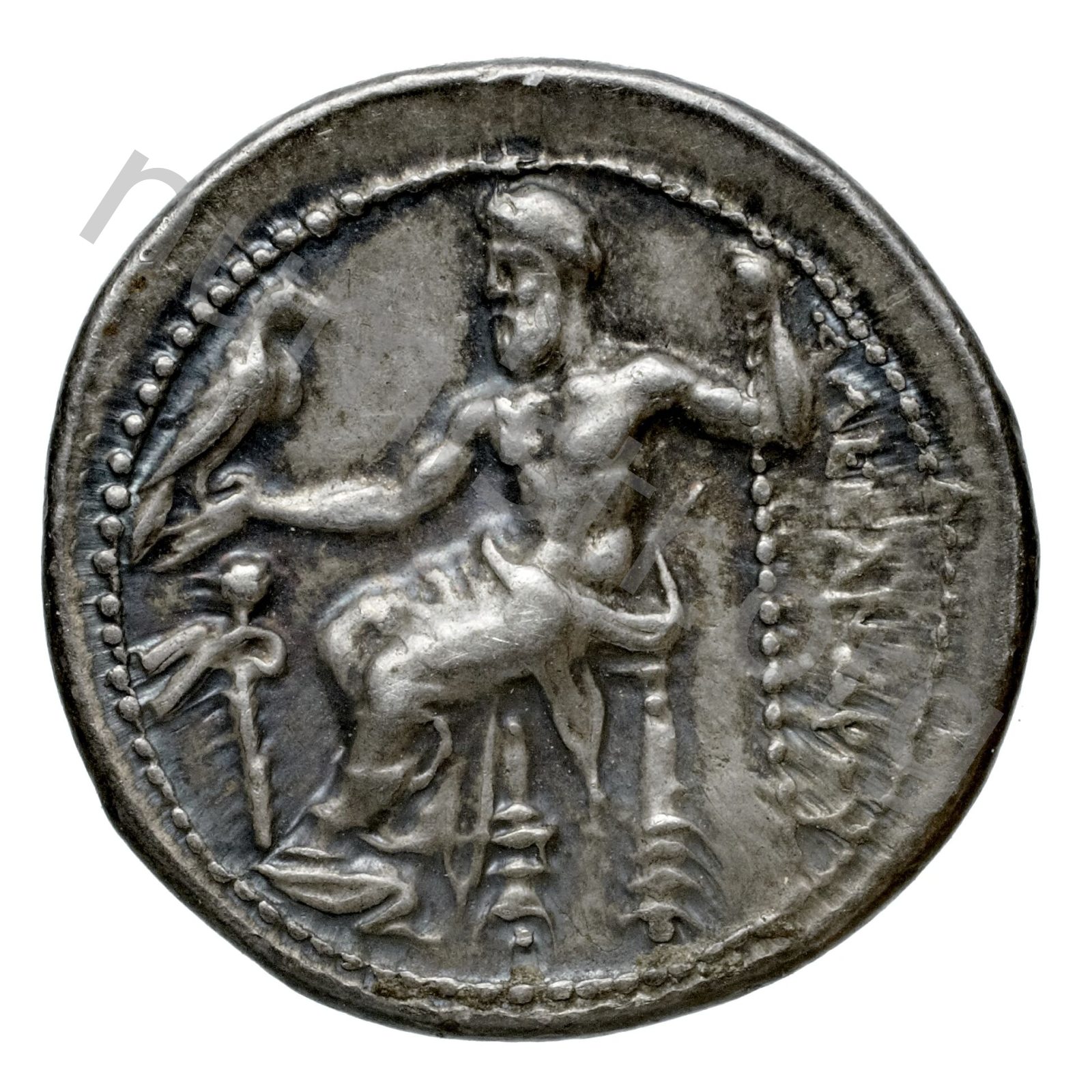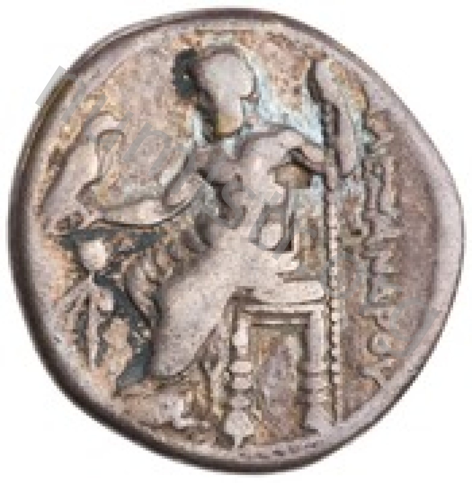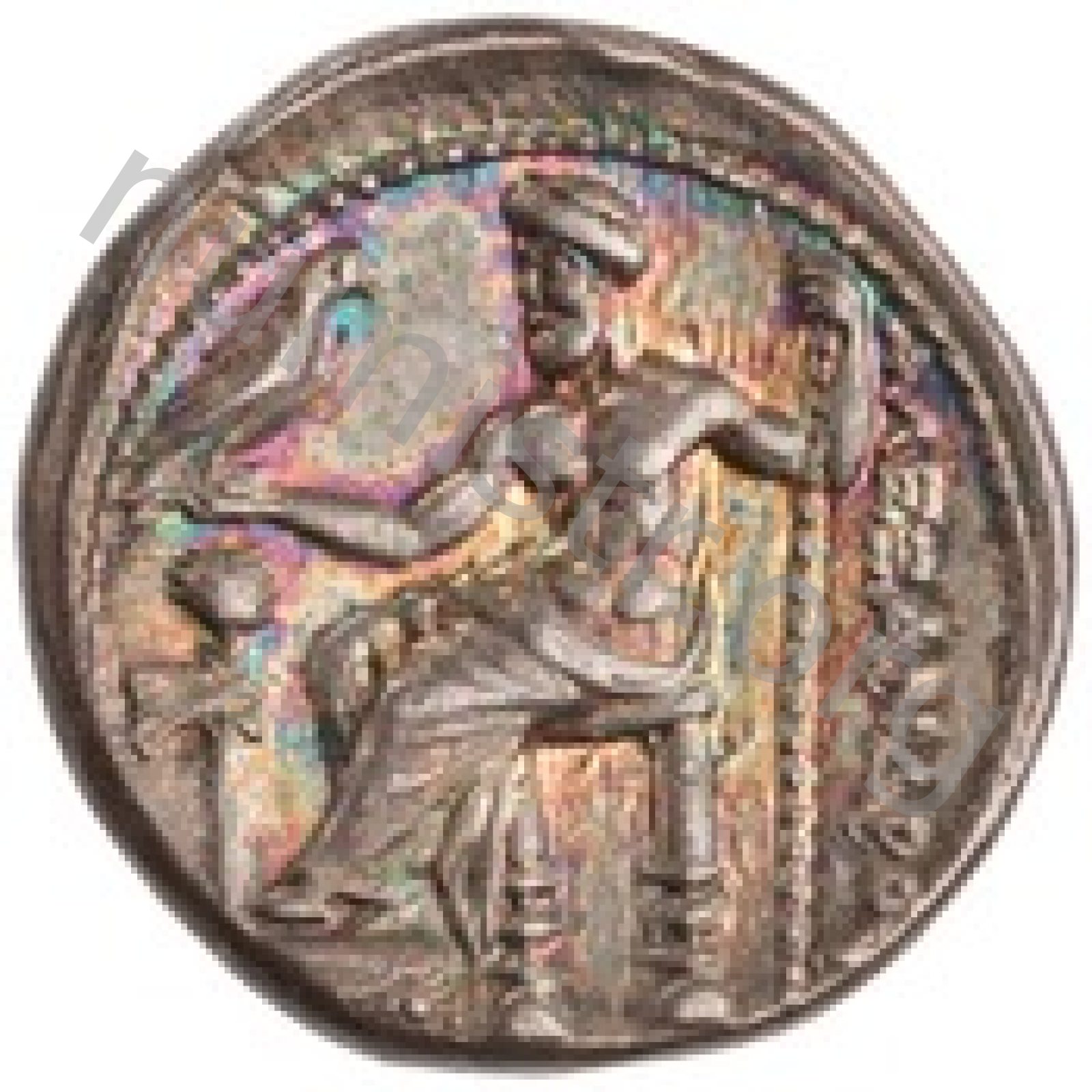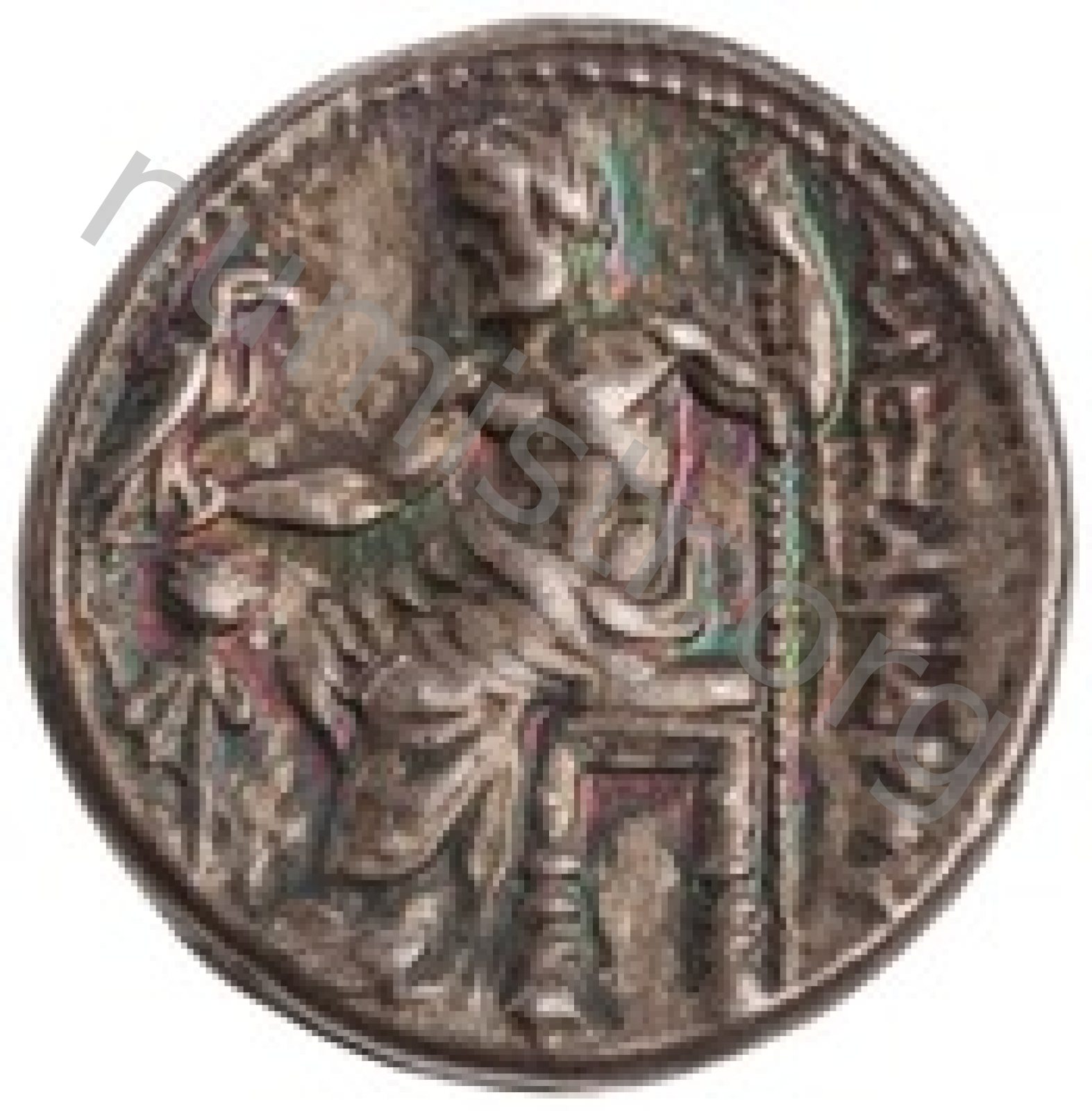 Zeus tabure-tahtta oturuyor sol elinde kartal sağ elinde asa var.
