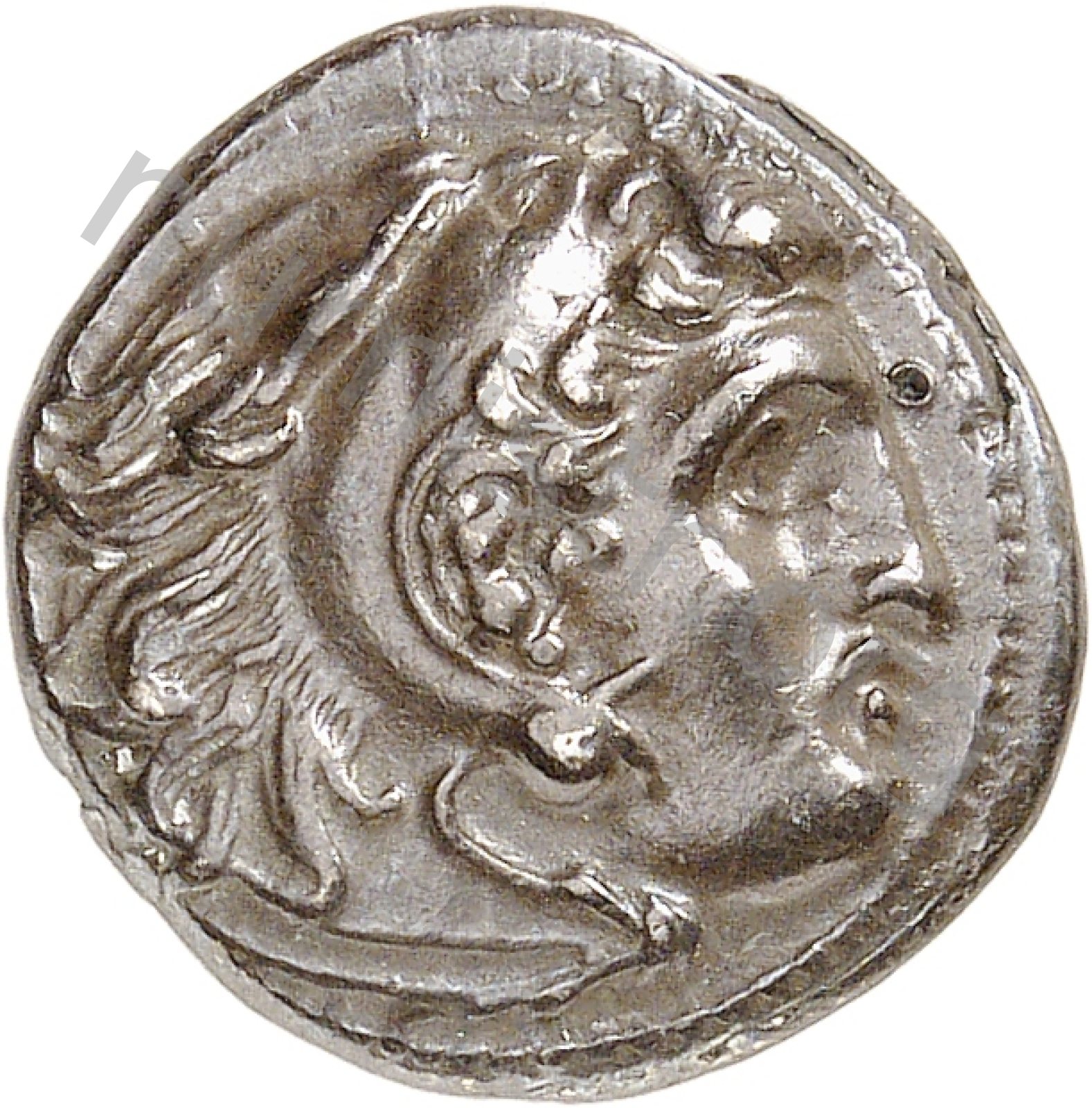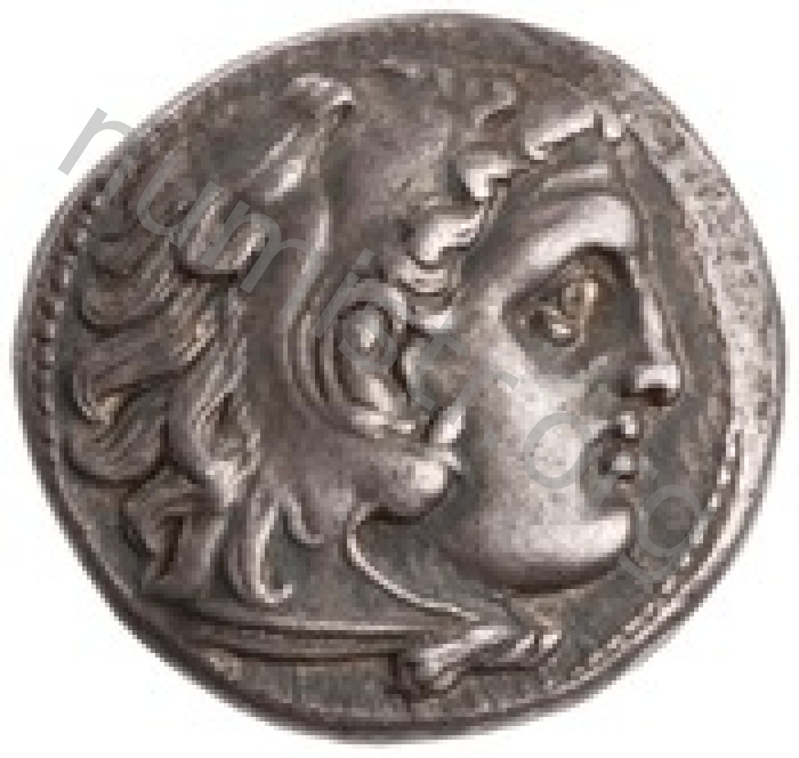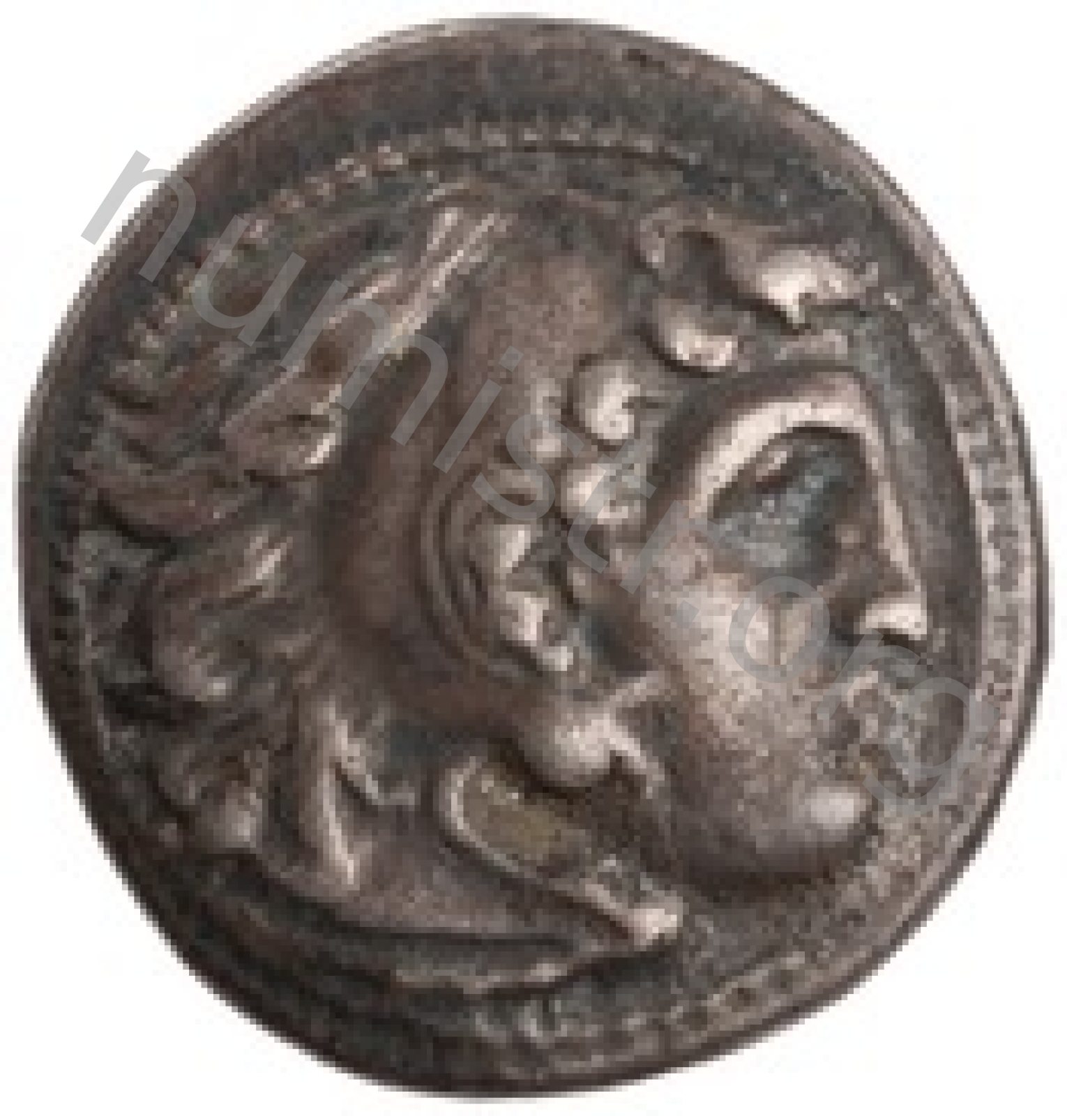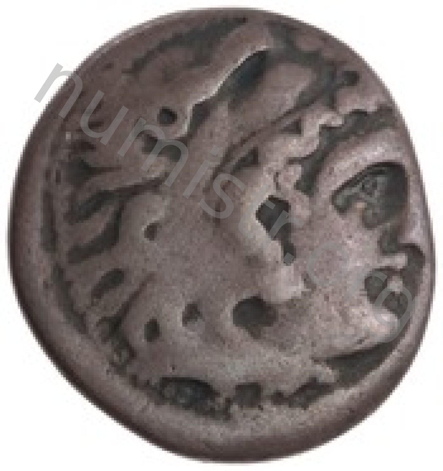 Head of beardless Heracles right wearing lion skin headdress -[en]