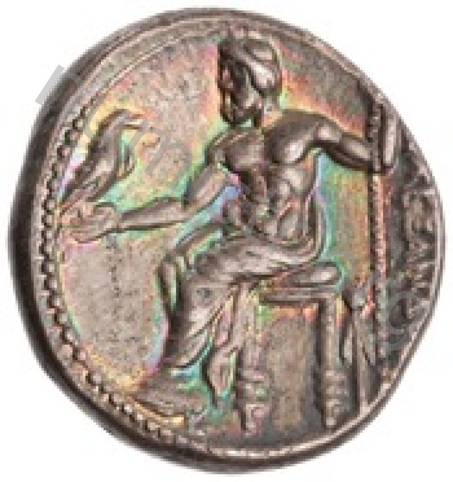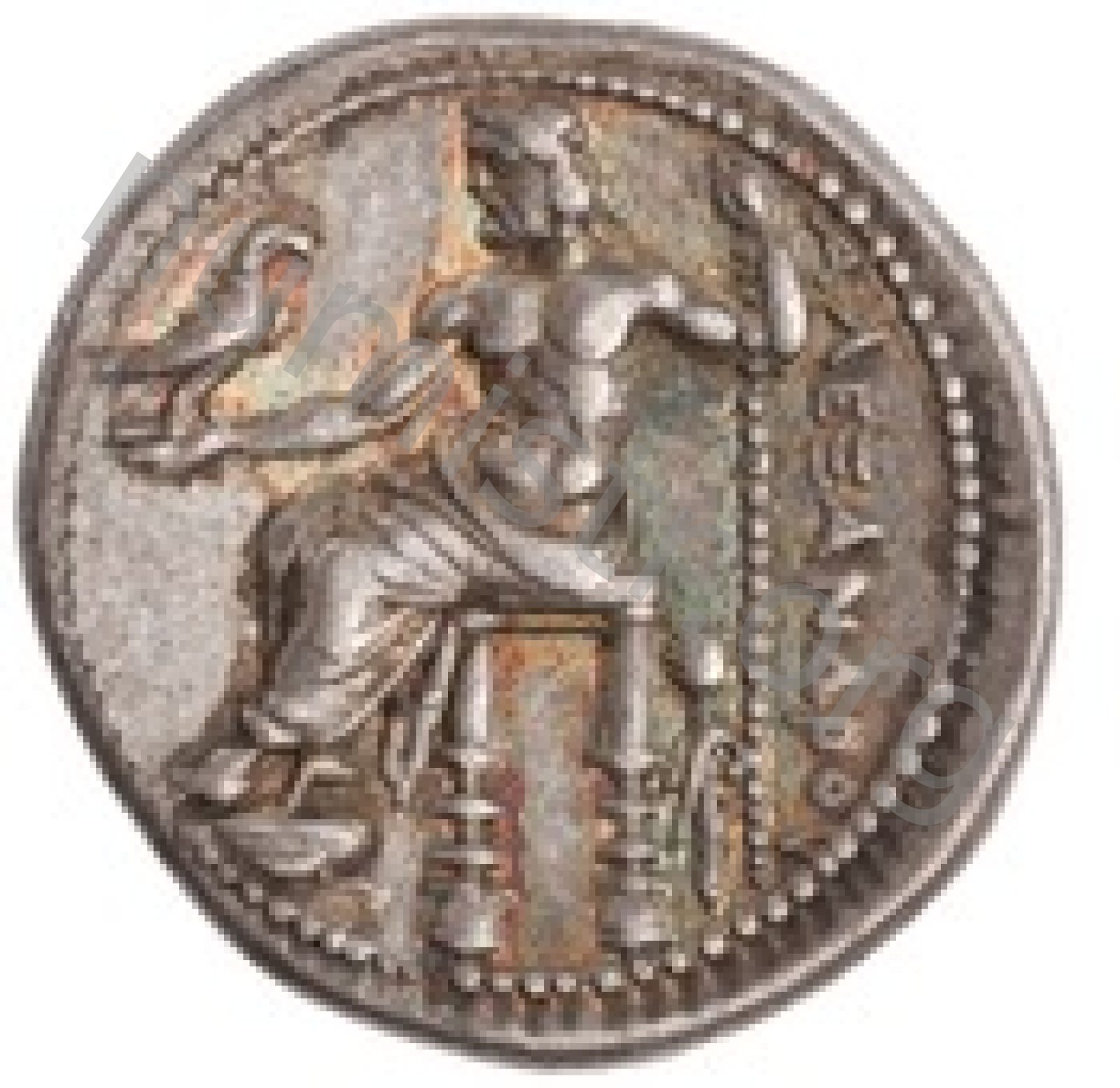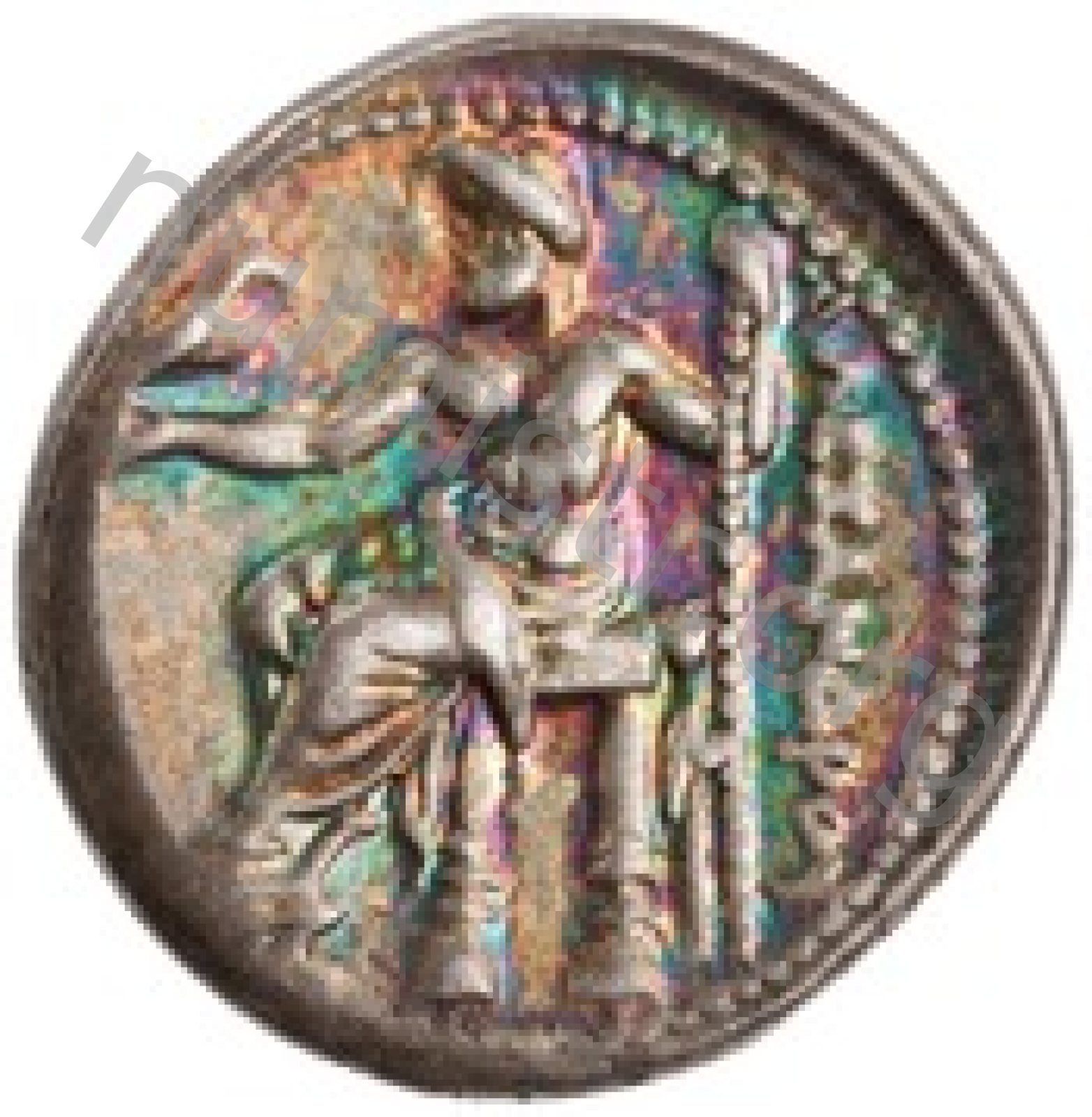 Zeus tabure-tahtta oturuyor sol elinde kartal sağ elinde asa var.
