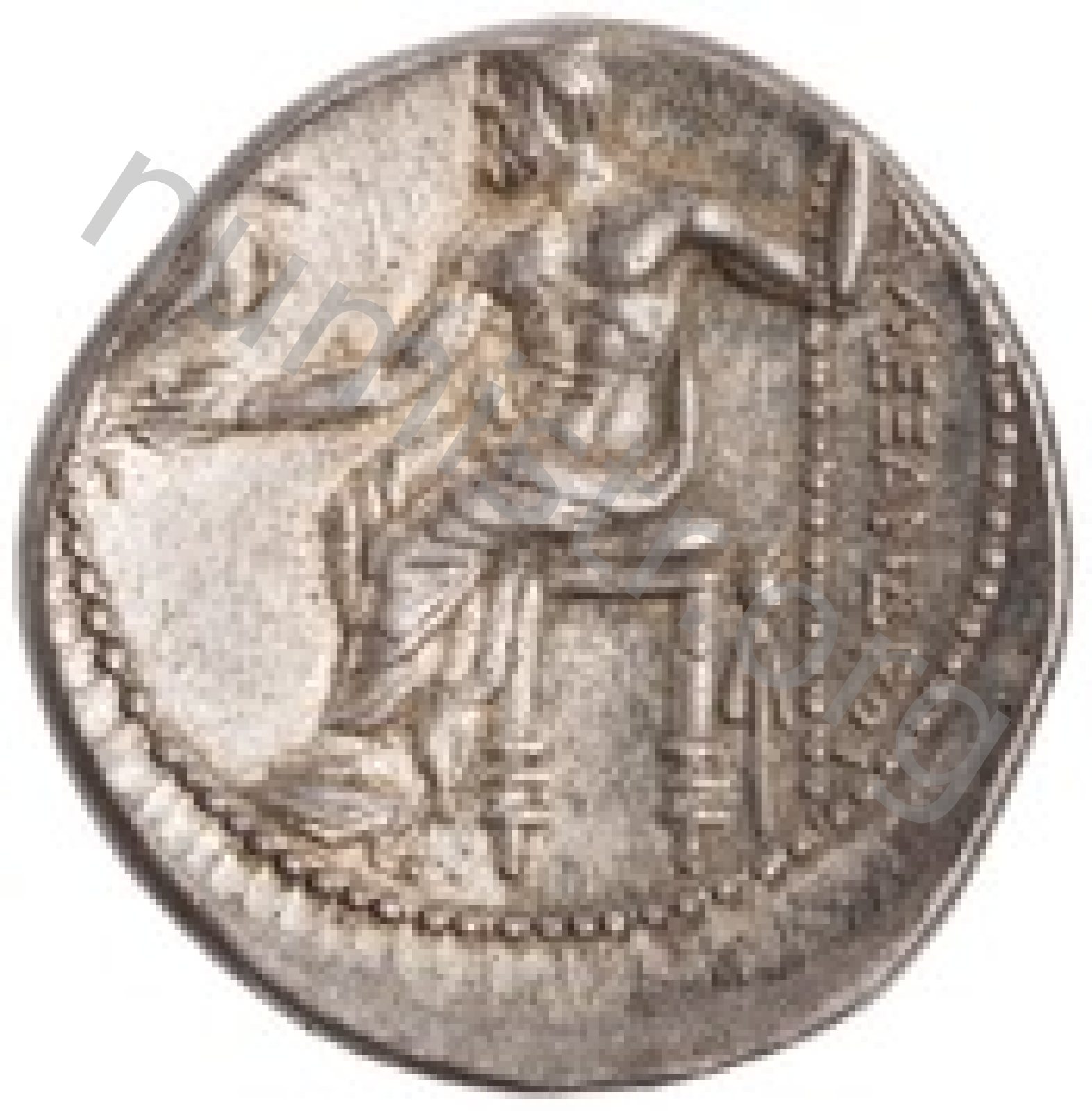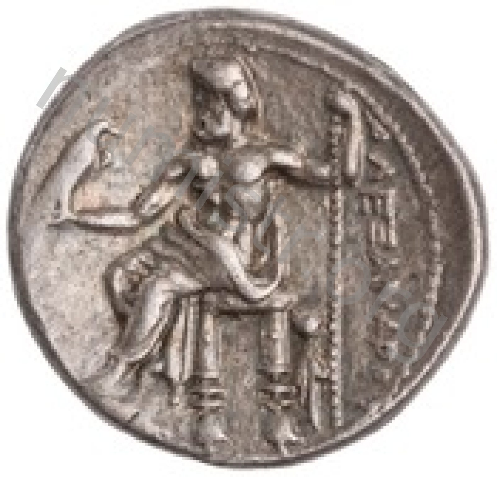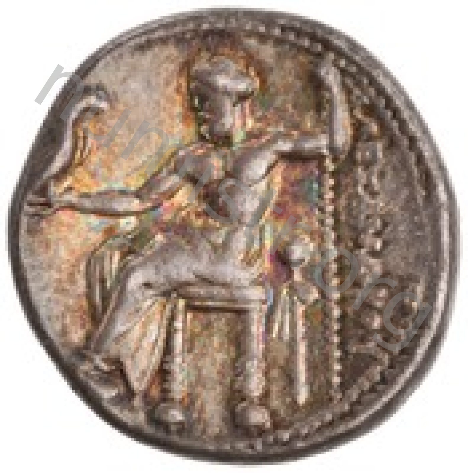 Zeus seated on stool-throne left eagle on outstretched right hand sceptre in left hand -[en]