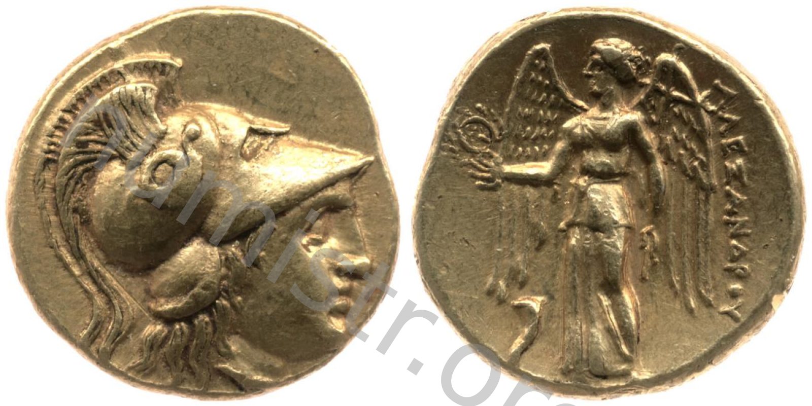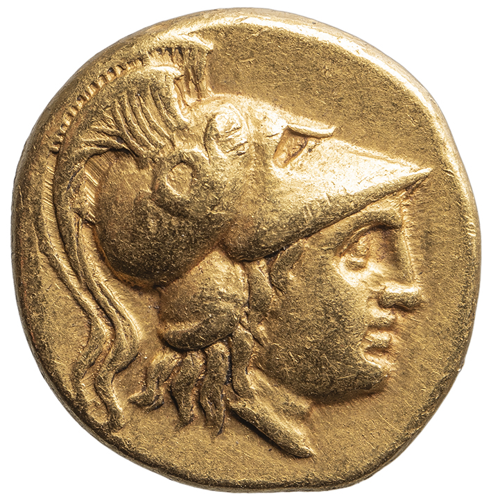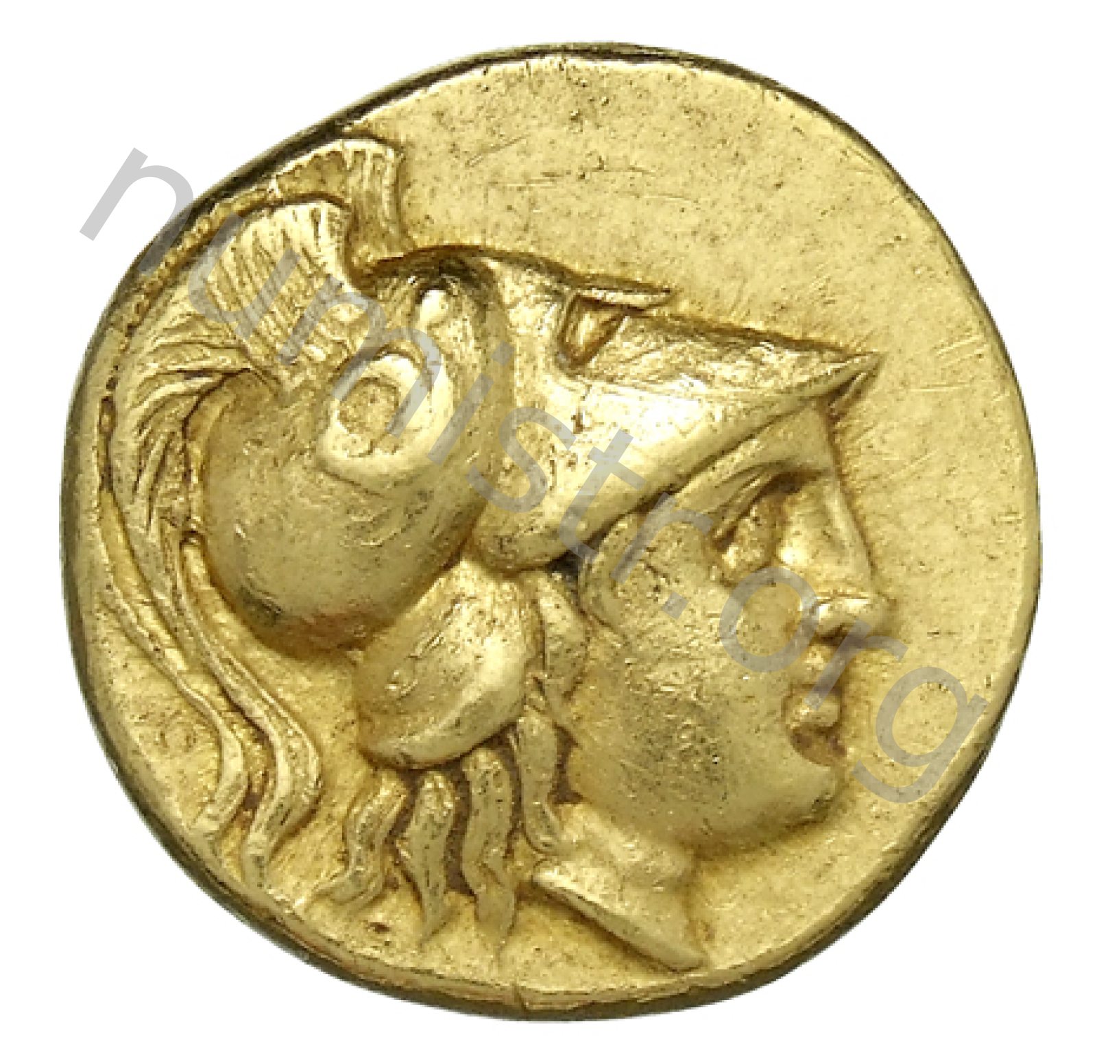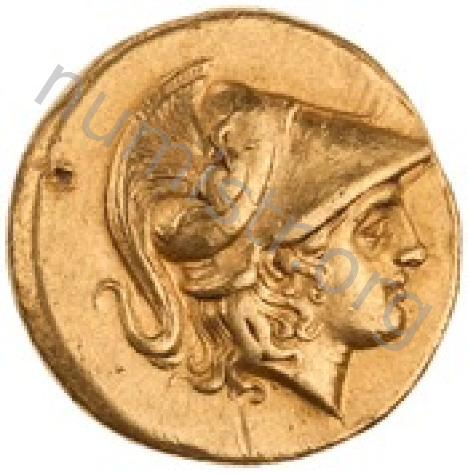 Head of Athena right wearing Corinthian helmet with crest -[en]