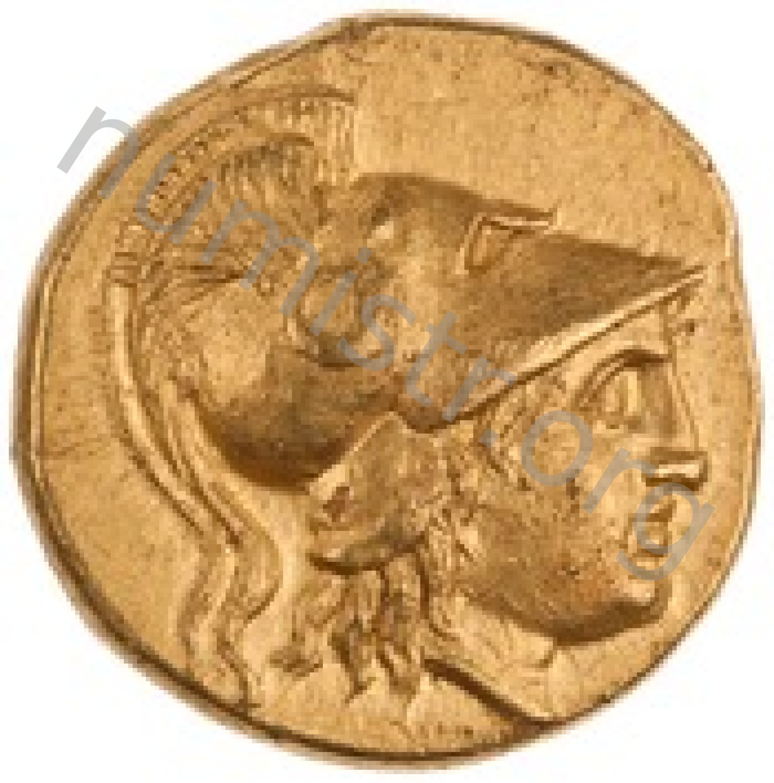 Head of Athena right wearing Corinthian helmet with crest -[en]