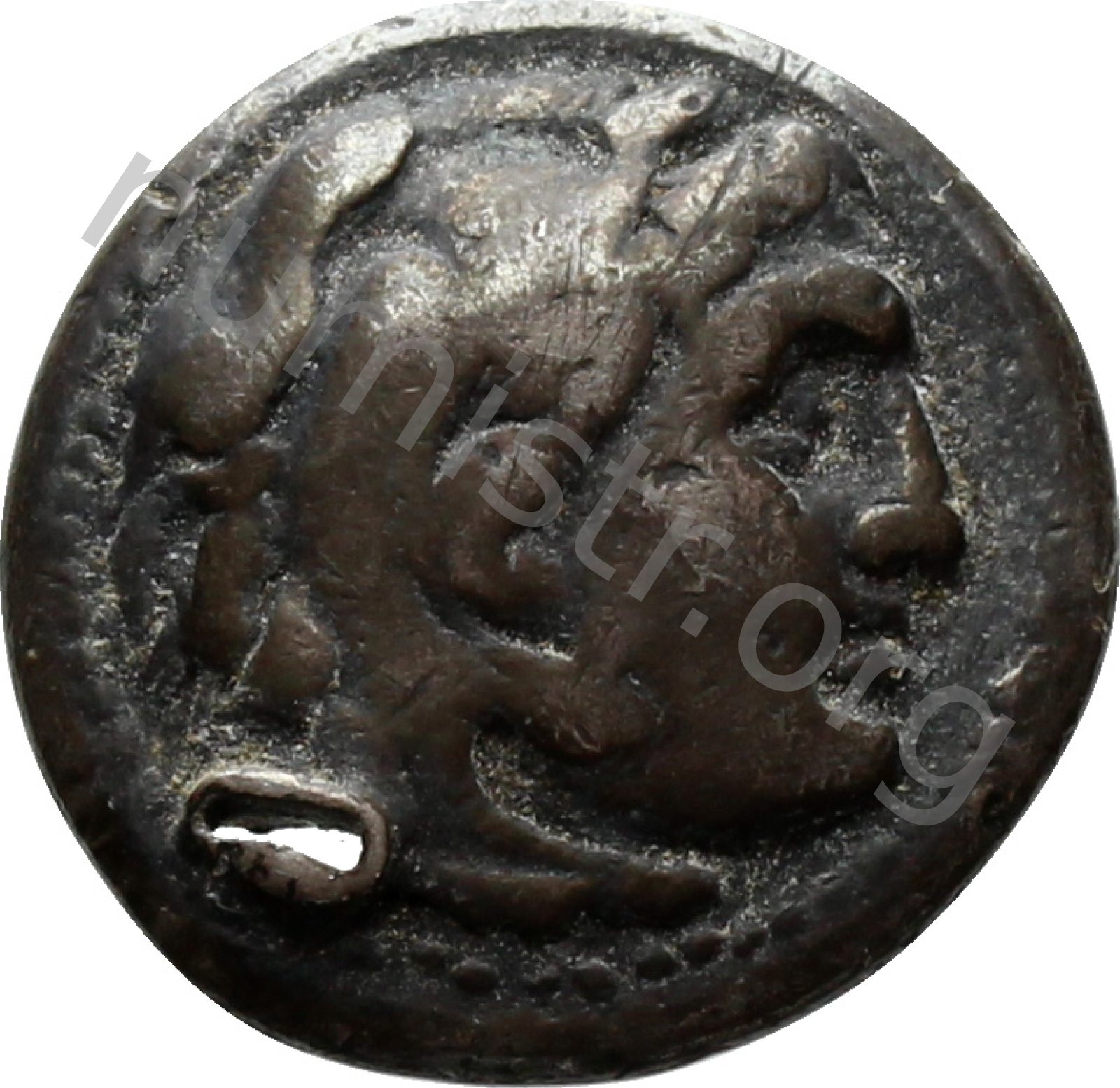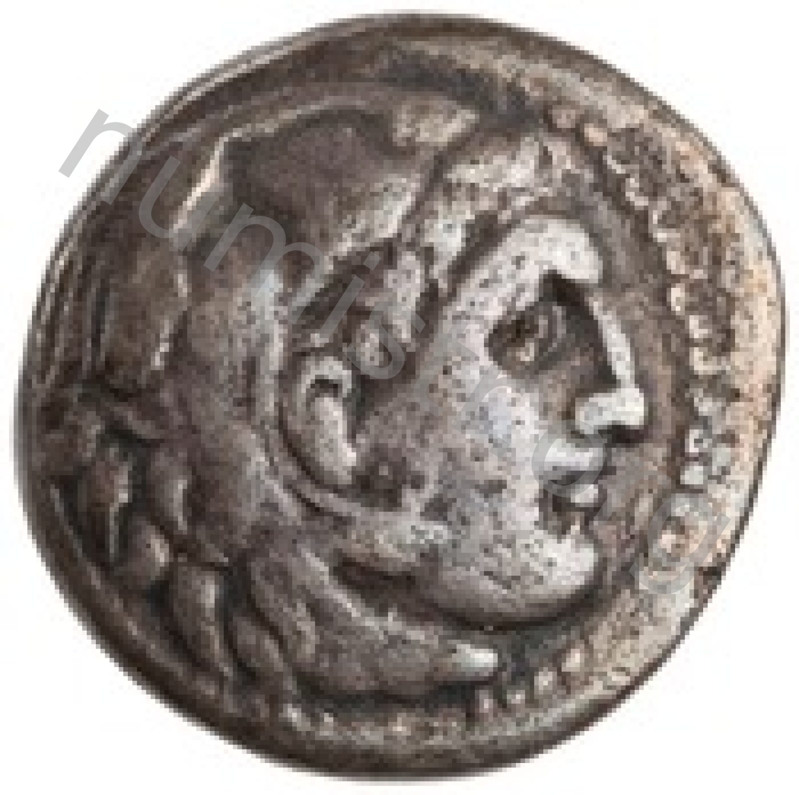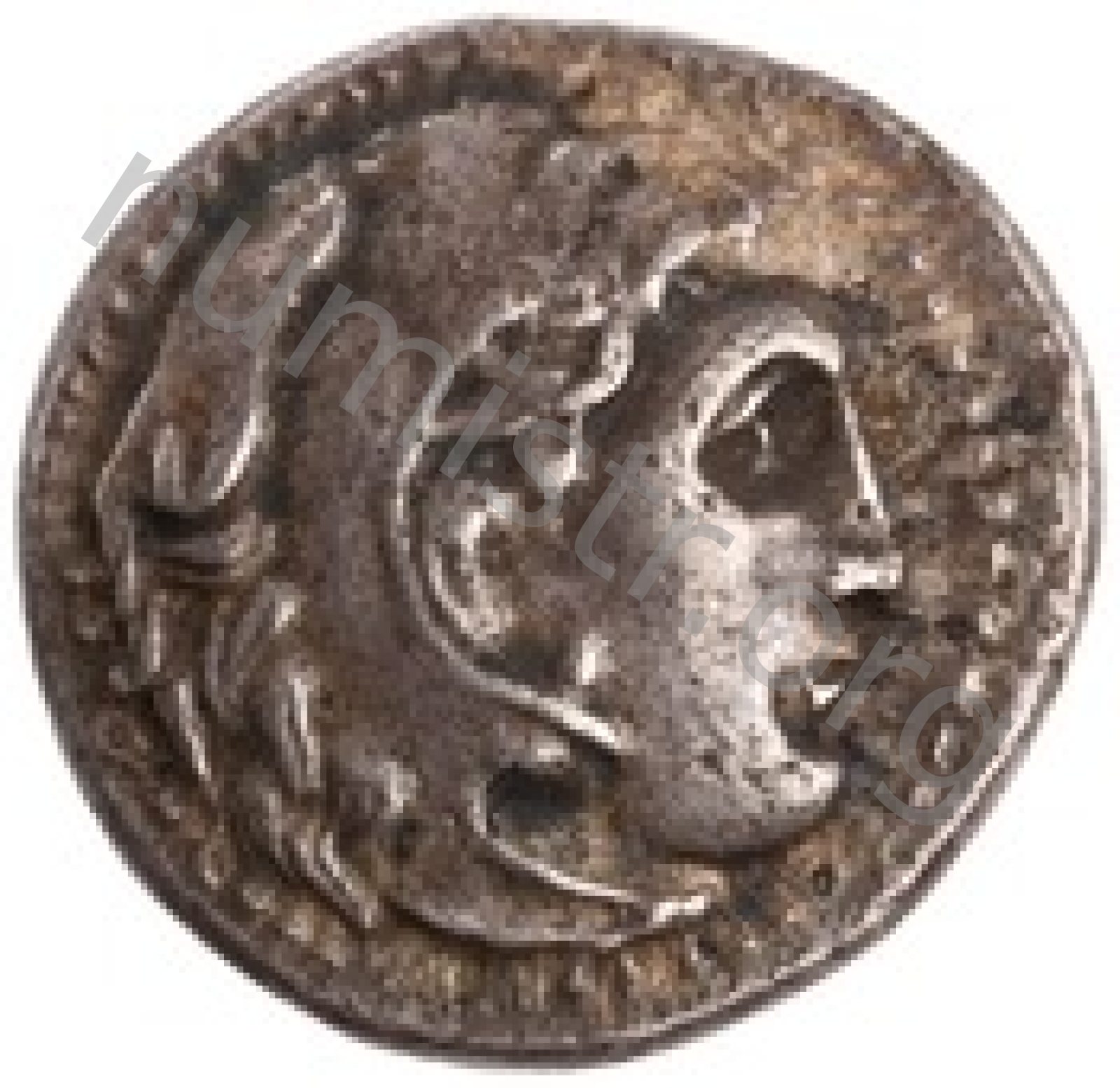 Head of beardless Heracles right wearing lion skin headdress -[en]