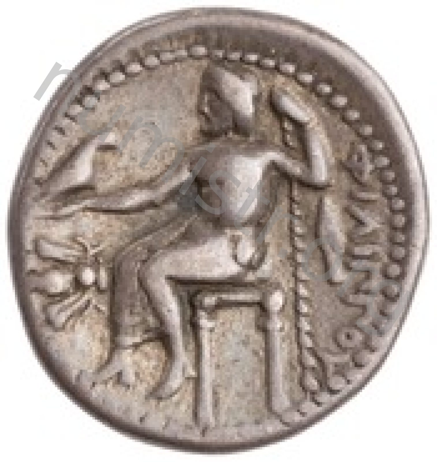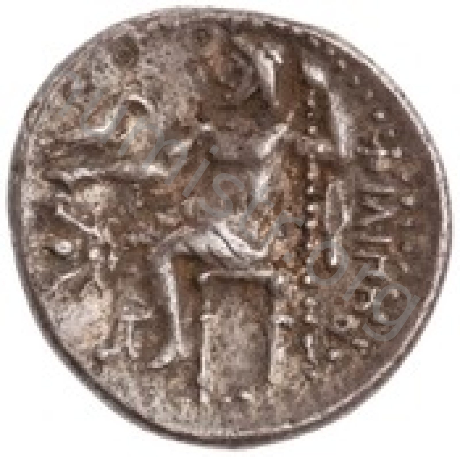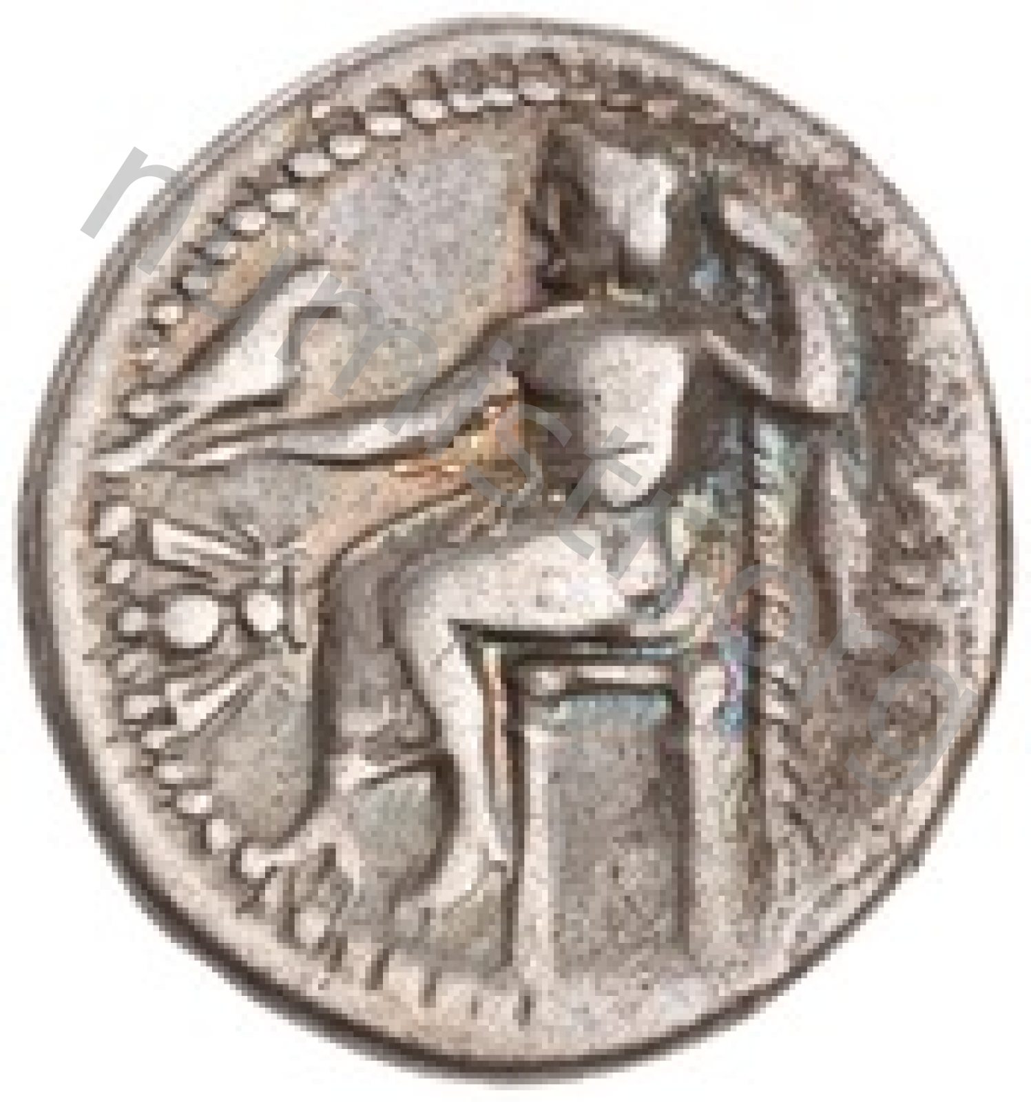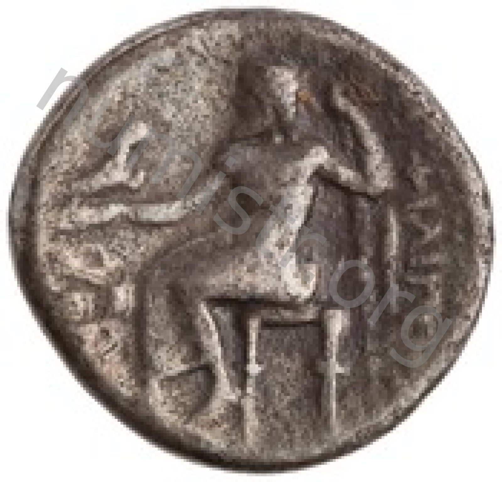 Zeus seated on stool-throne left eagle on outstretched right hand sceptre in left hand -[en]
