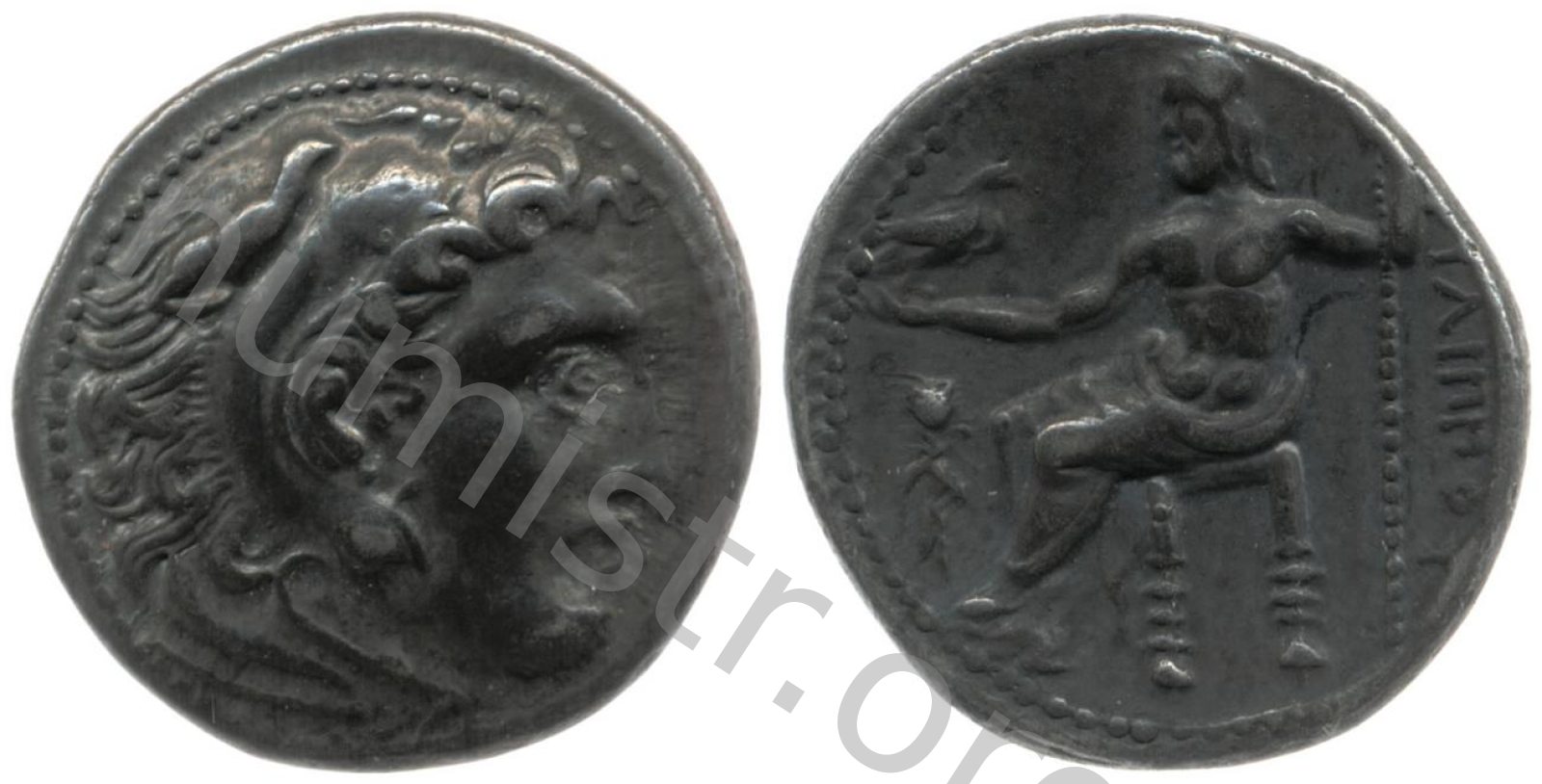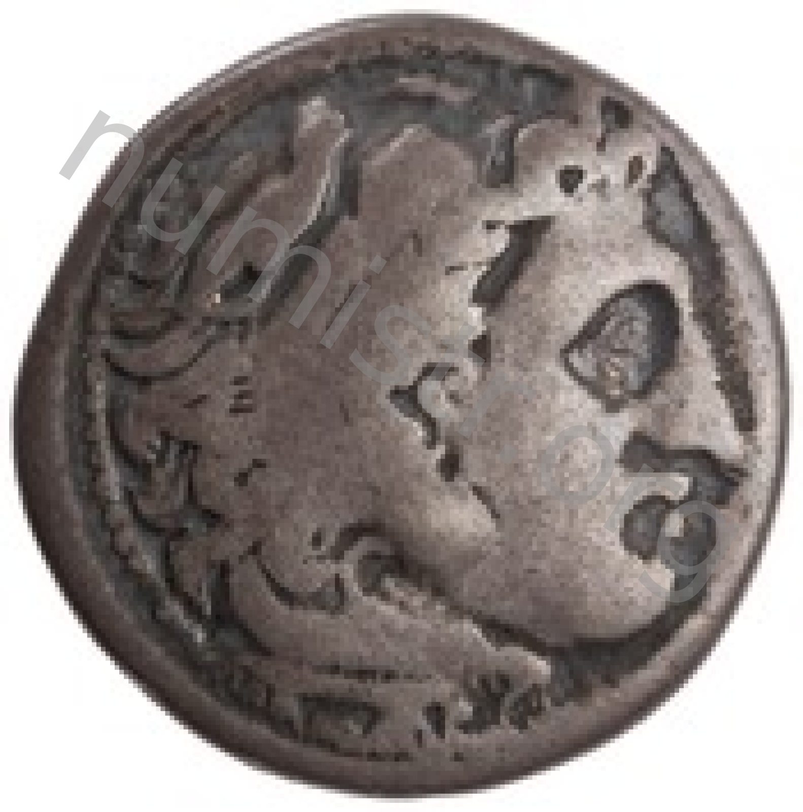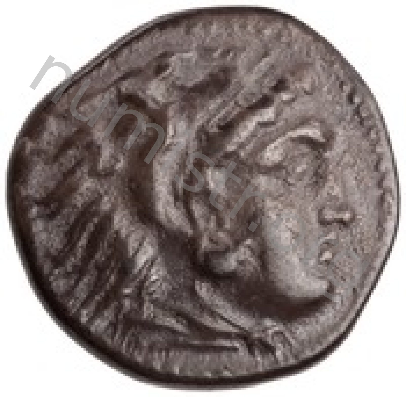 Head of beardless Heracles right wearing lion skin headdress -[en]