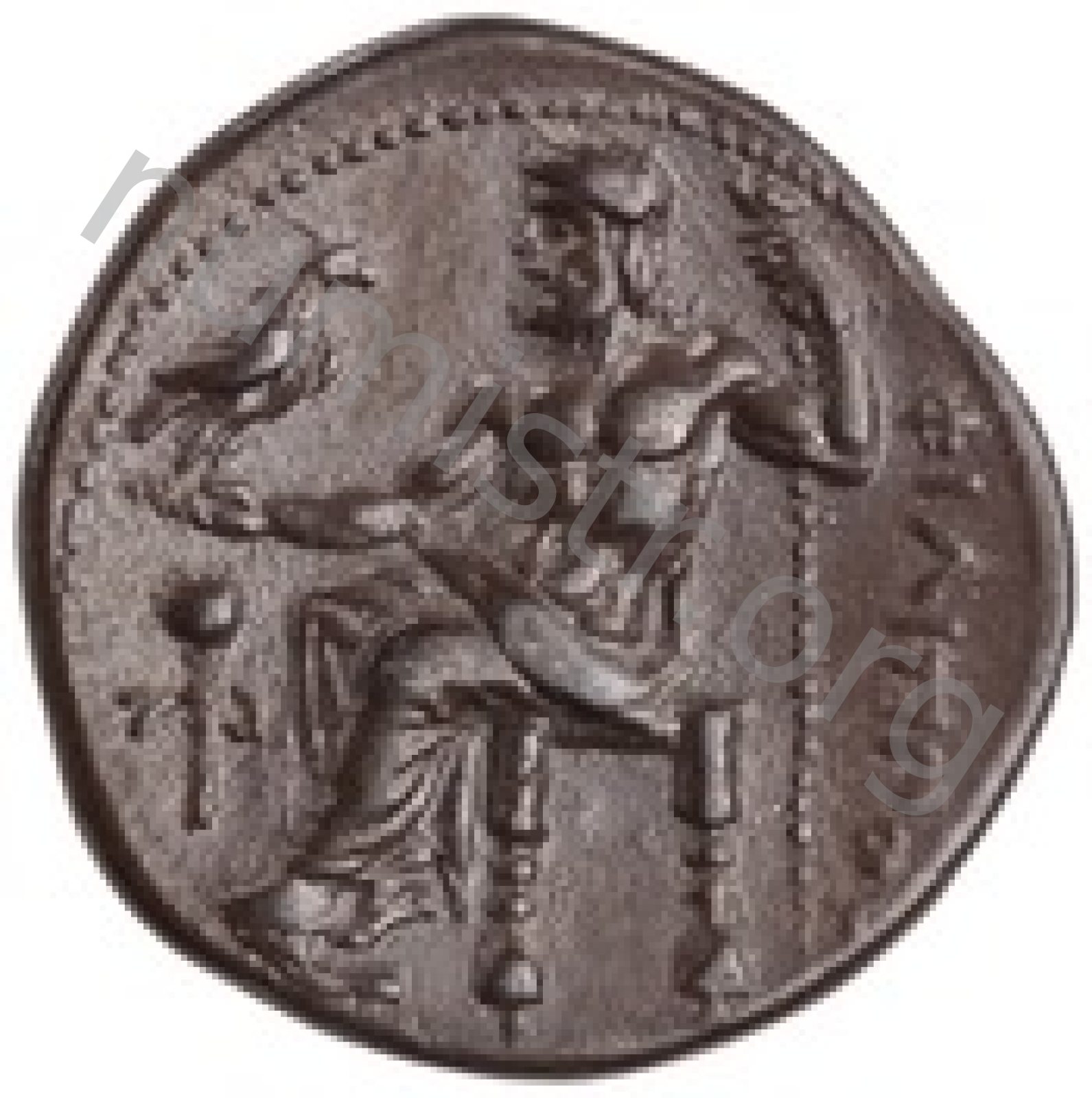 Zeus seated on stool-throne left eagle on outstretched right hand sceptre in left hand -[en]
