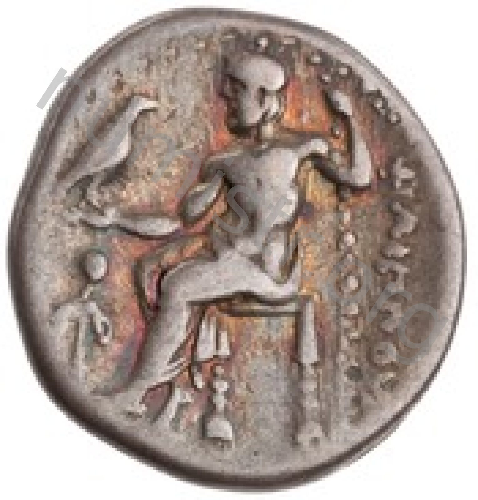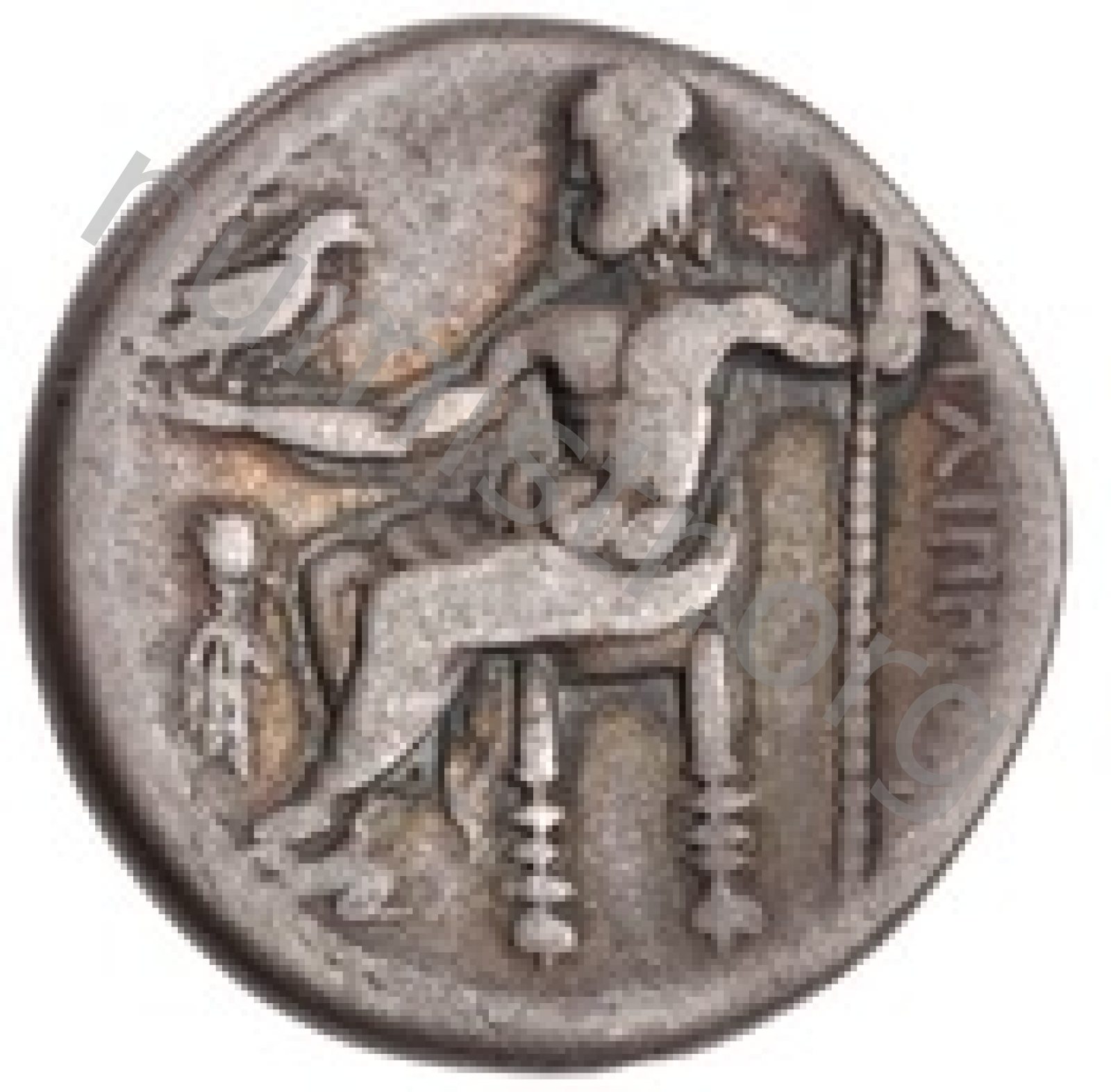 Zeus tabure-tahtta oturuyor sol elinde kartal sağ elinde asa var.
