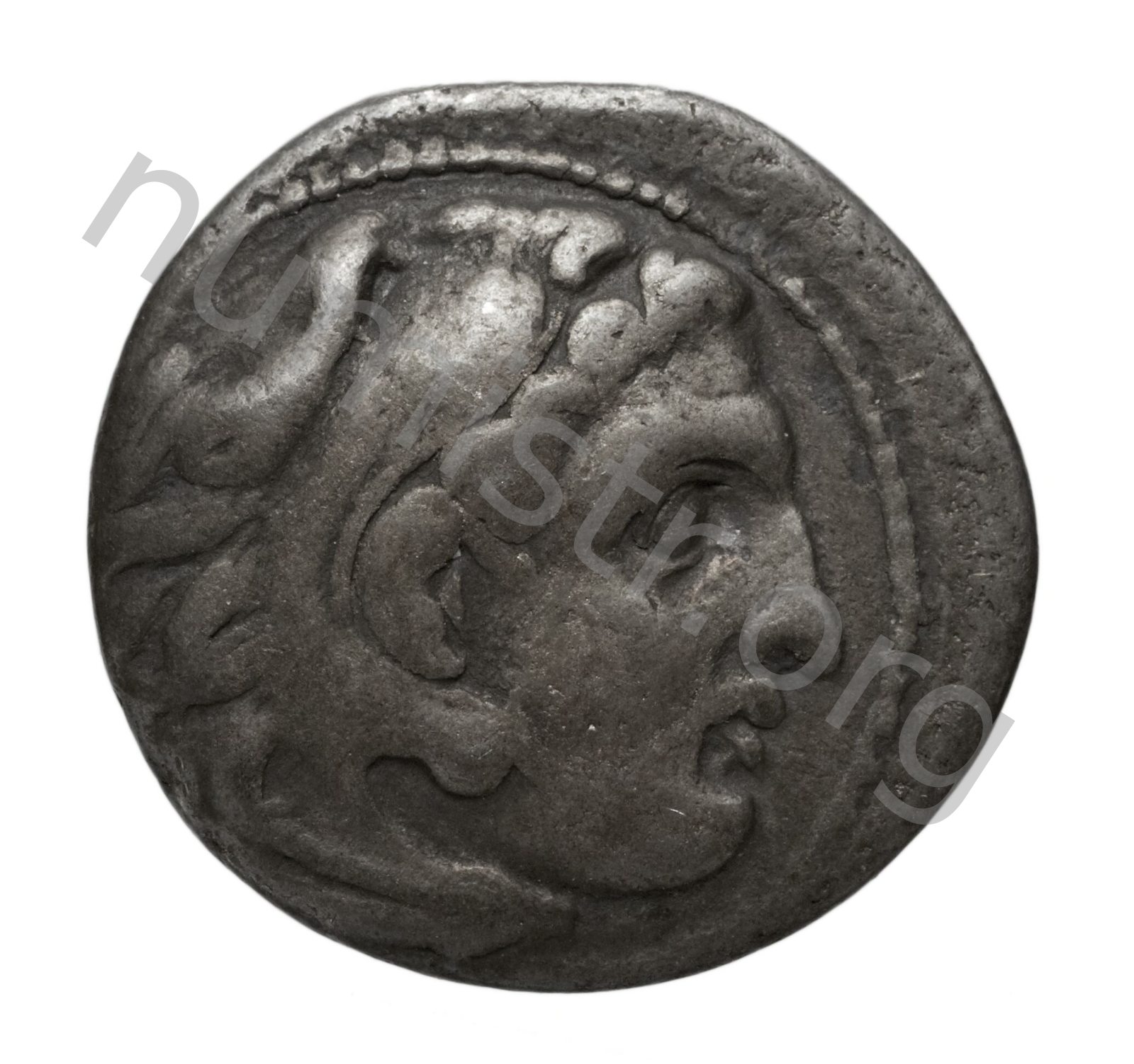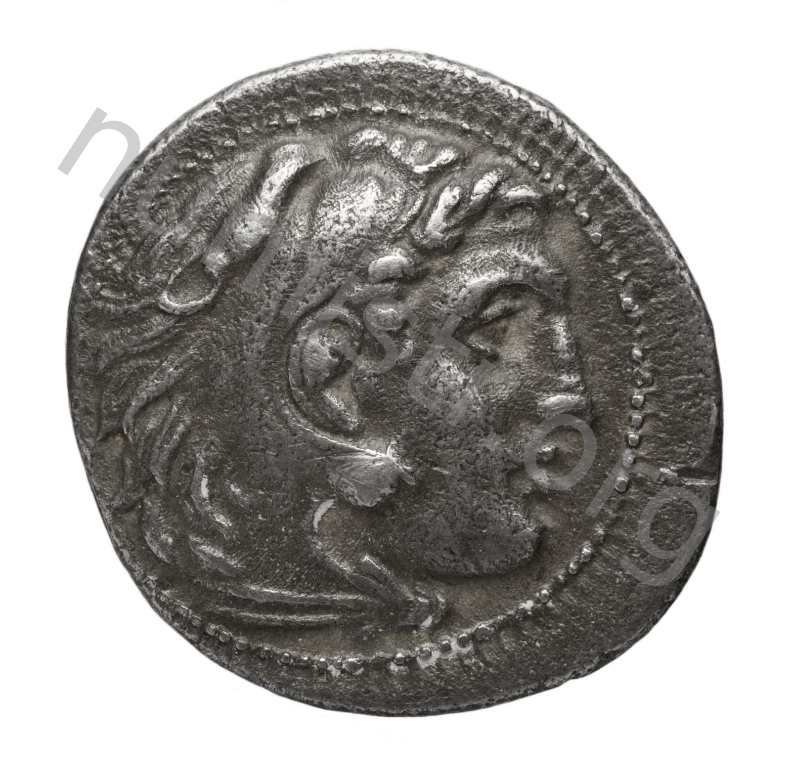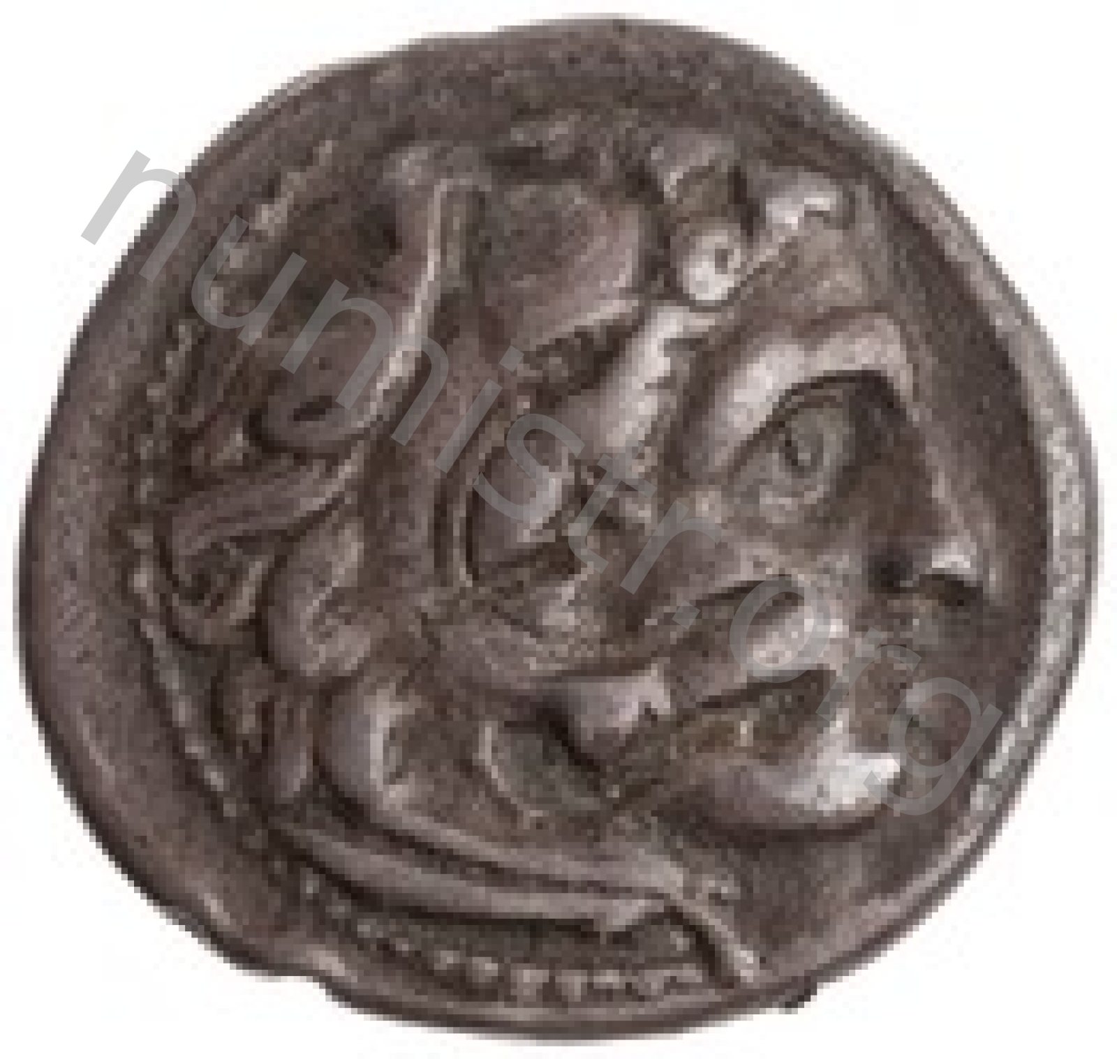 Head of beardless Heracles right wearing lion skin headdress -[en]