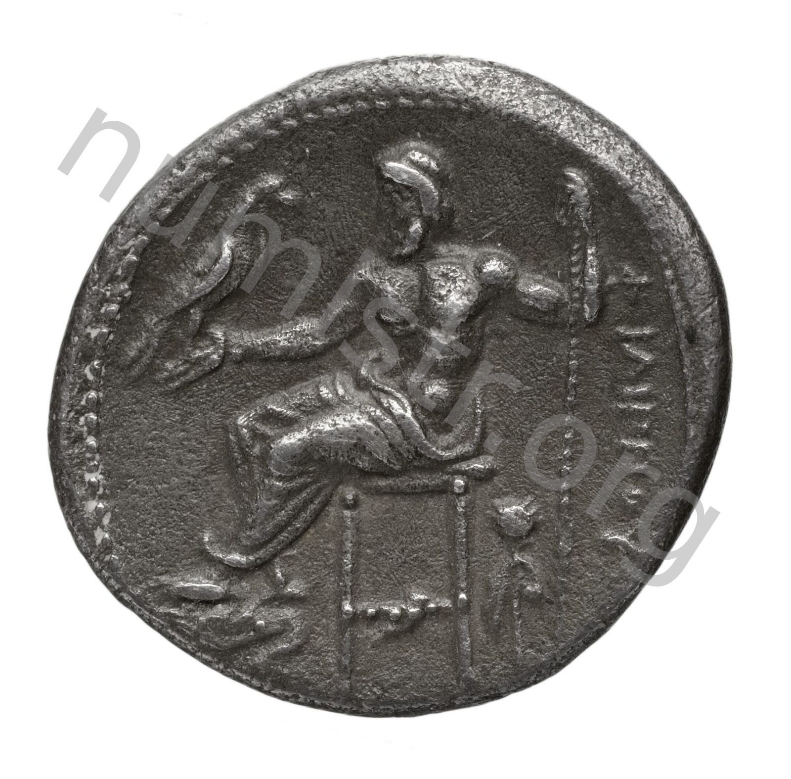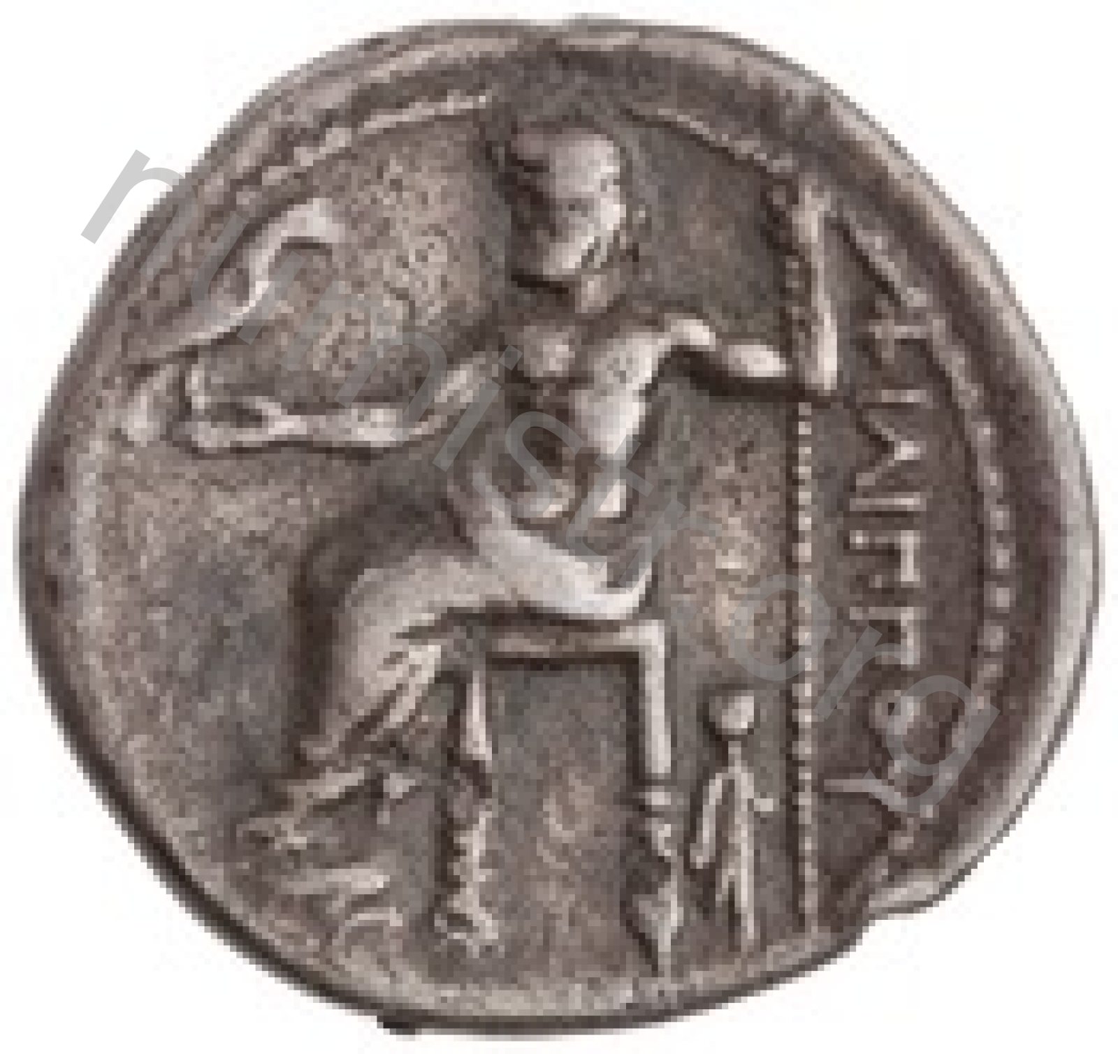 Zeus seated on stool-throne left eagle on outstretched right hand sceptre in left hand -[en]