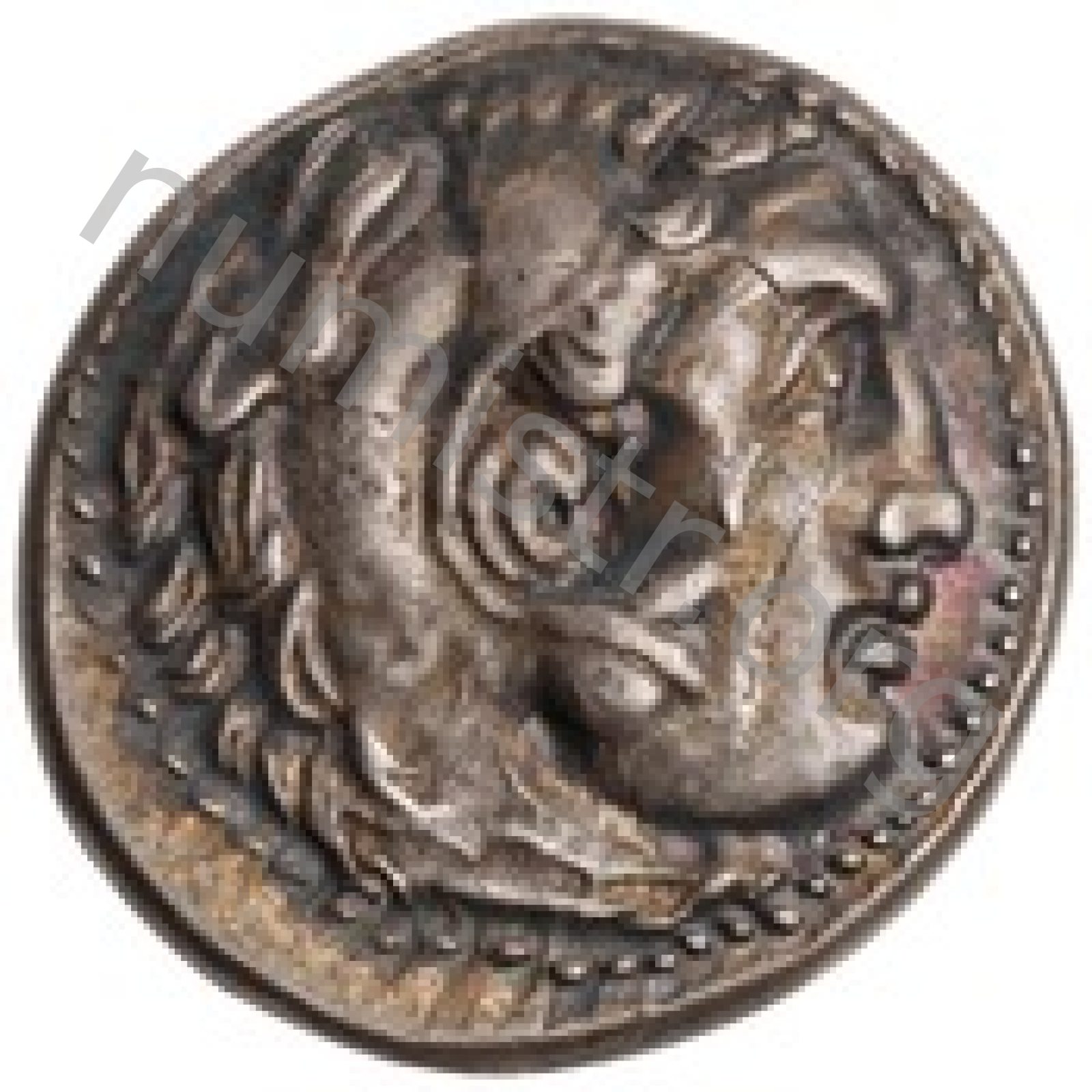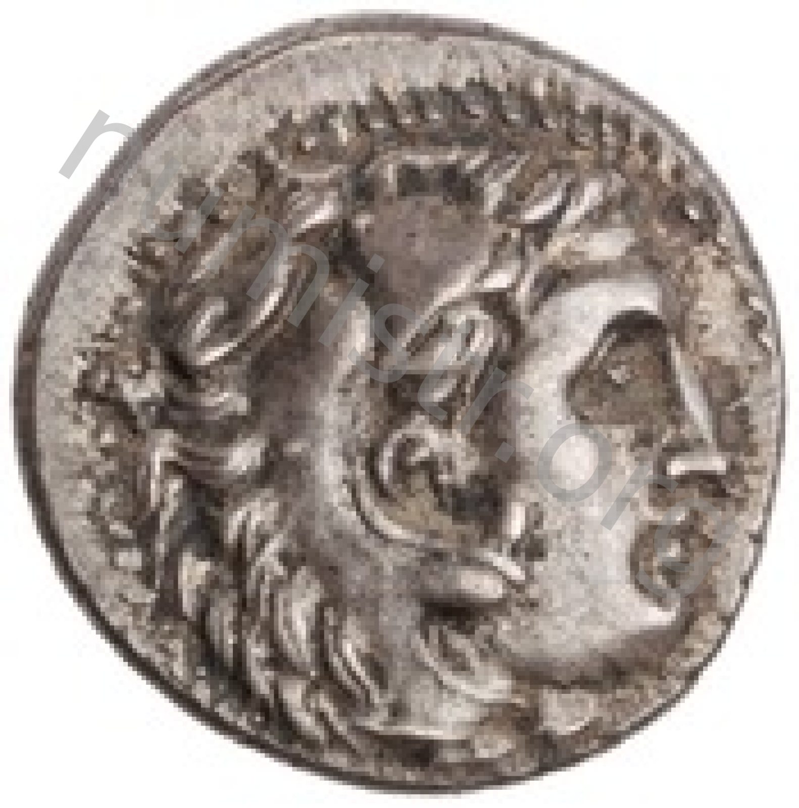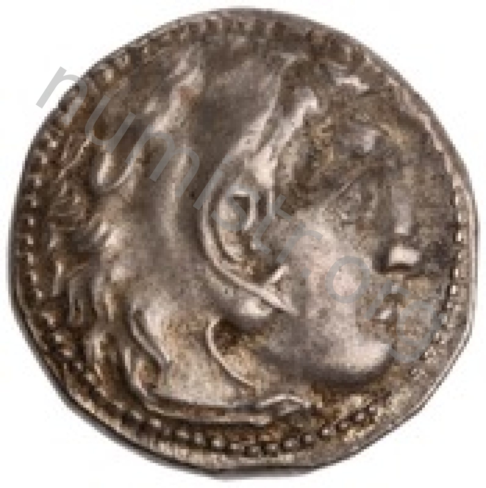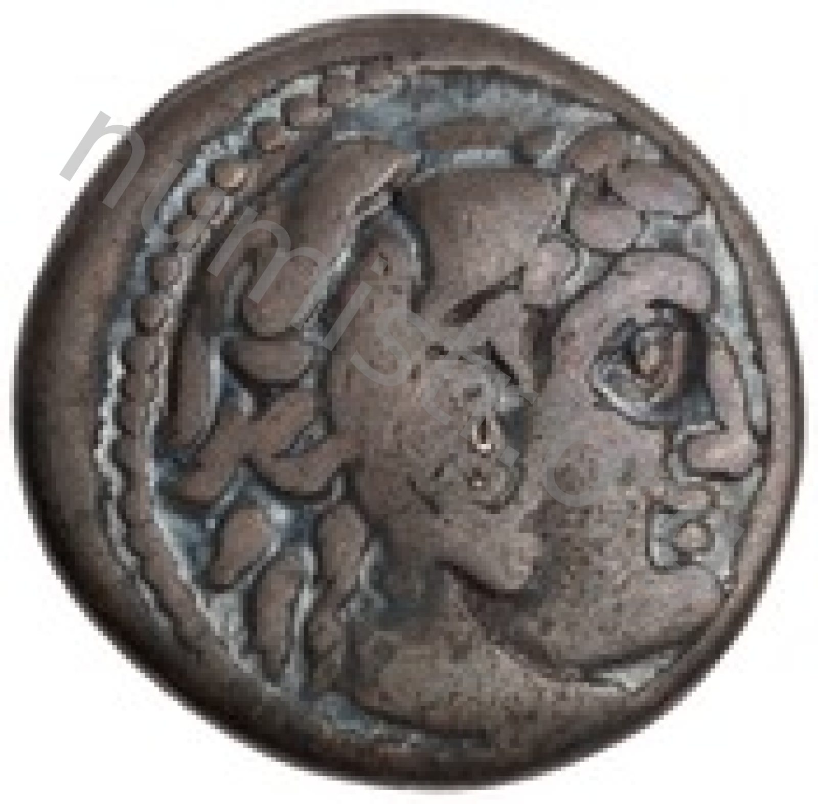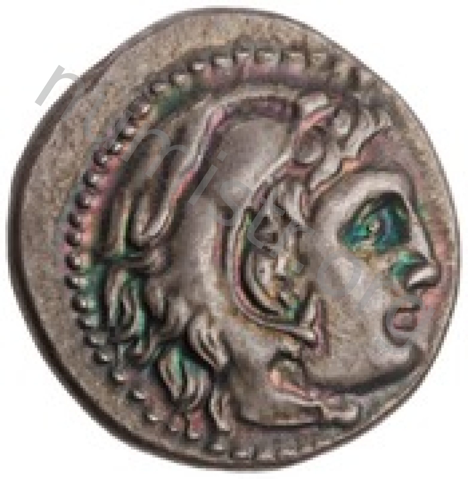 Head of beardless Heracles right wearing lion skin headdress -[en]