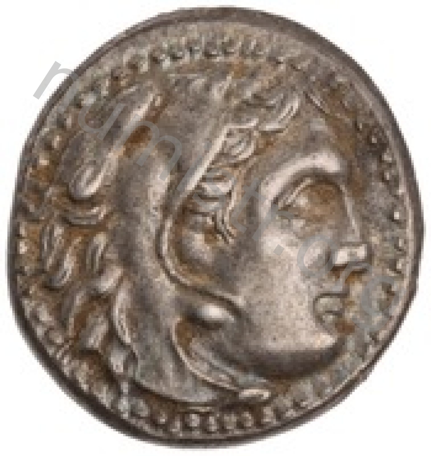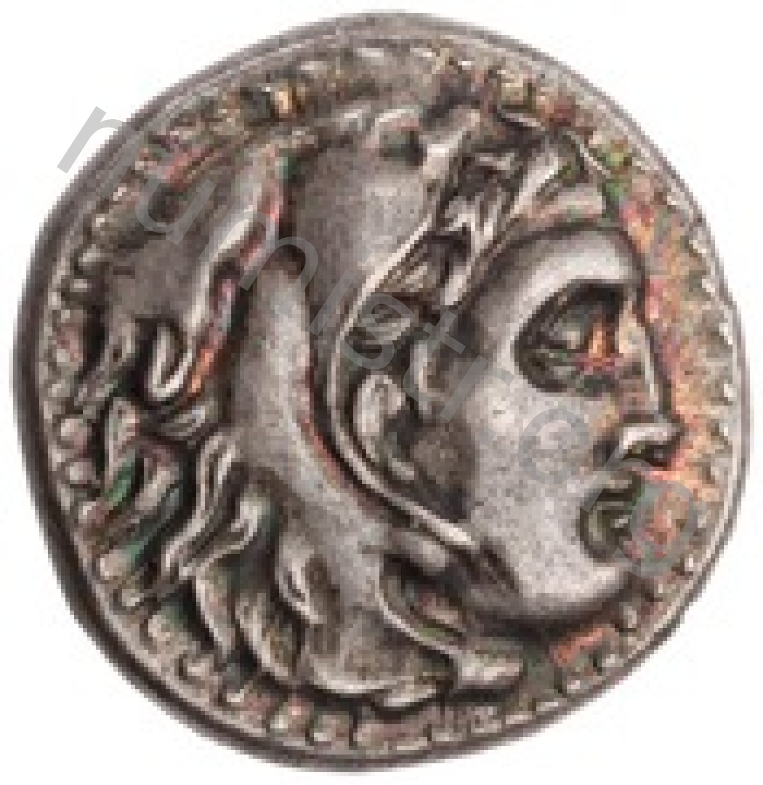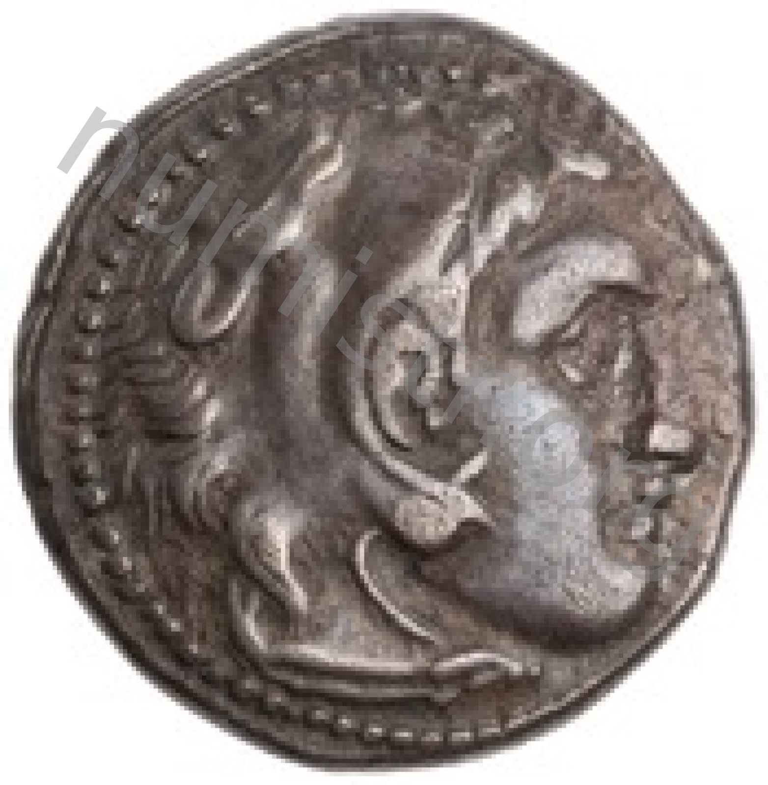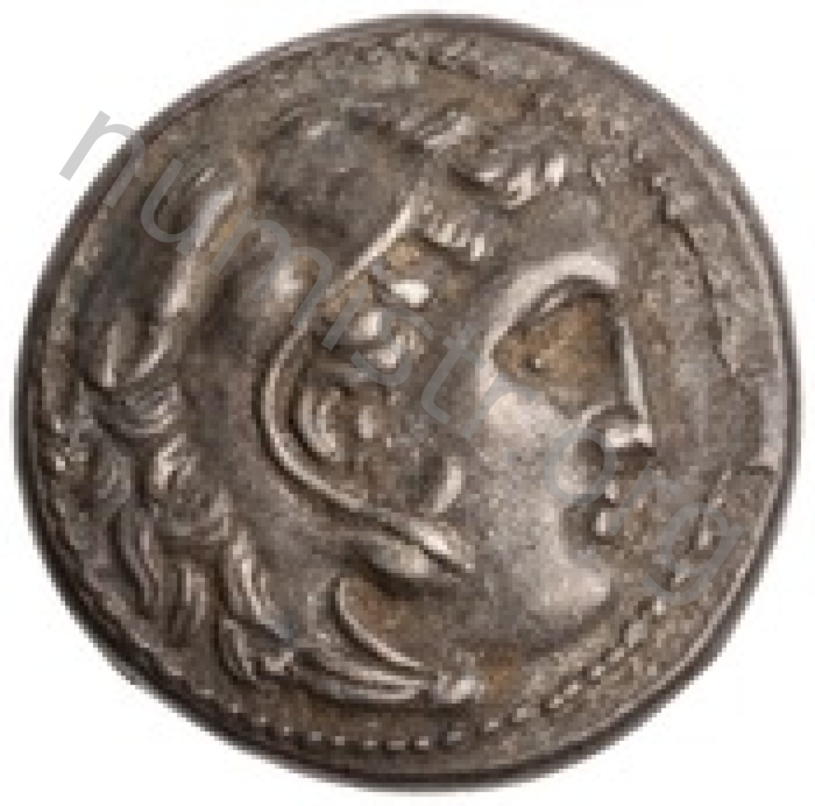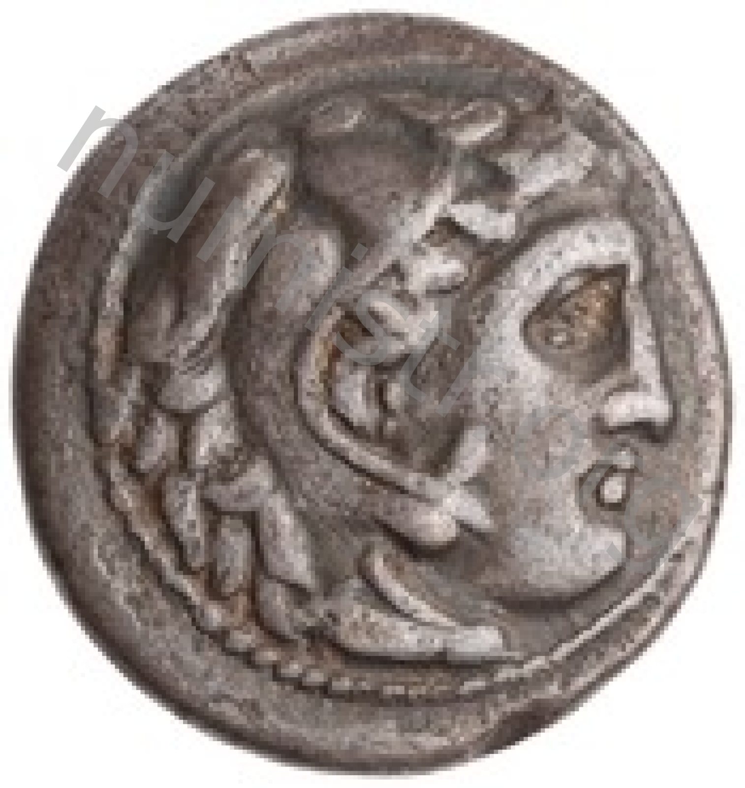 Head of beardless Heracles right wearing lion skin headdress -[en]