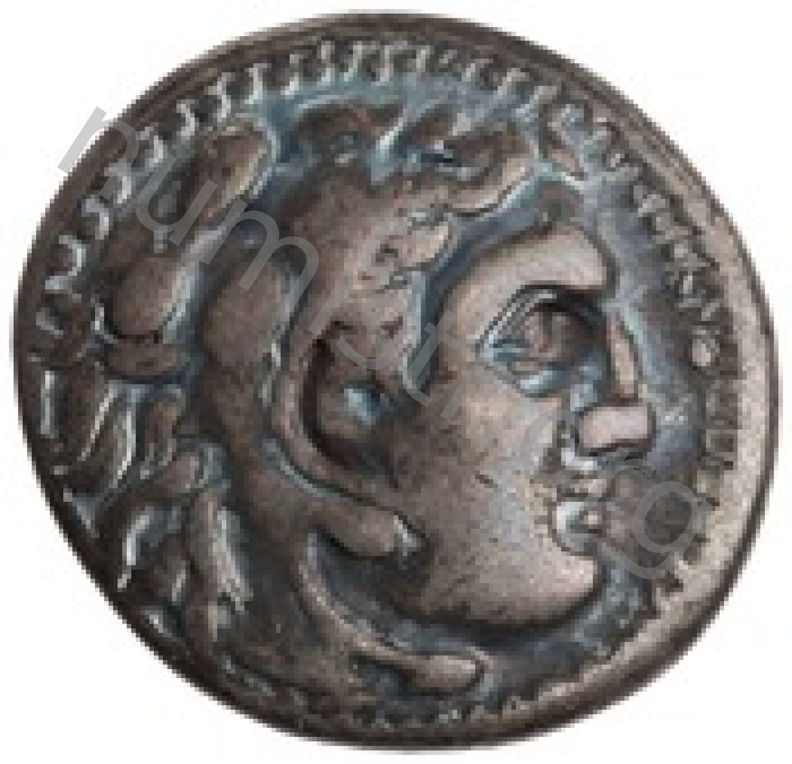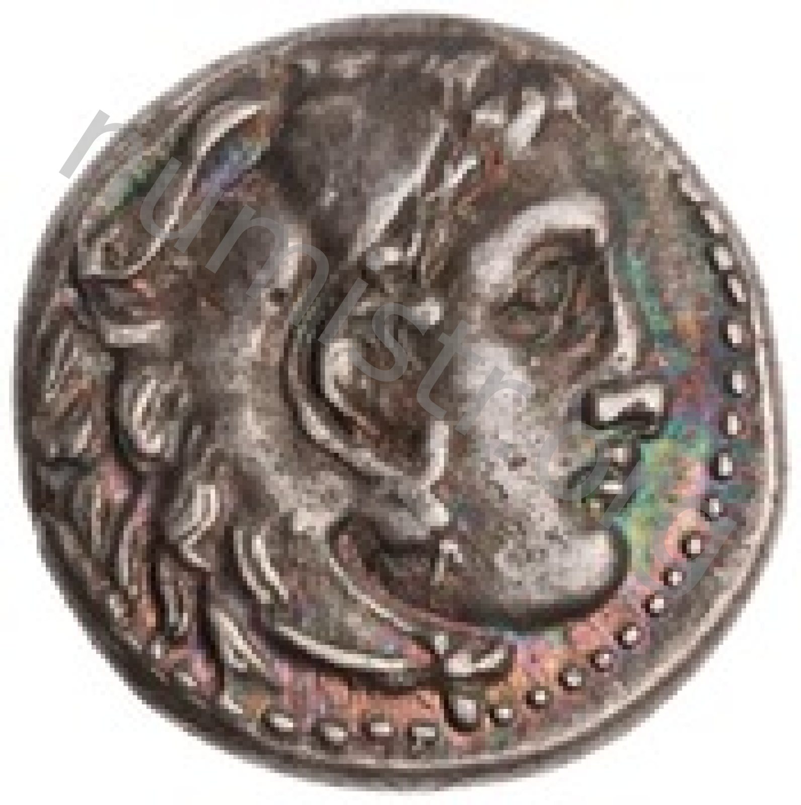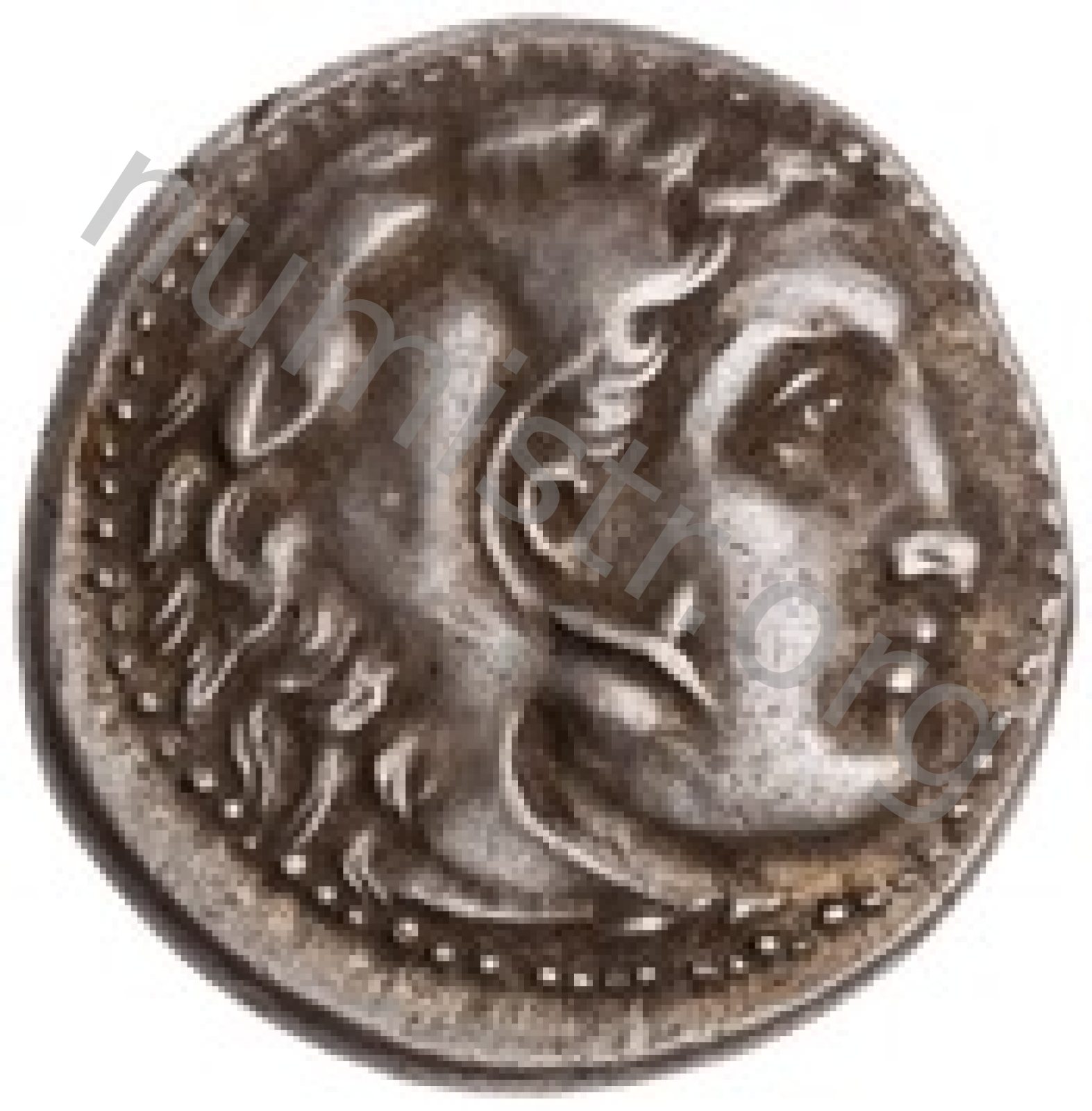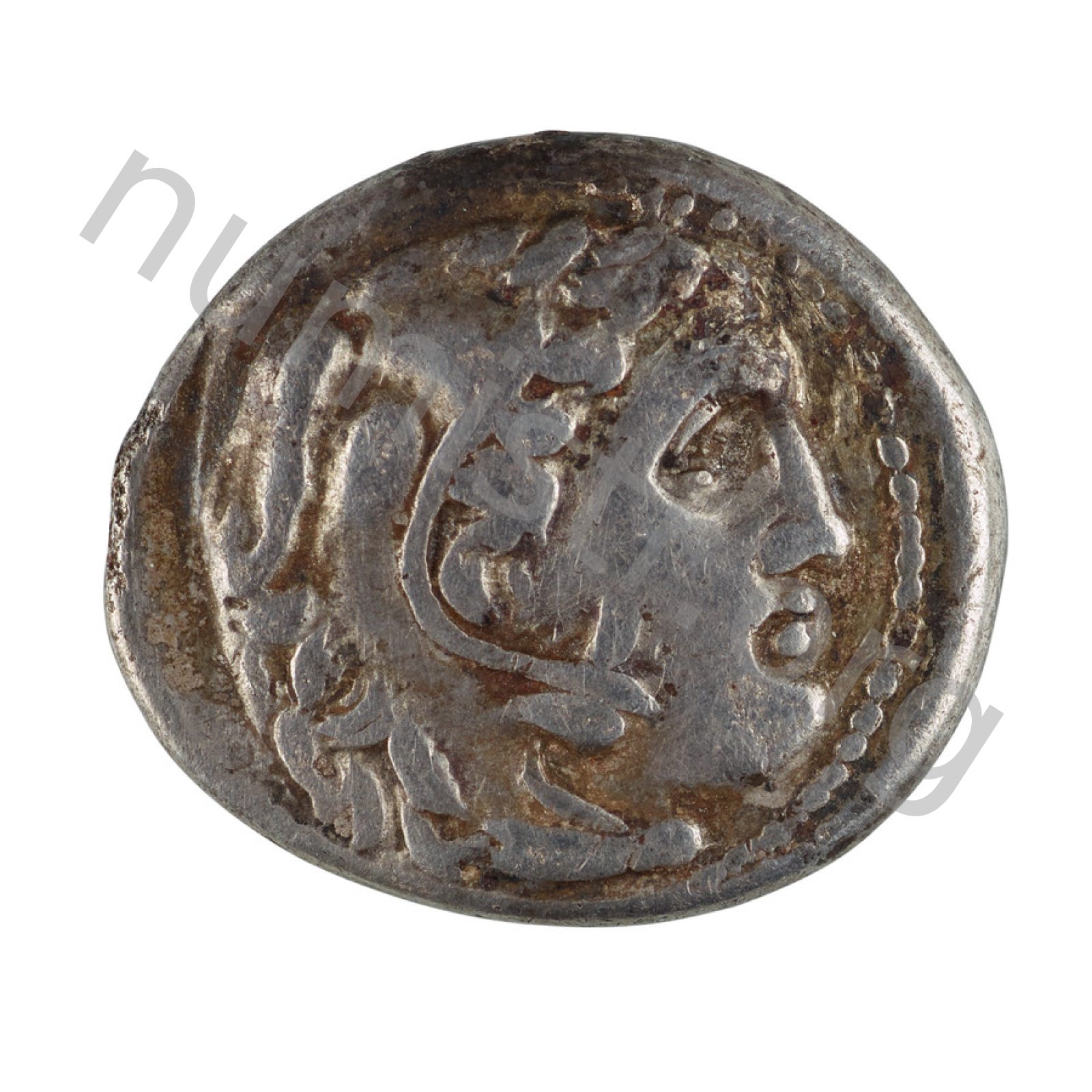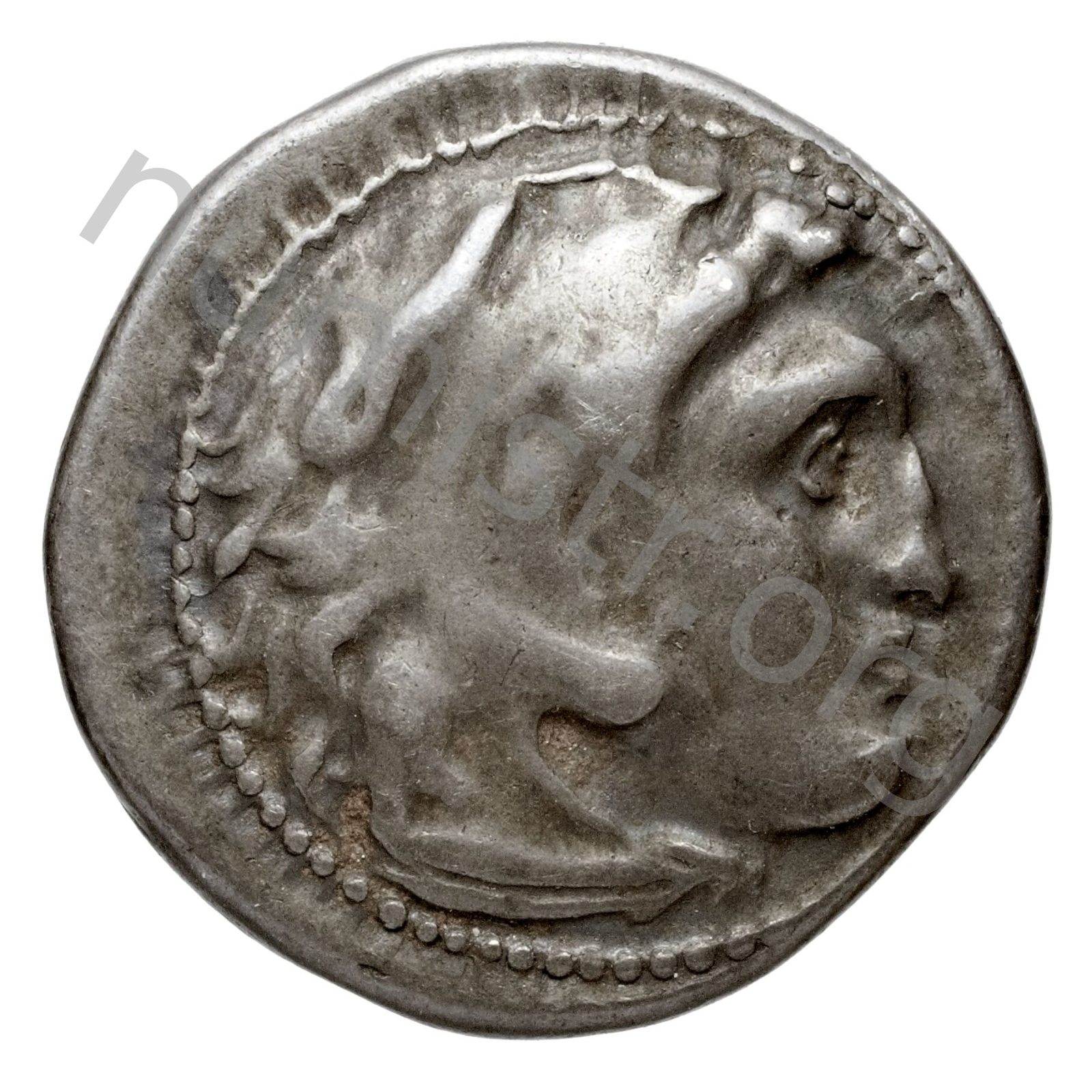 Head of beardless Heracles right wearing lion skin headdress -[en]