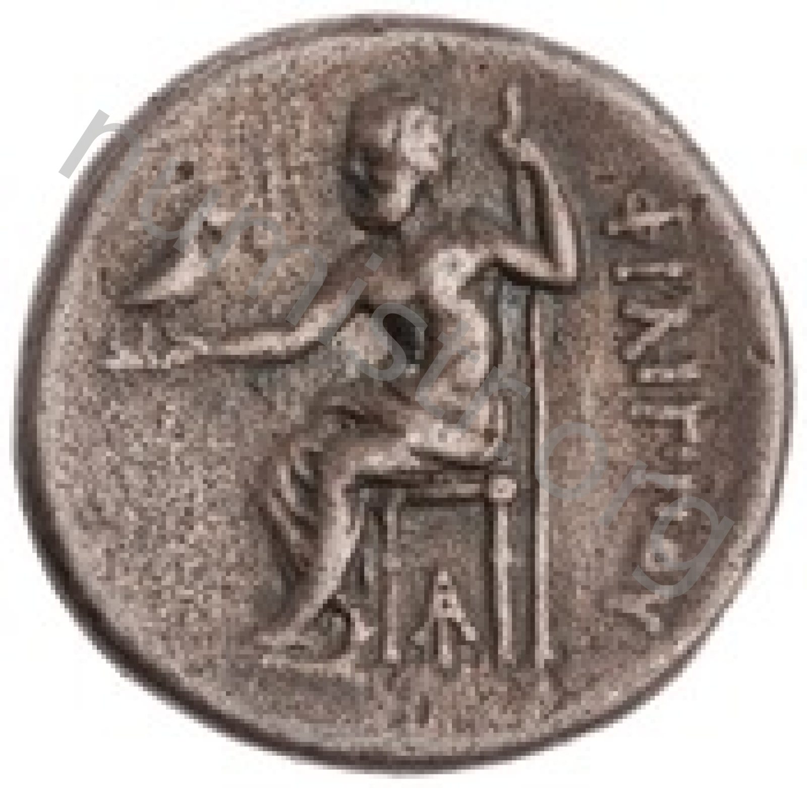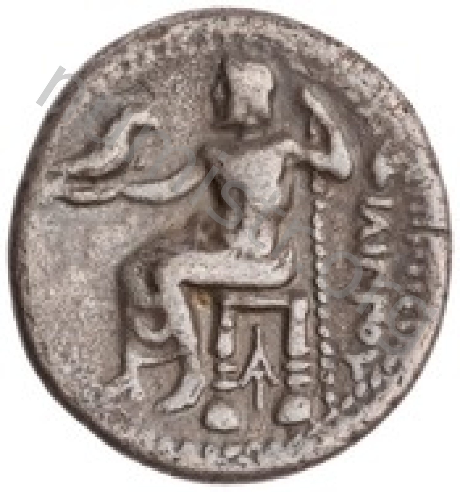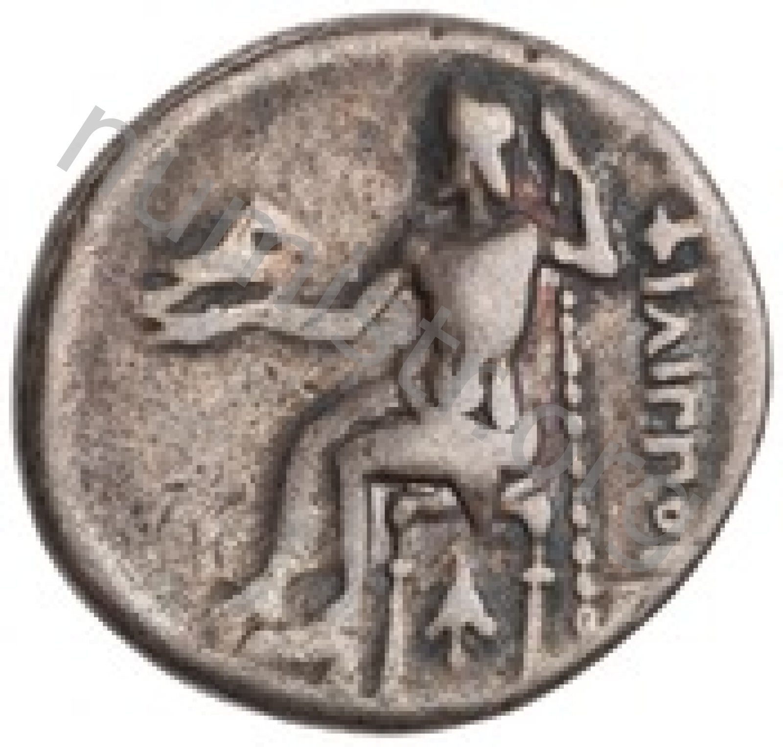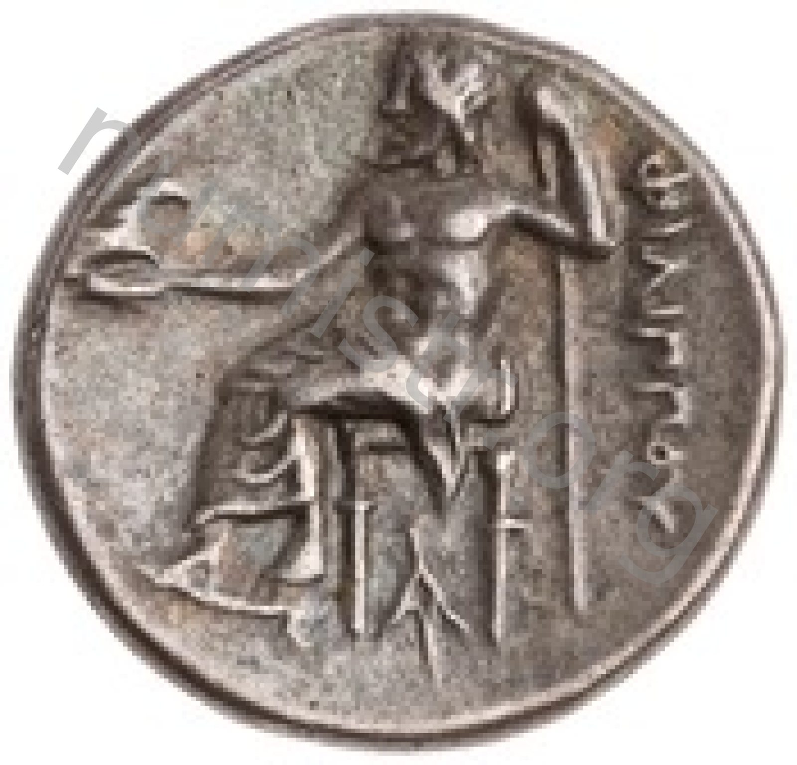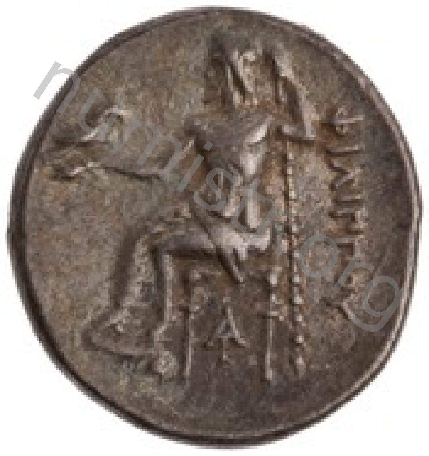 Zeus seated on stool-throne left eagle on outstretched right hand sceptre in left hand -[en]