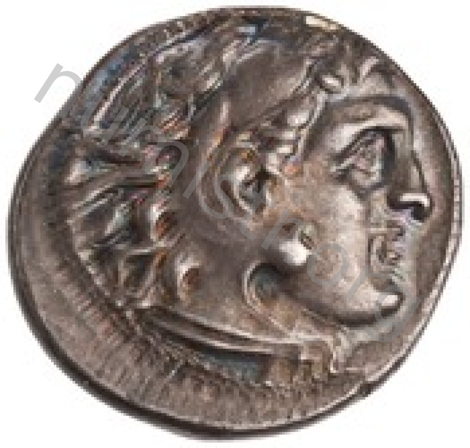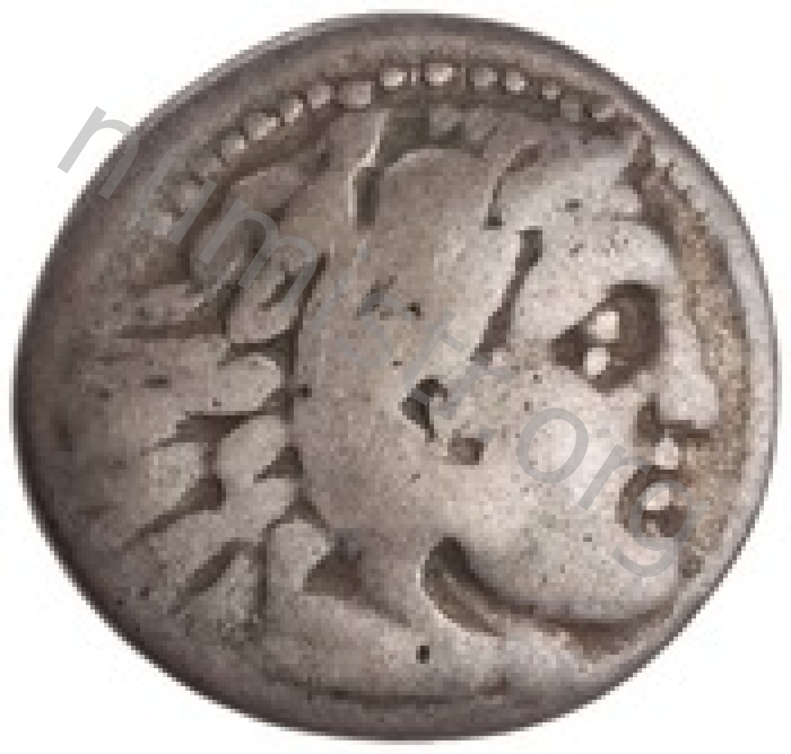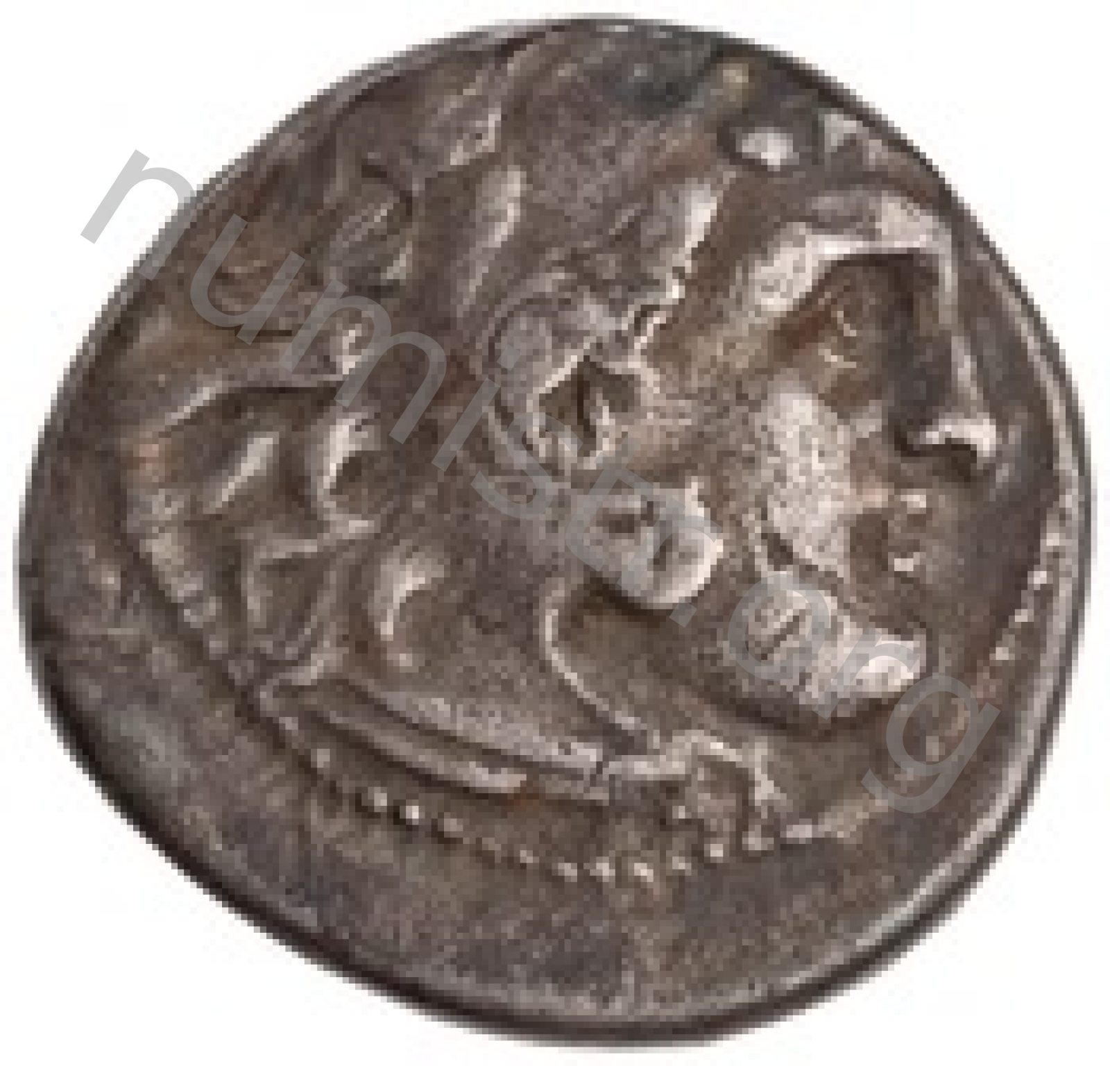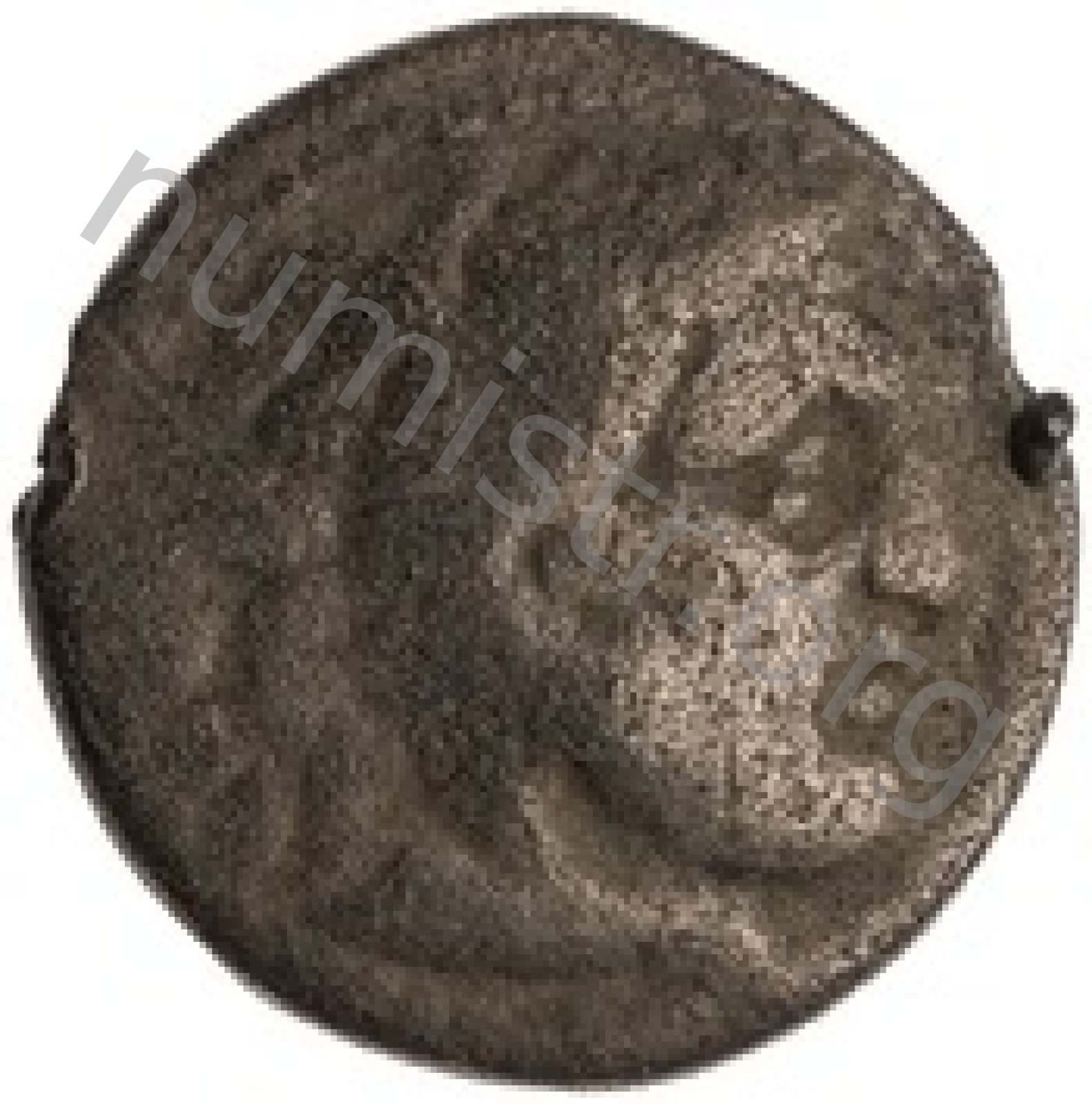Head of beardless Heracles right wearing lion skin headdress -[en]