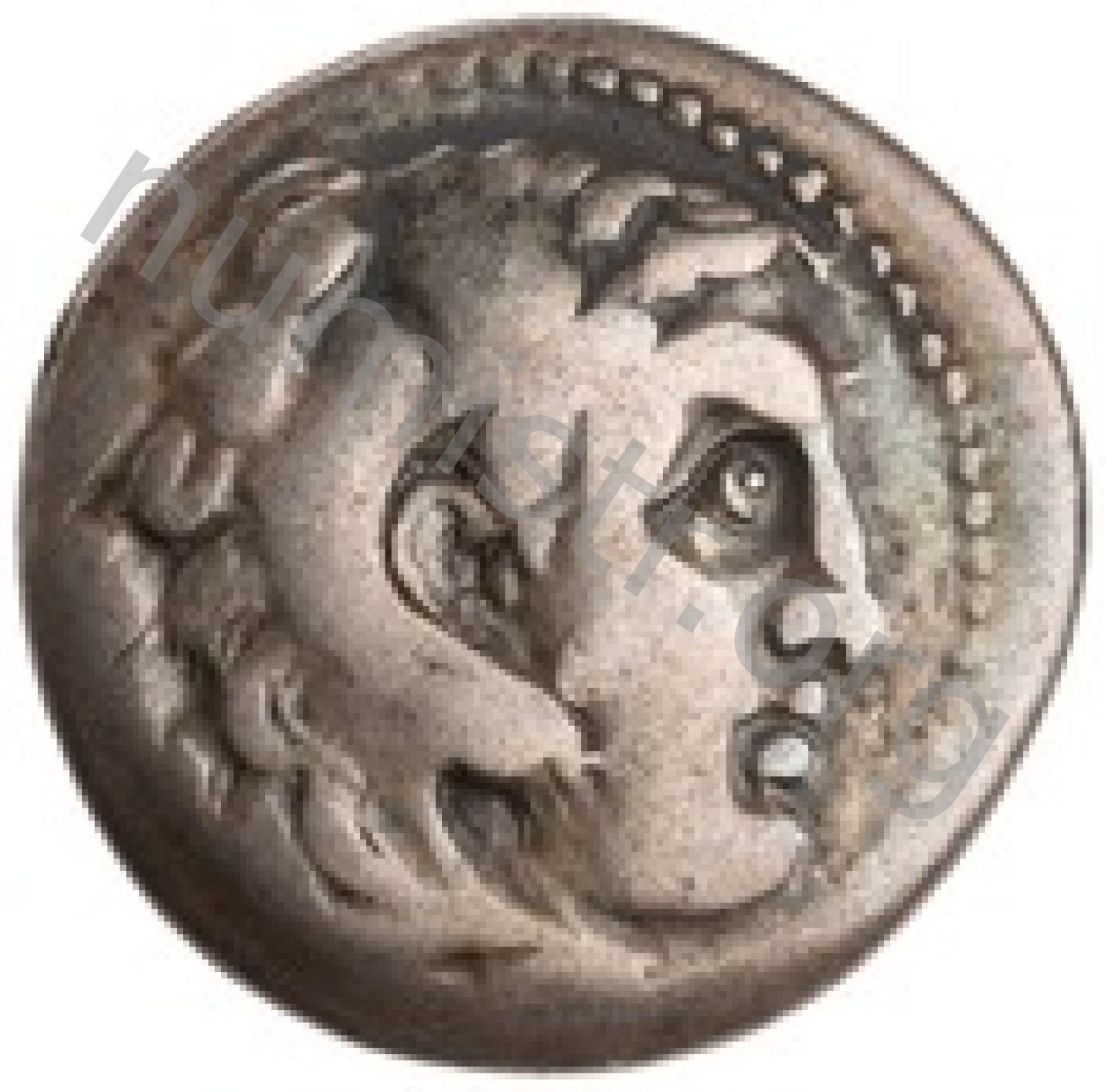 Head of beardless Heracles right wearing lion skin headdress -[en]