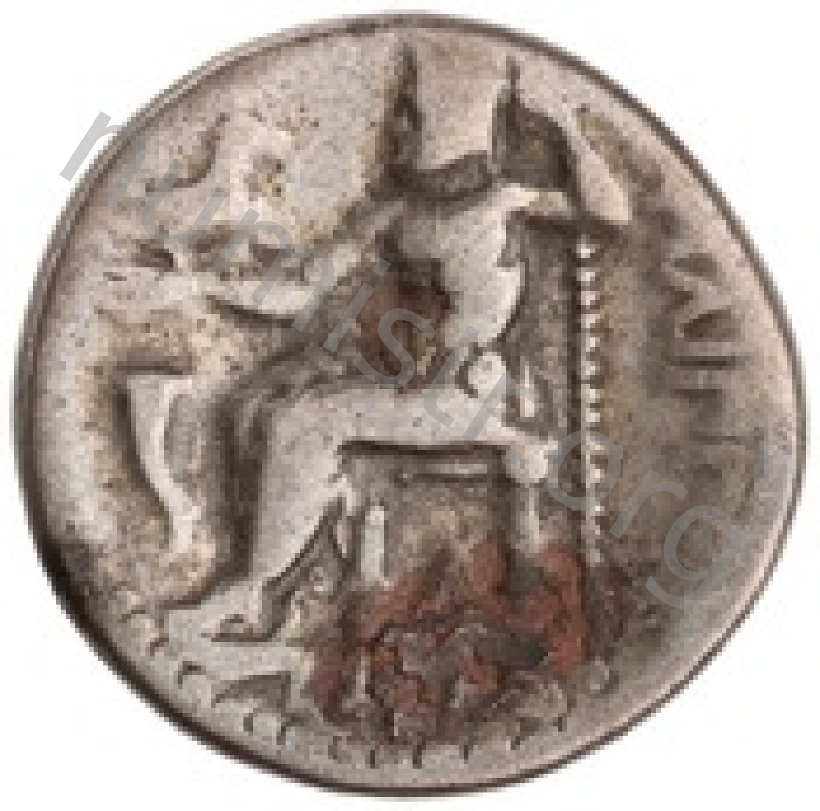 Zeus tabure-tahtta oturuyor sol elinde kartal sağ elinde asa var.