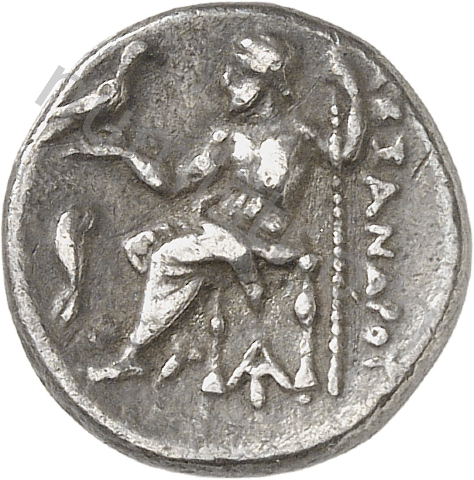 Zeus seated on stool-throne left eagle on outstretched right hand sceptre in left hand -[en]