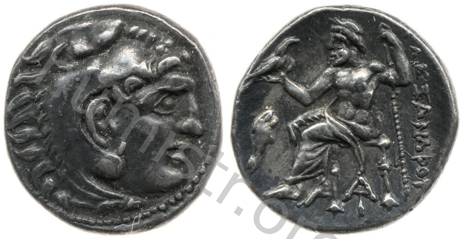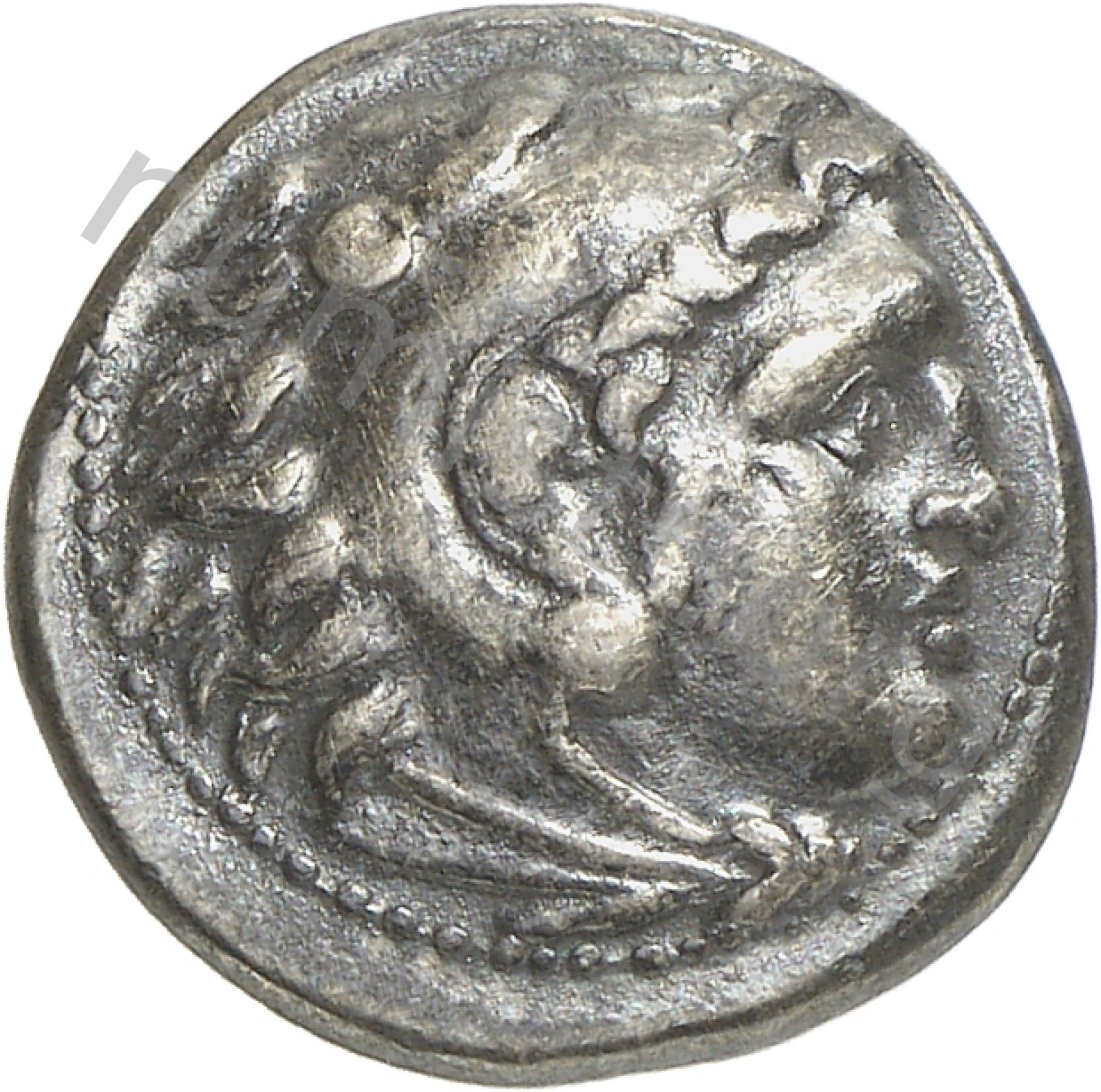 Head of beardless Heracles right wearing lion skin headdress -[en]