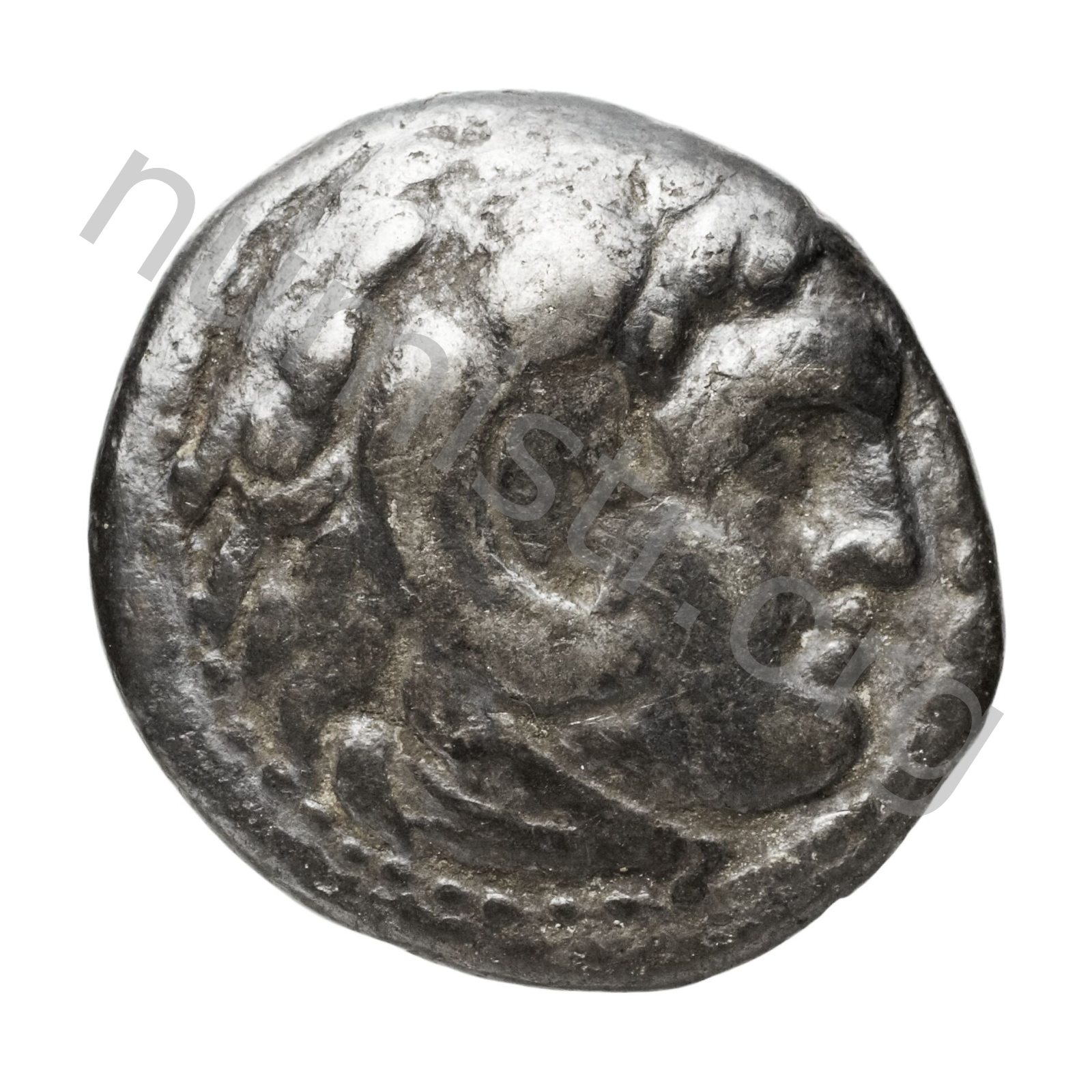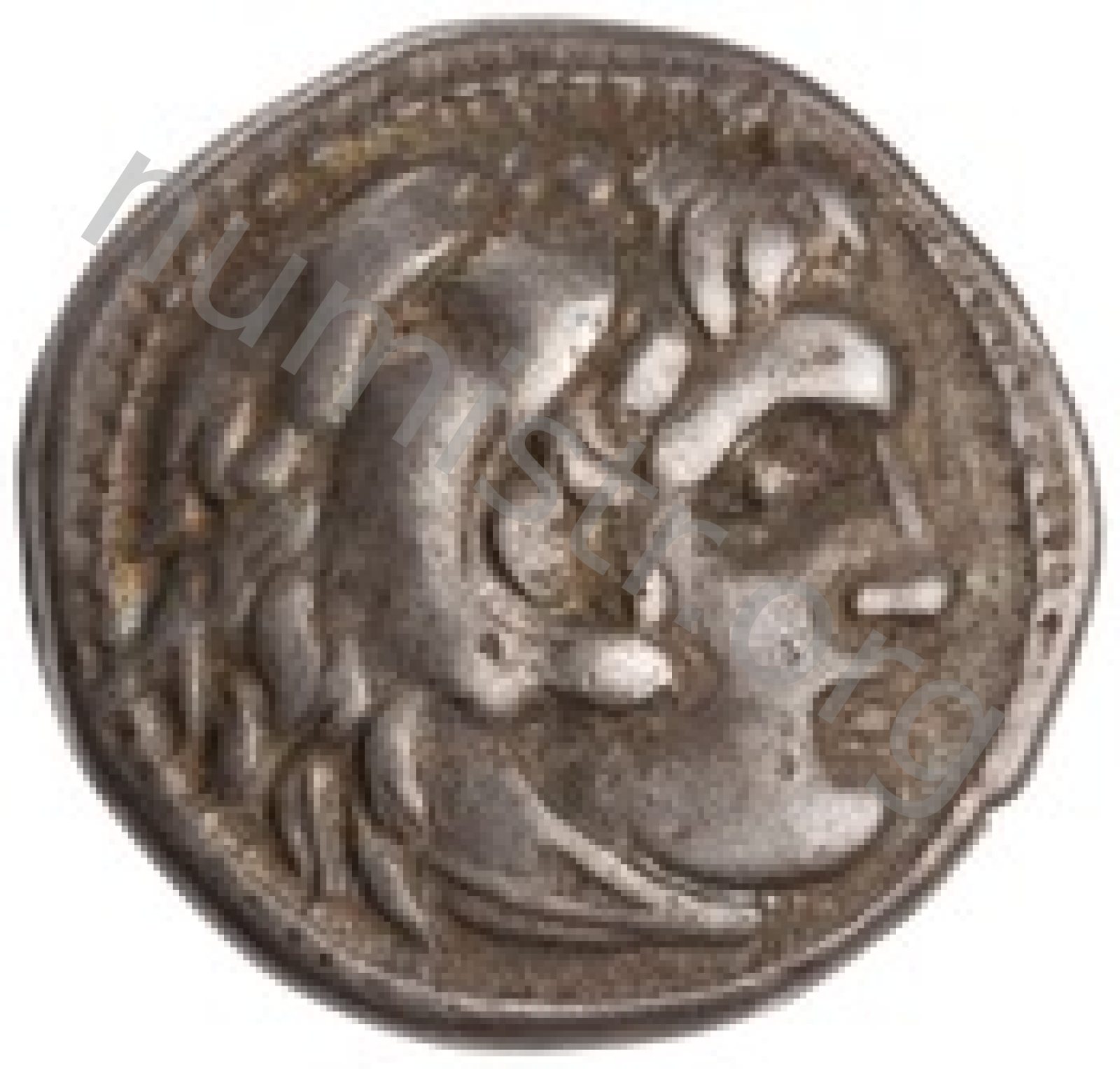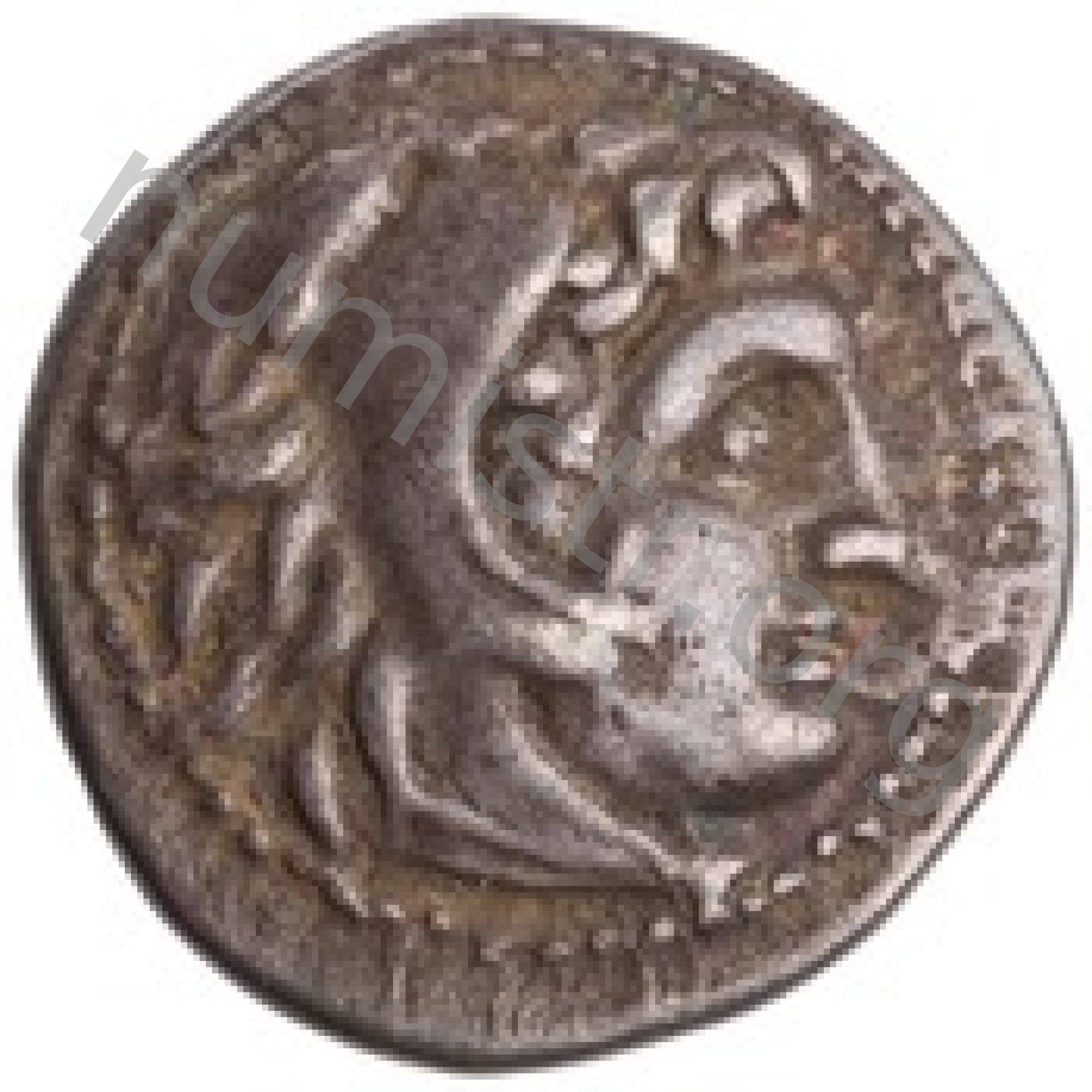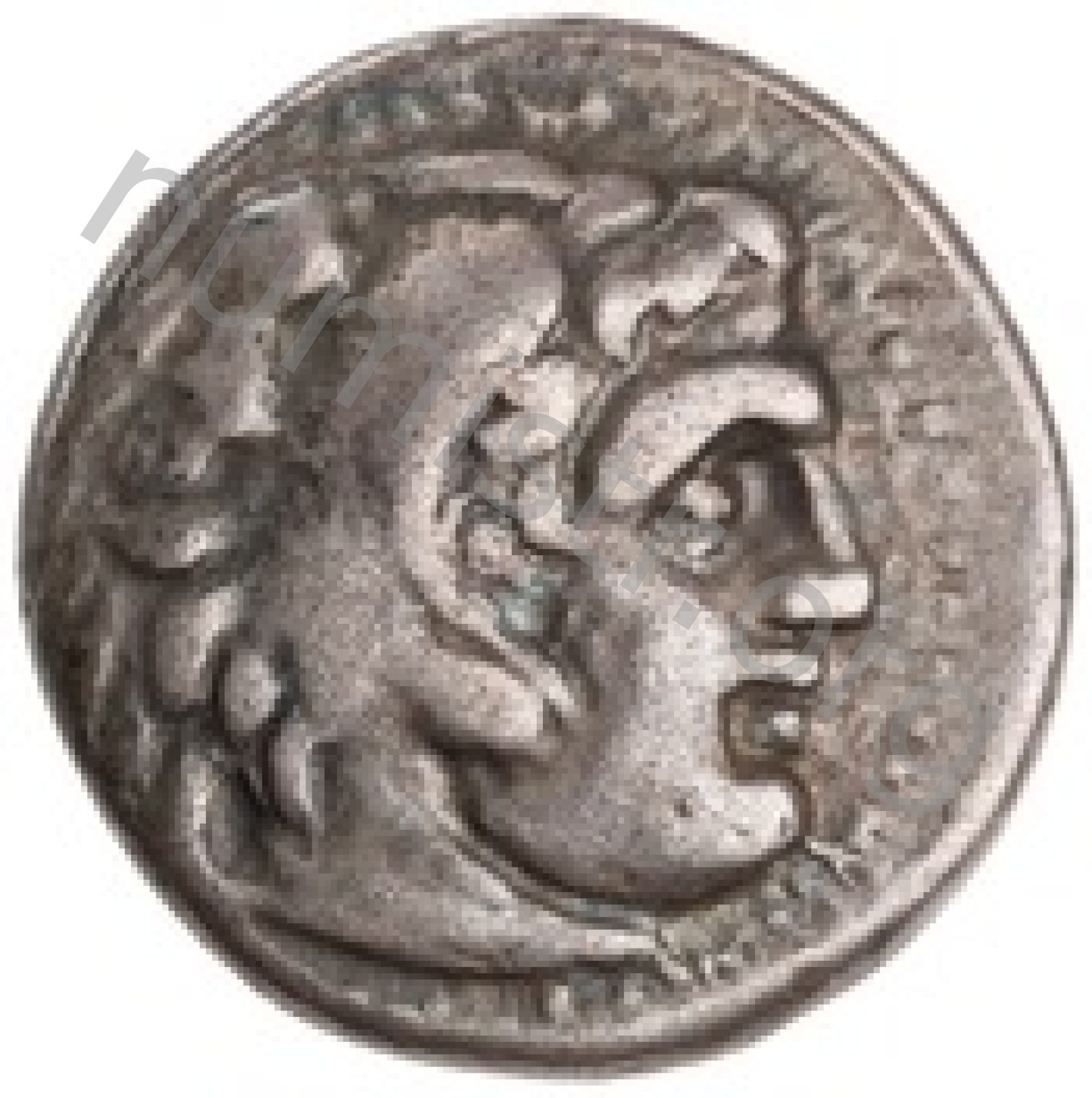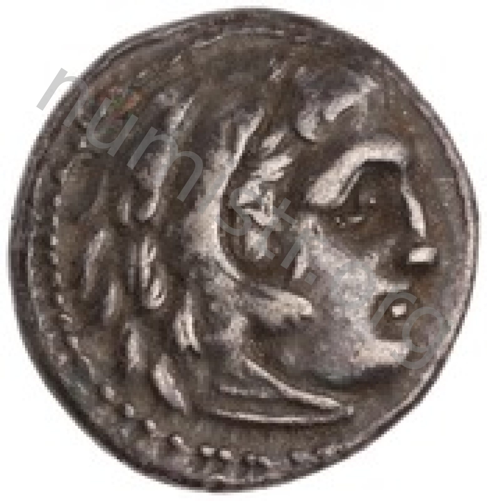 Head of beardless Heracles right wearing lion skin headdress -[en]