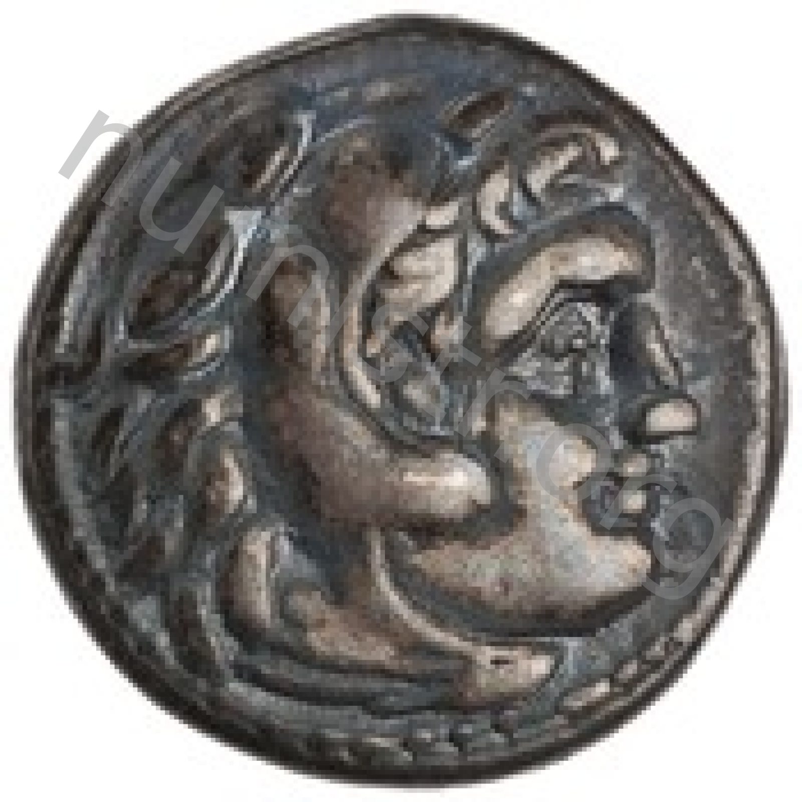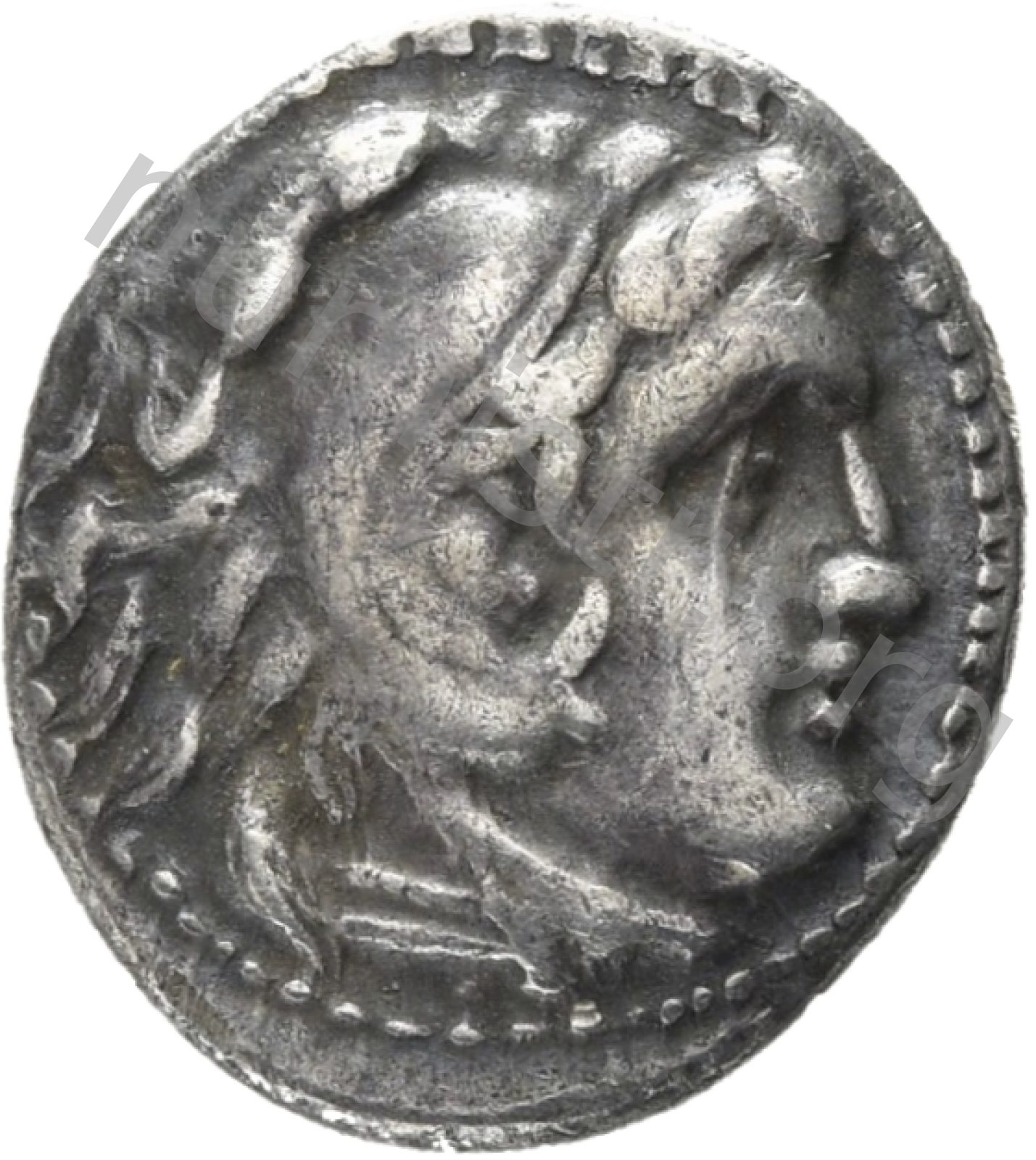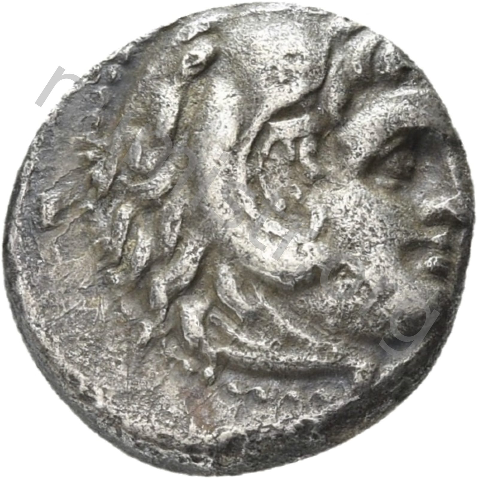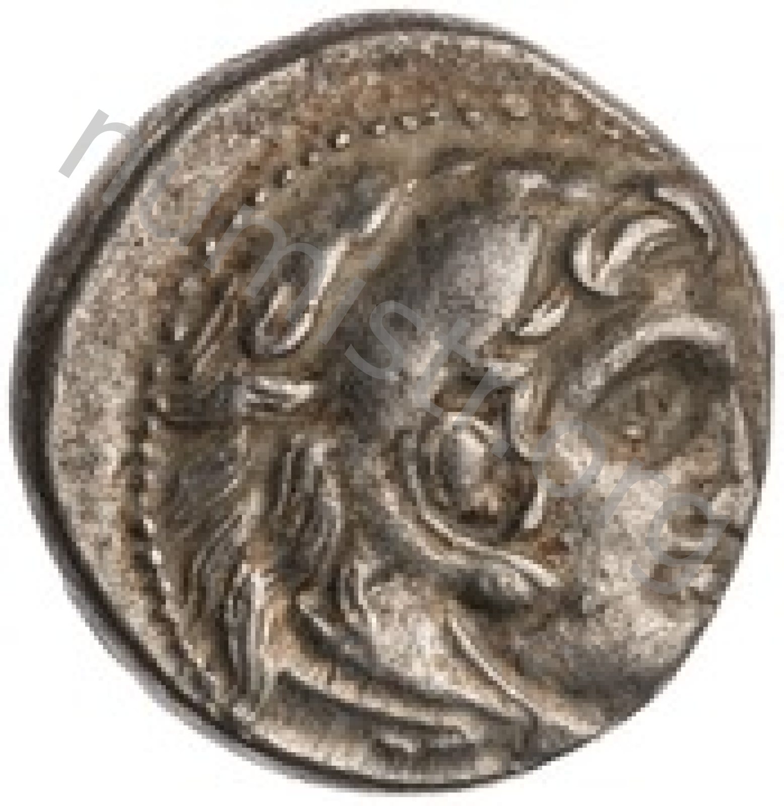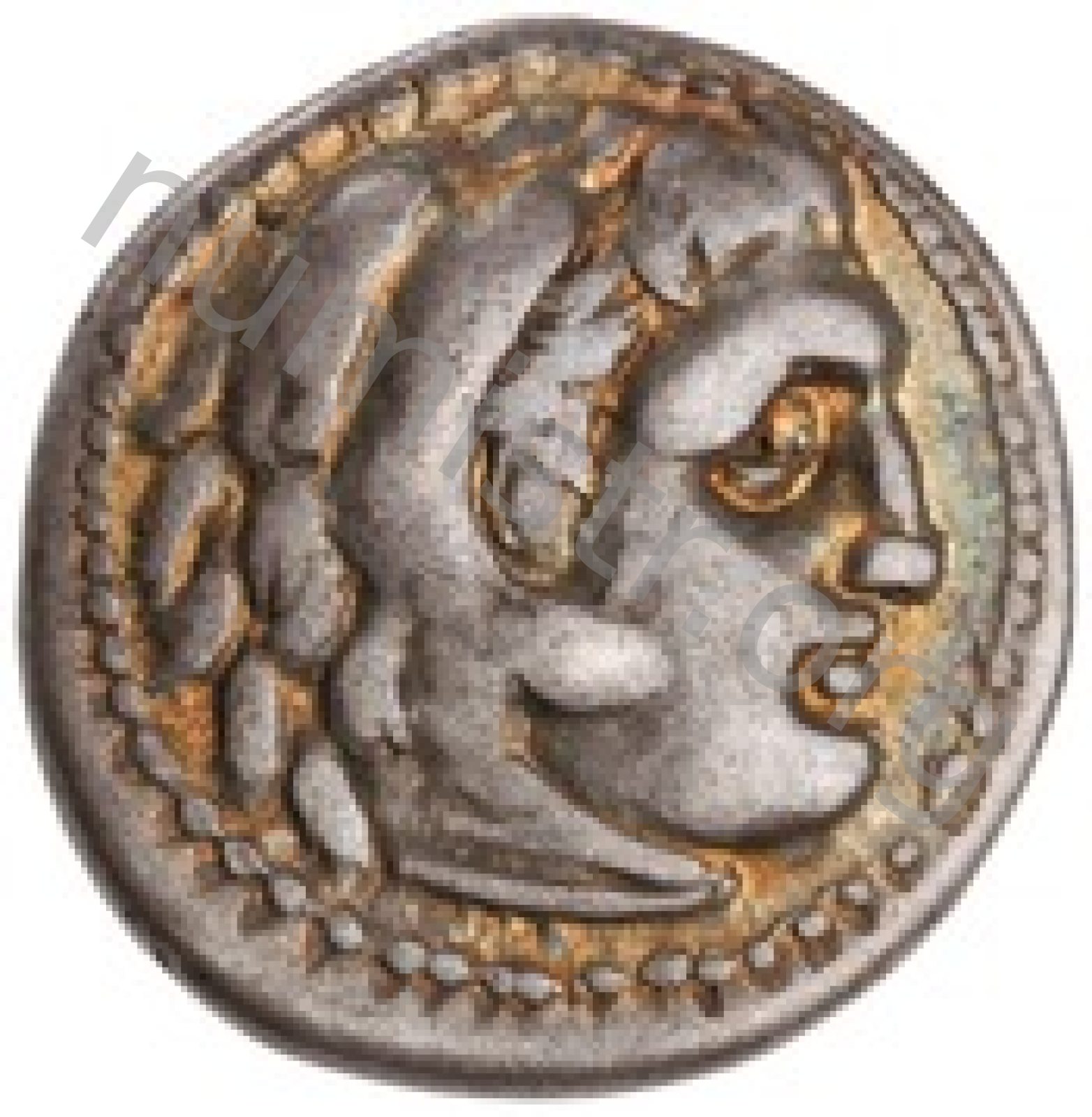 Head of beardless Heracles right wearing lion skin headdress -[en]