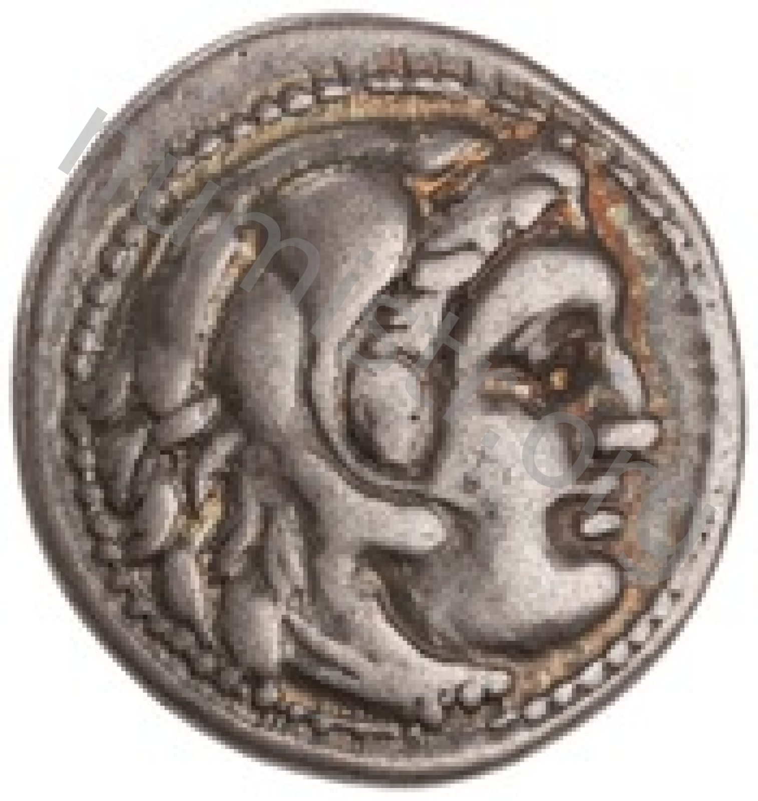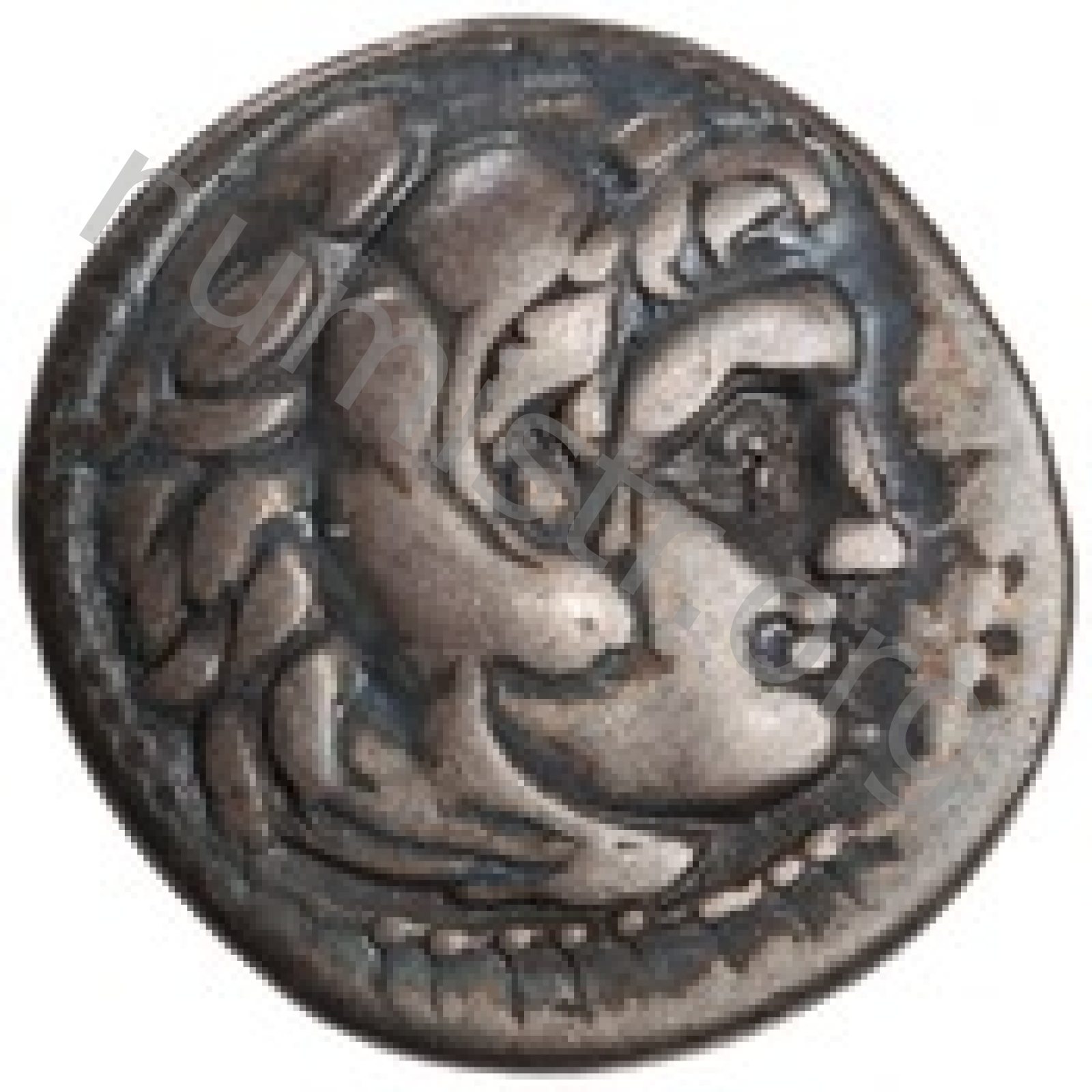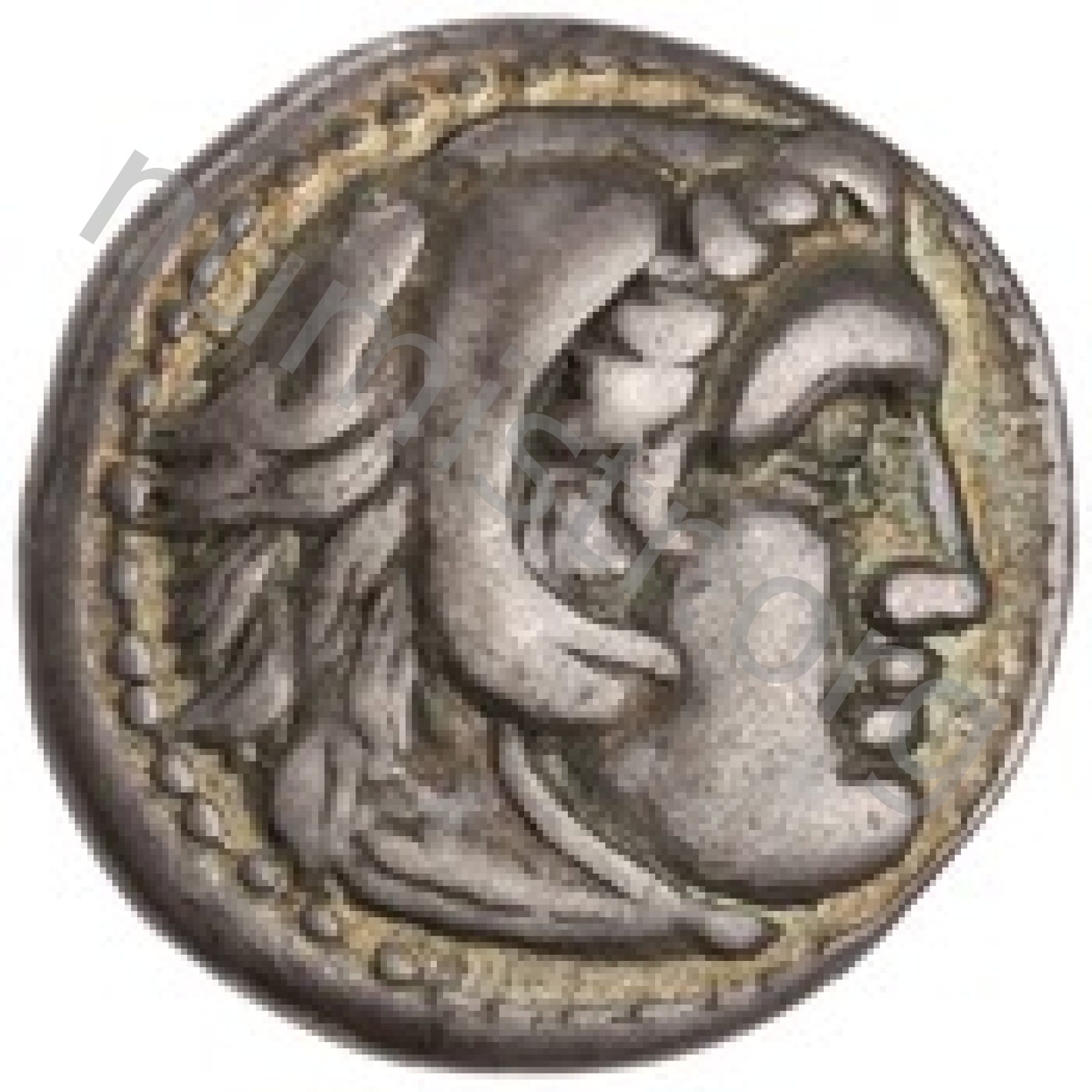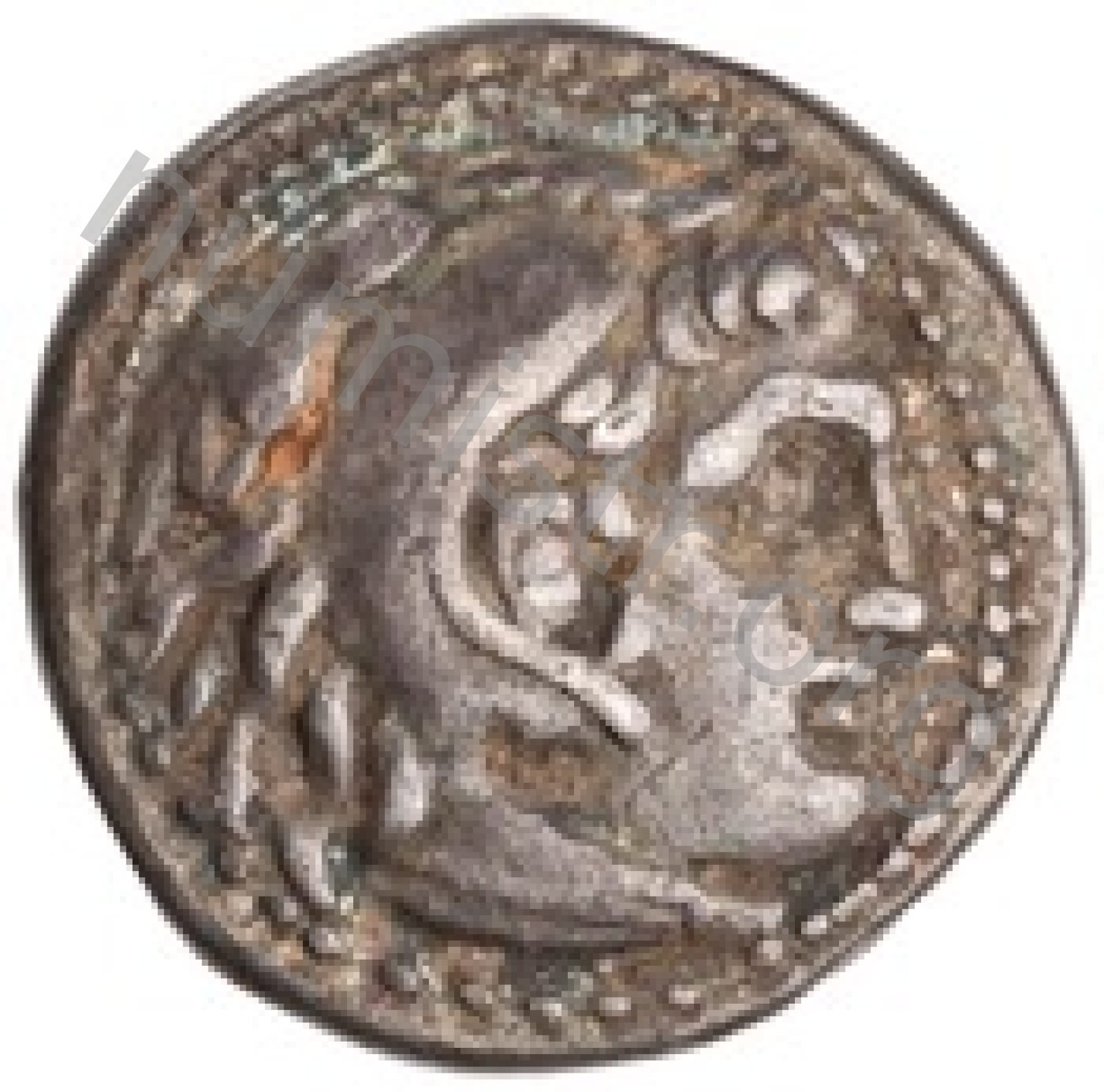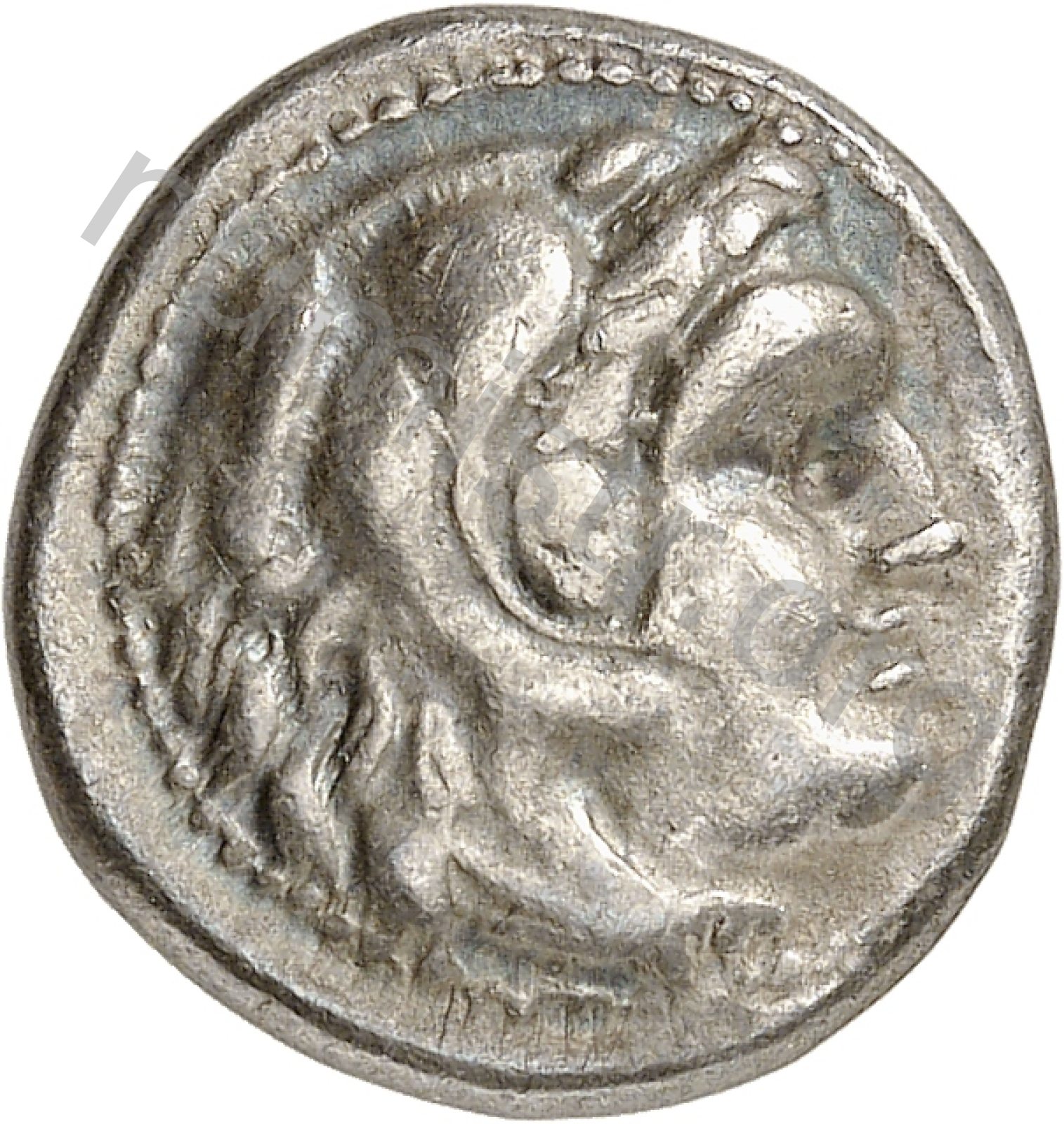 Head of beardless Heracles right wearing lion skin headdress -[en]
