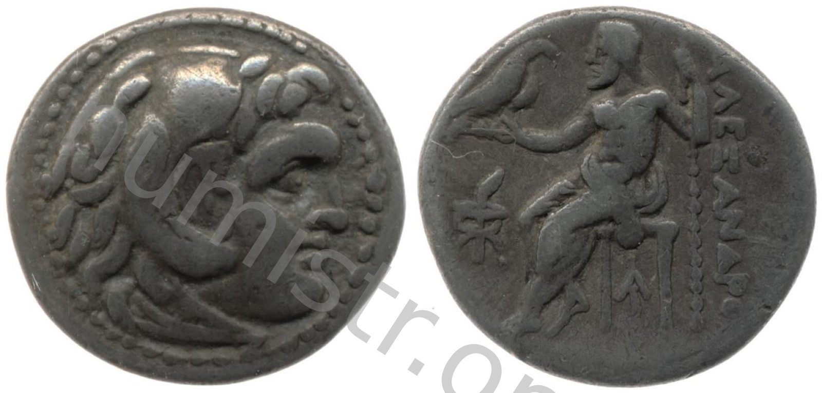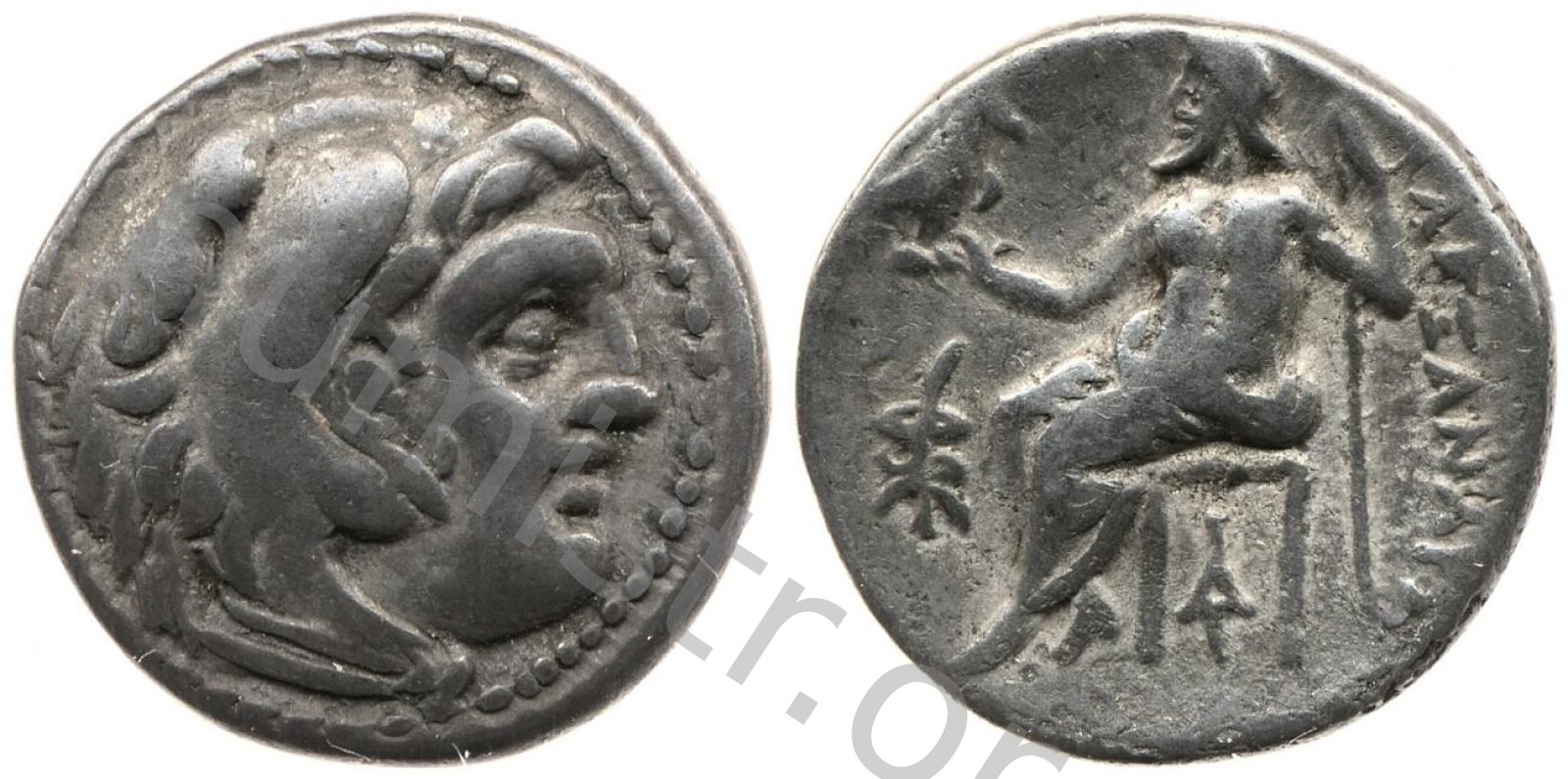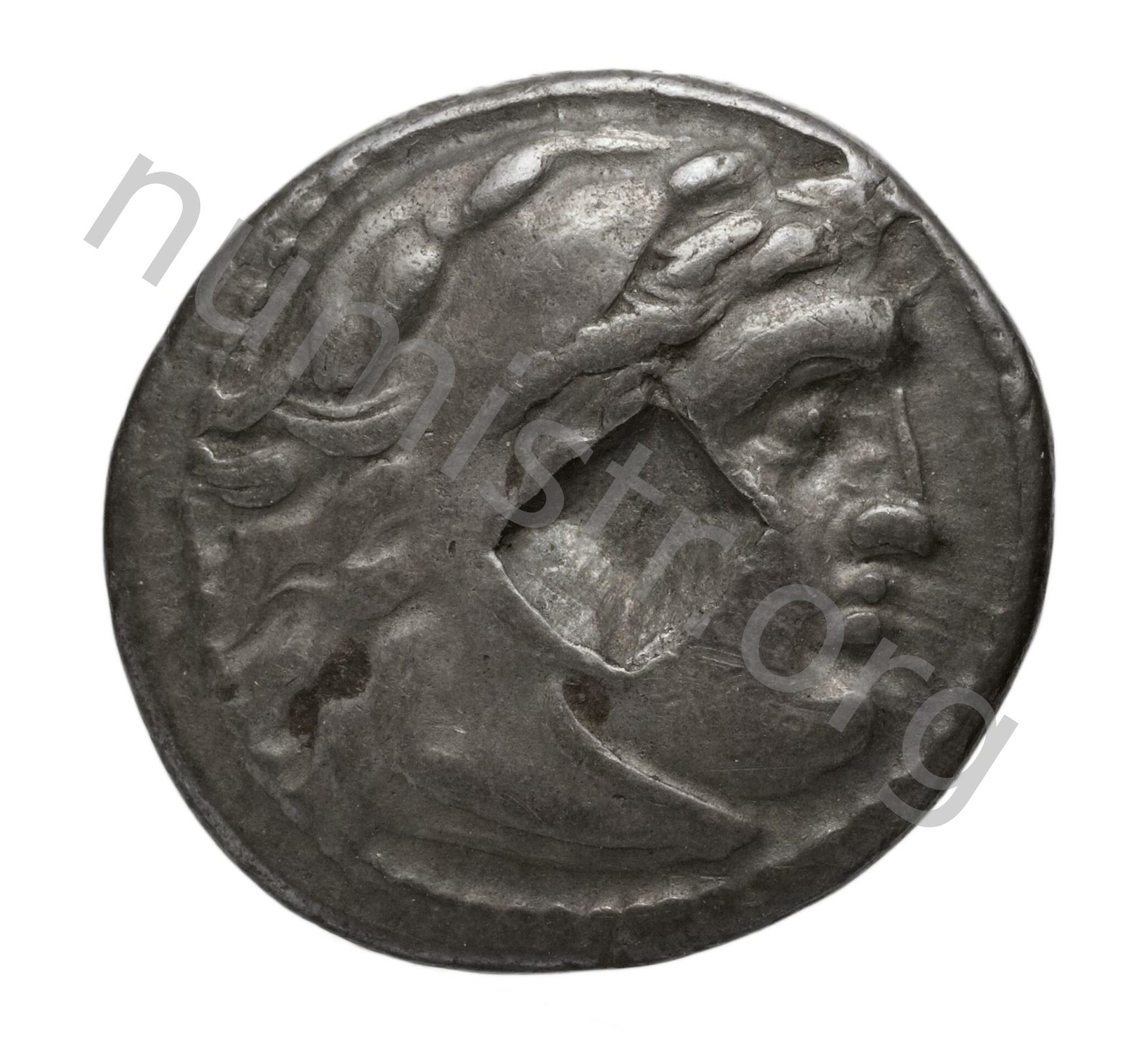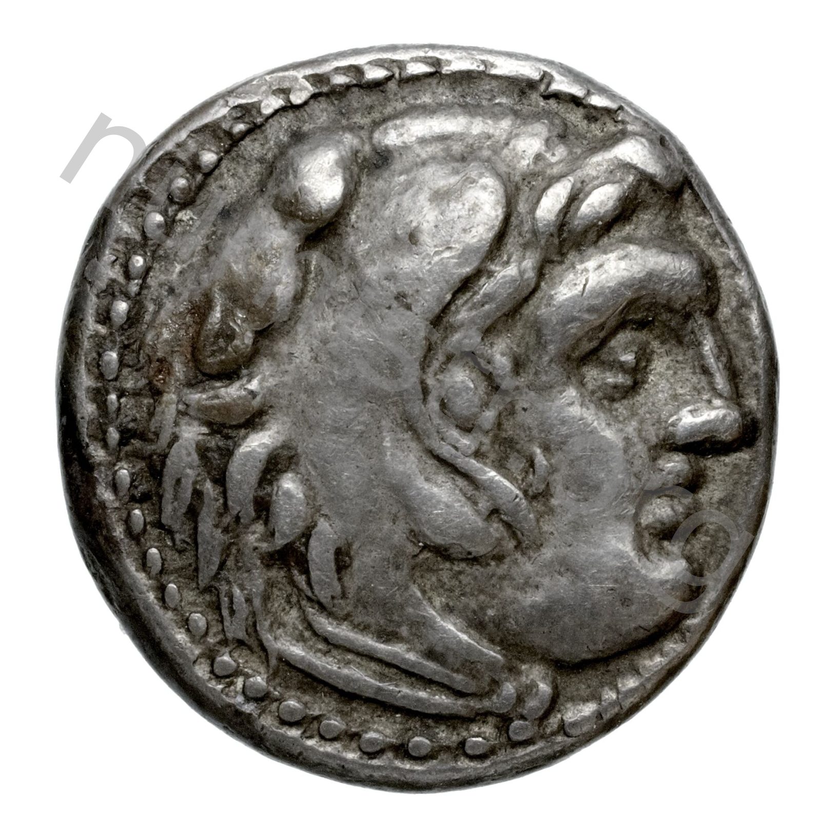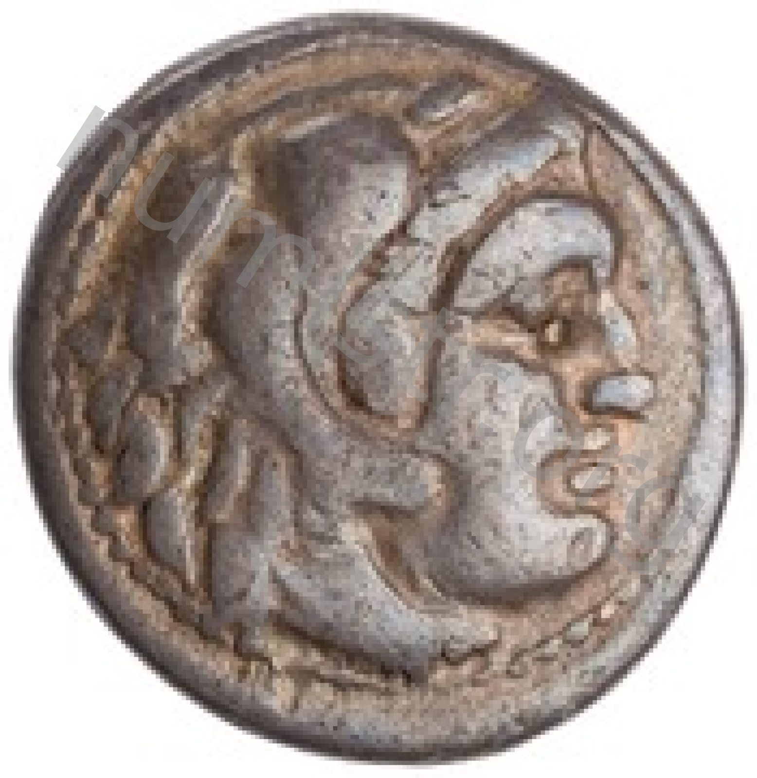 Head of beardless Heracles right wearing lion skin headdress -[en]