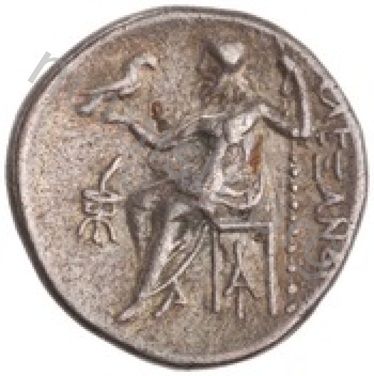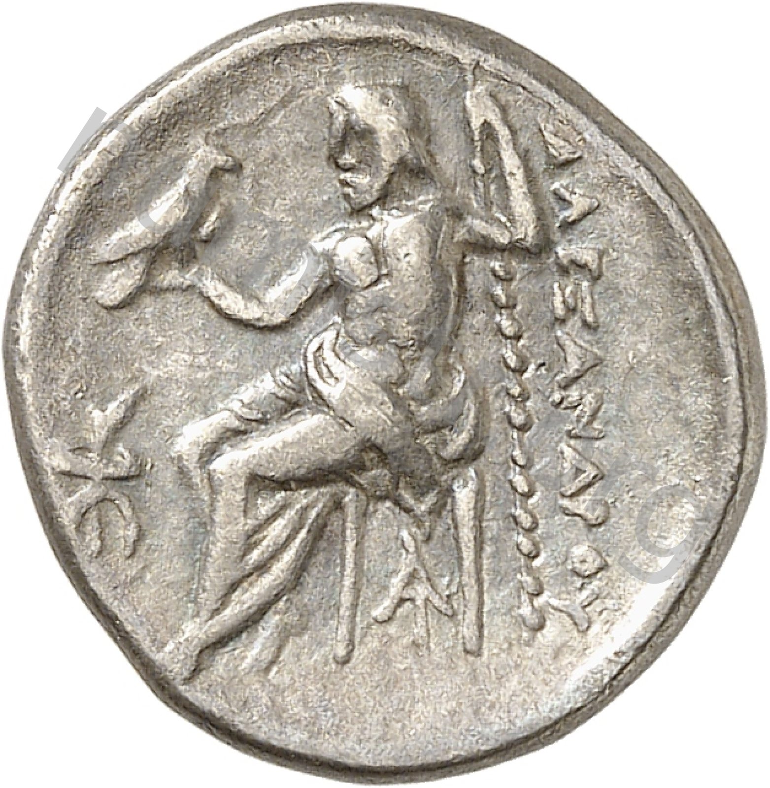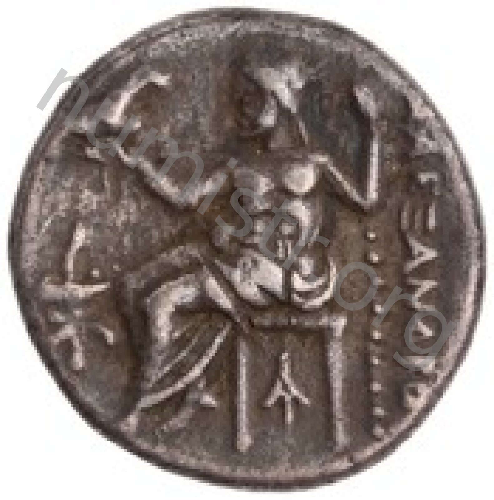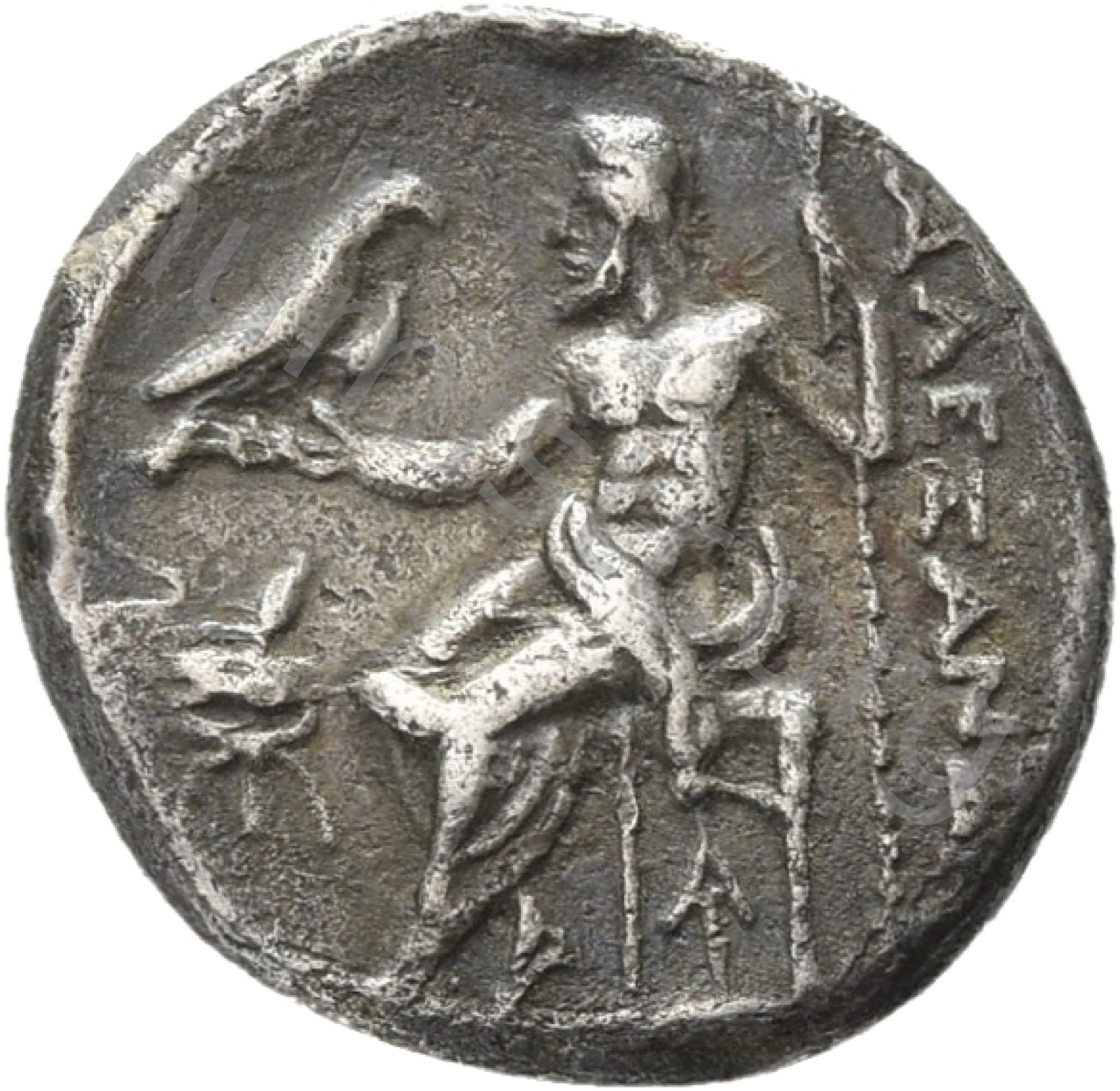 Zeus seated on stool-throne left eagle on outstretched right hand sceptre in left hand -[en]