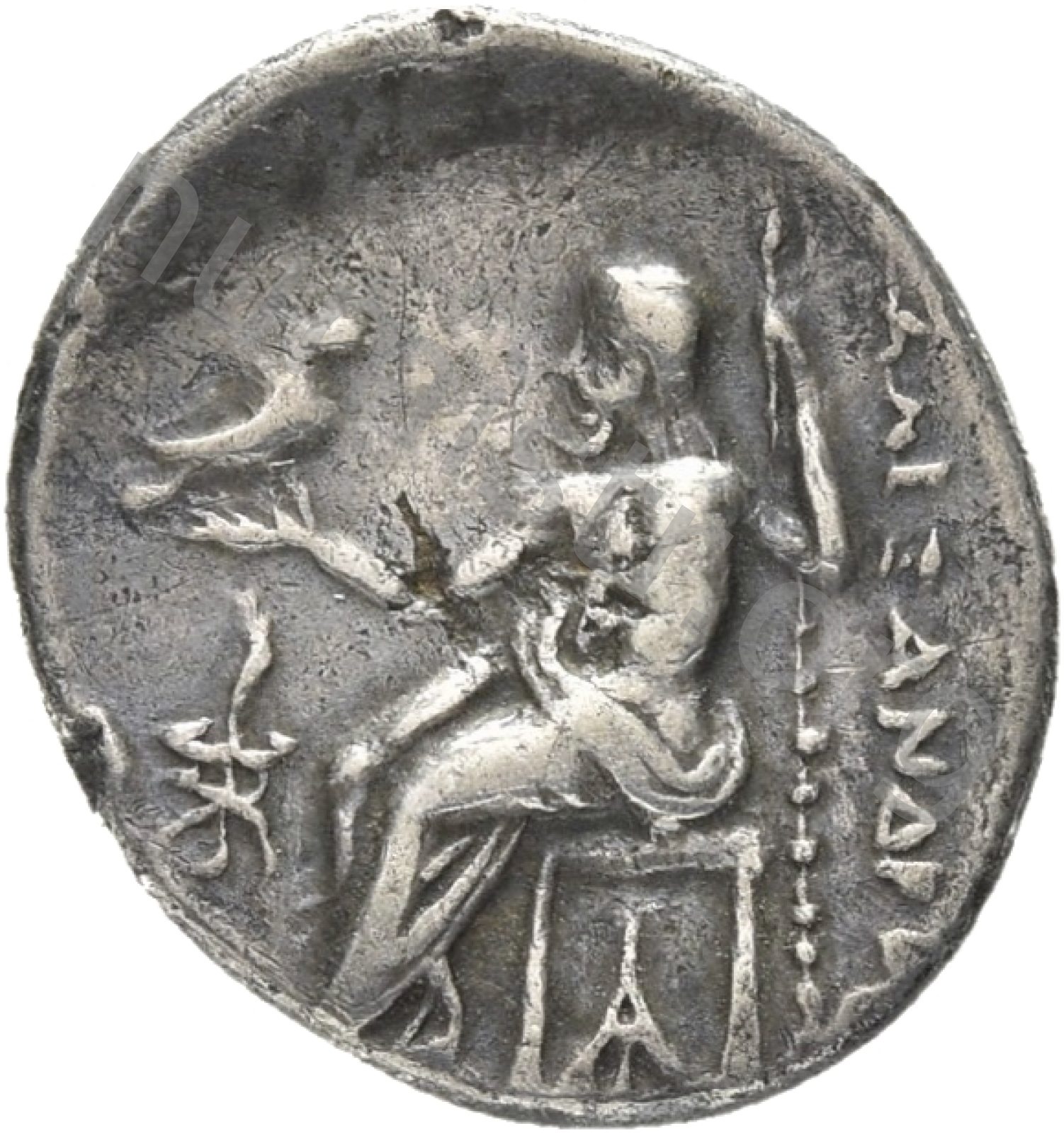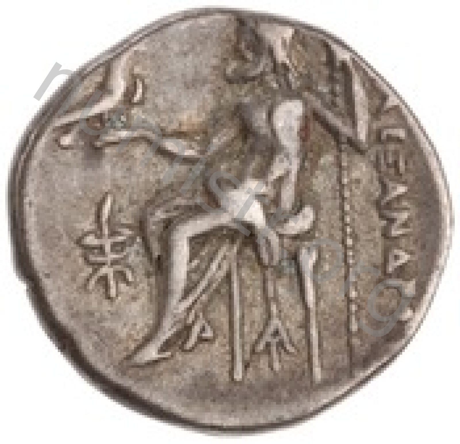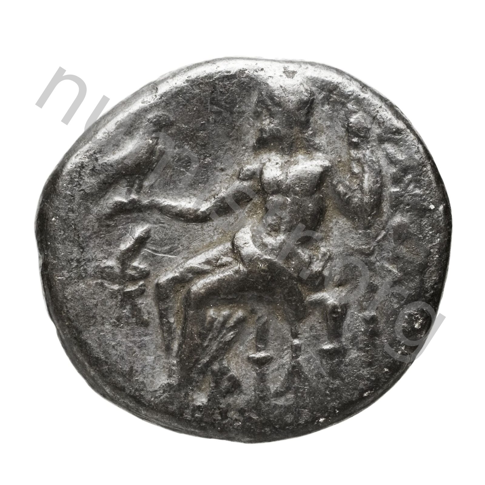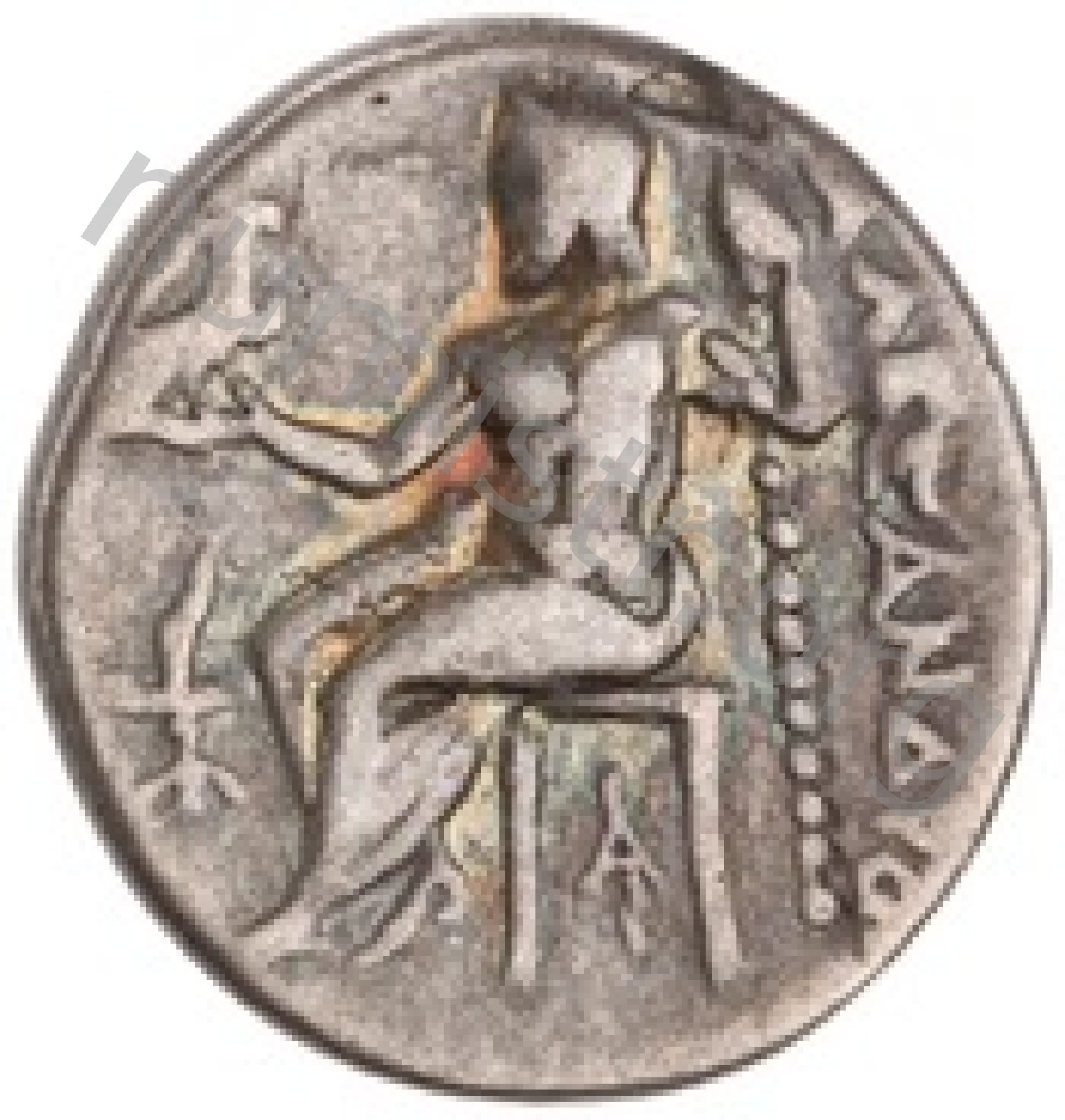 Zeus seated on stool-throne left eagle on outstretched right hand sceptre in left hand -[en]