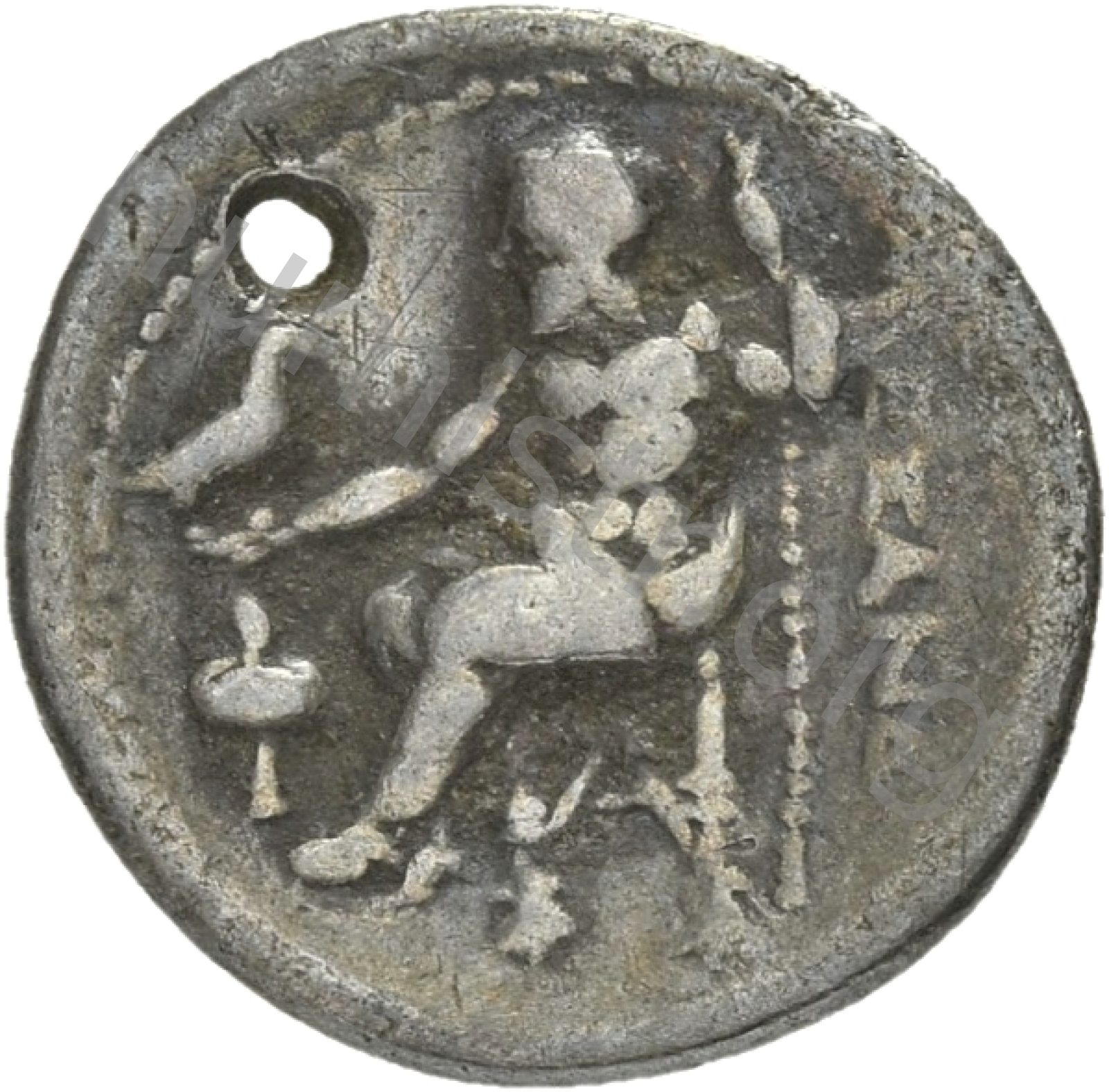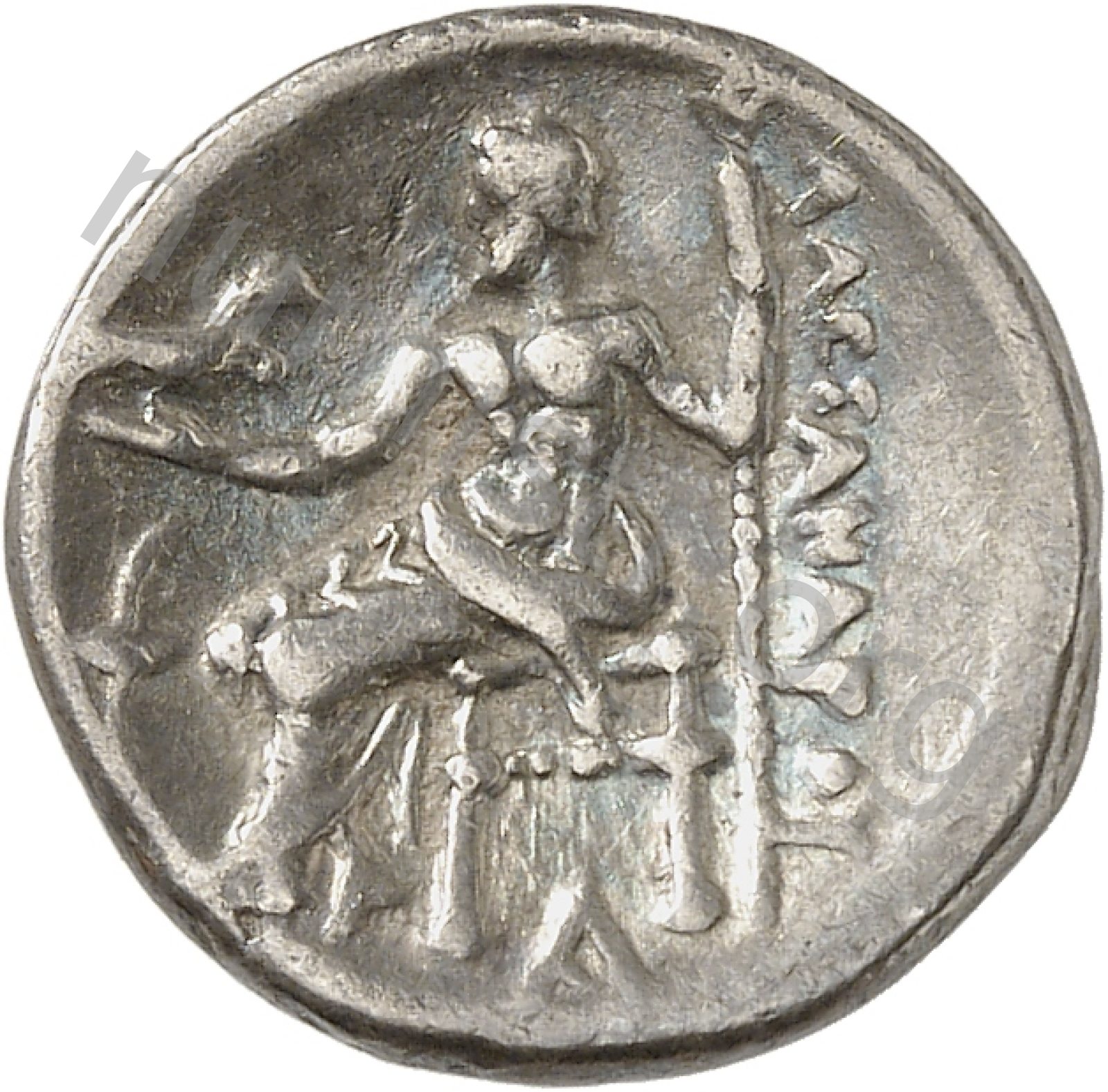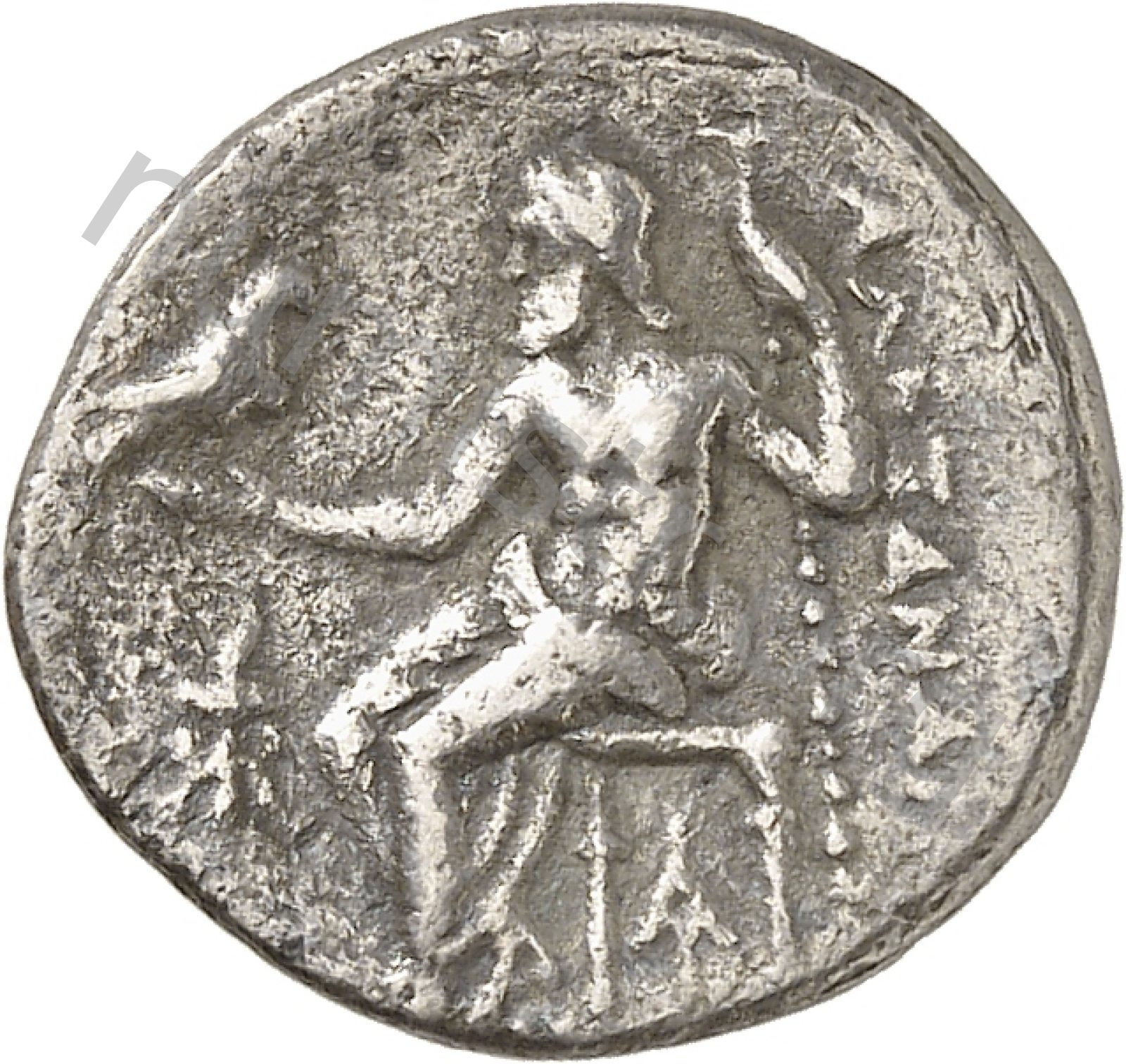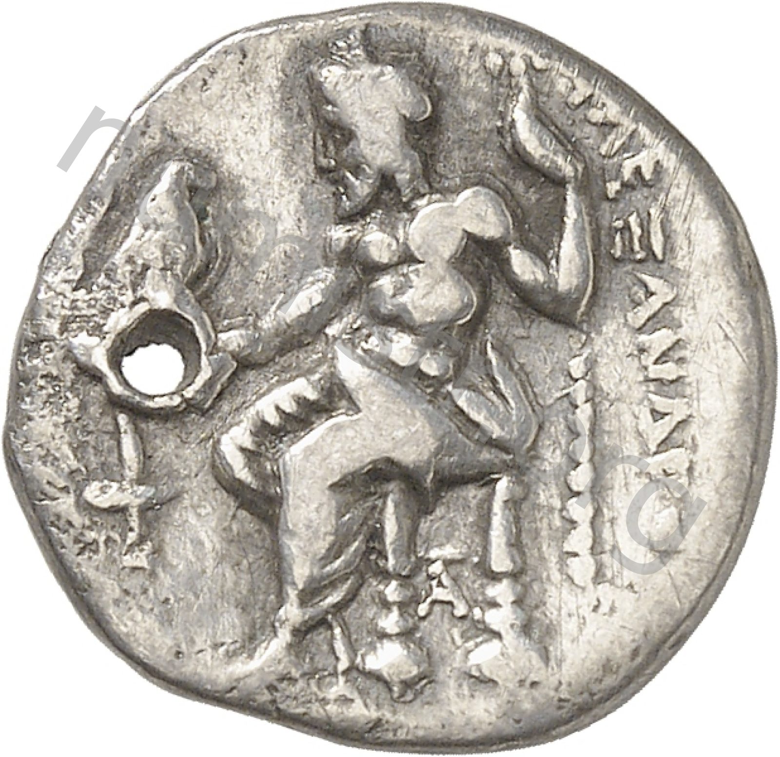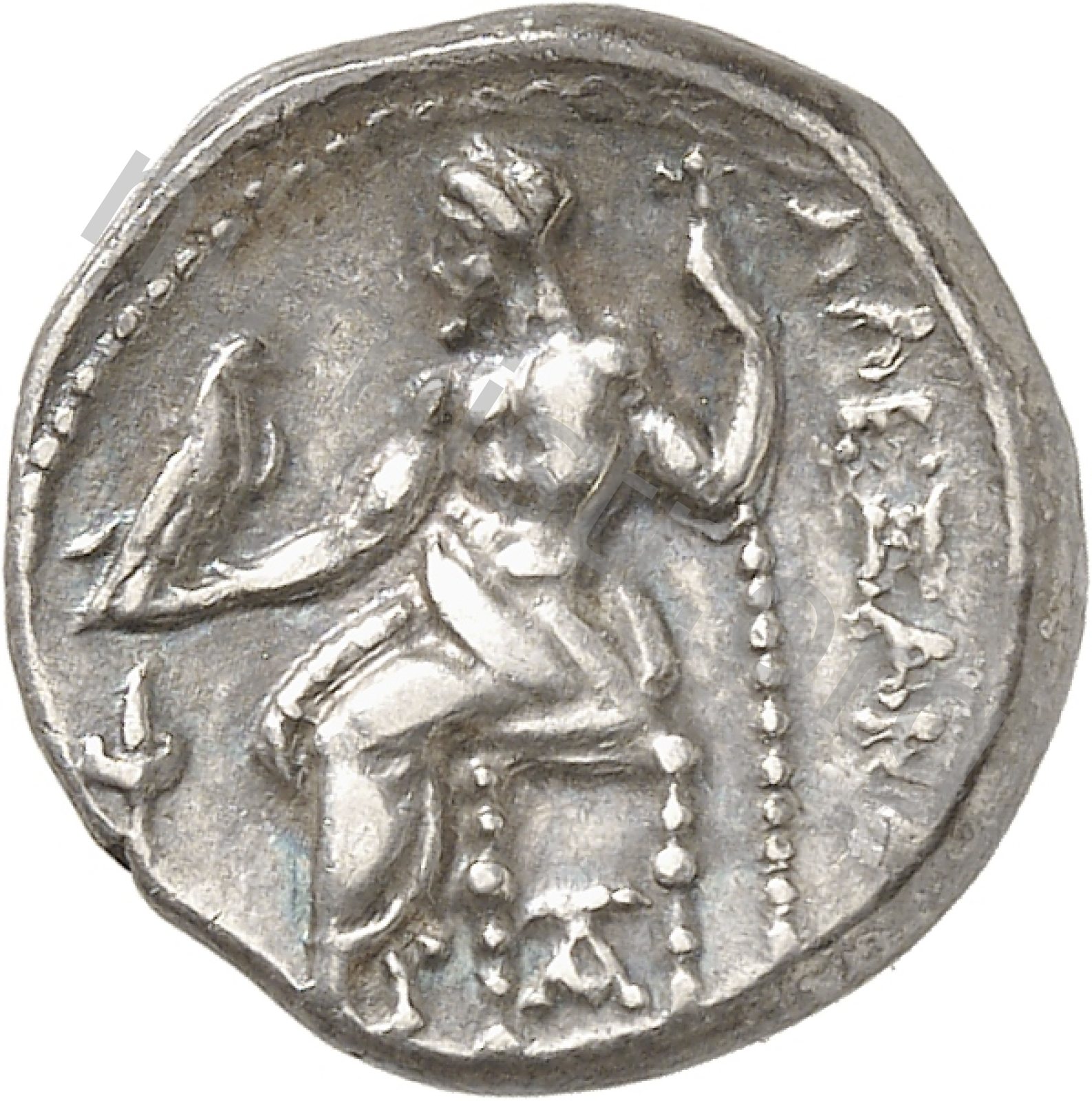 Zeus seated on stool-throne left eagle on outstretched right hand sceptre in left hand -[en]