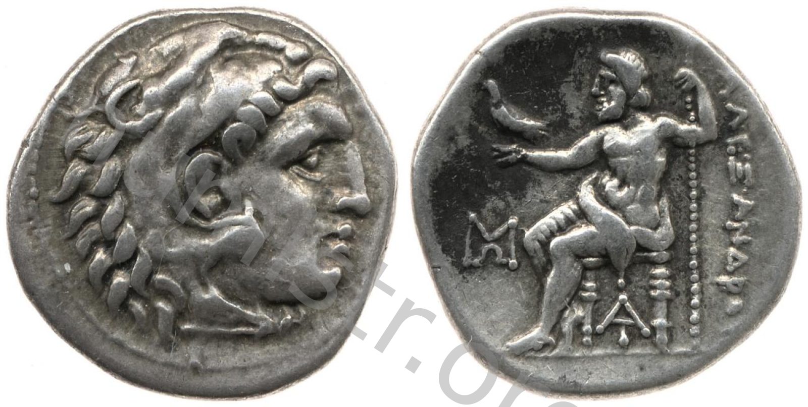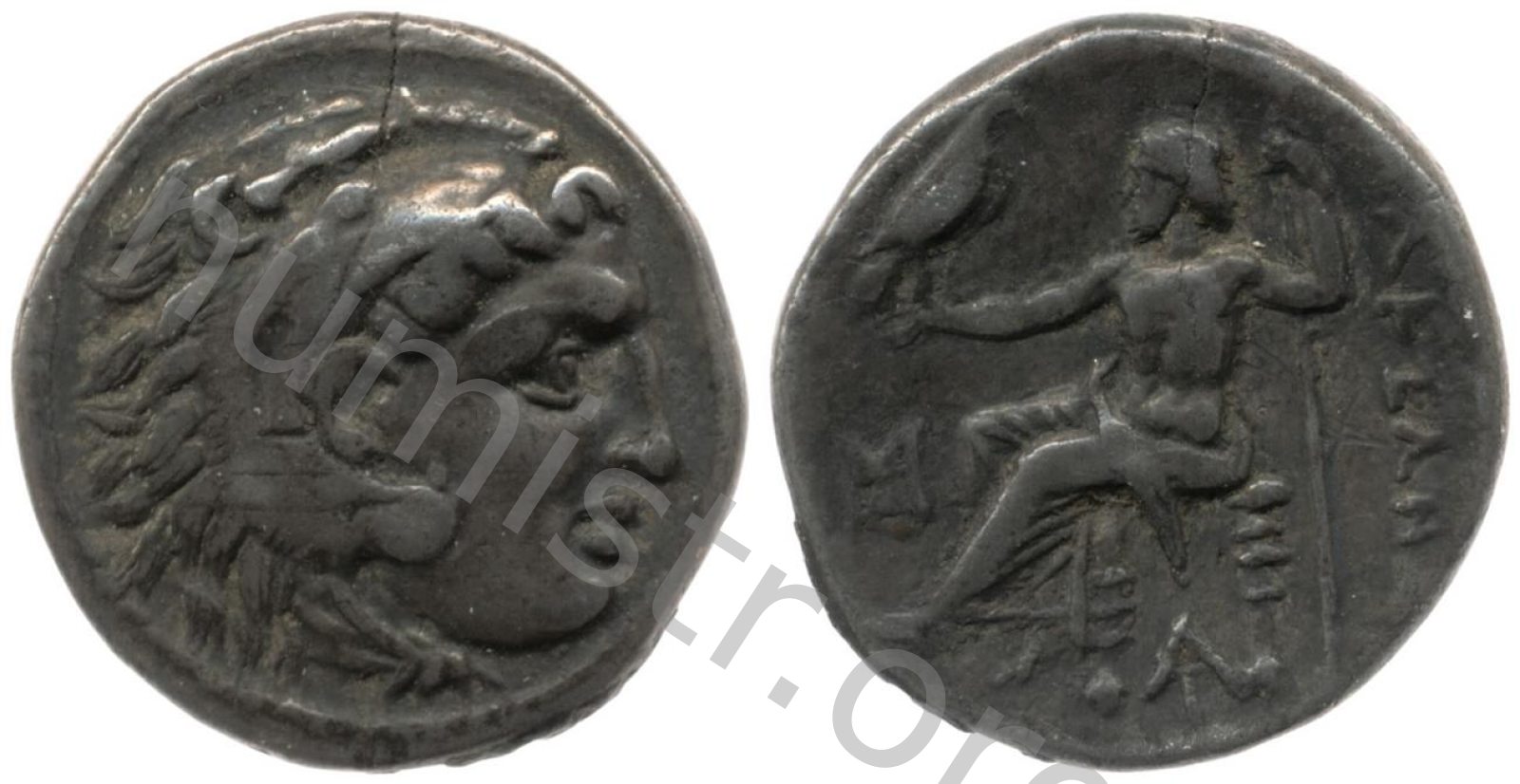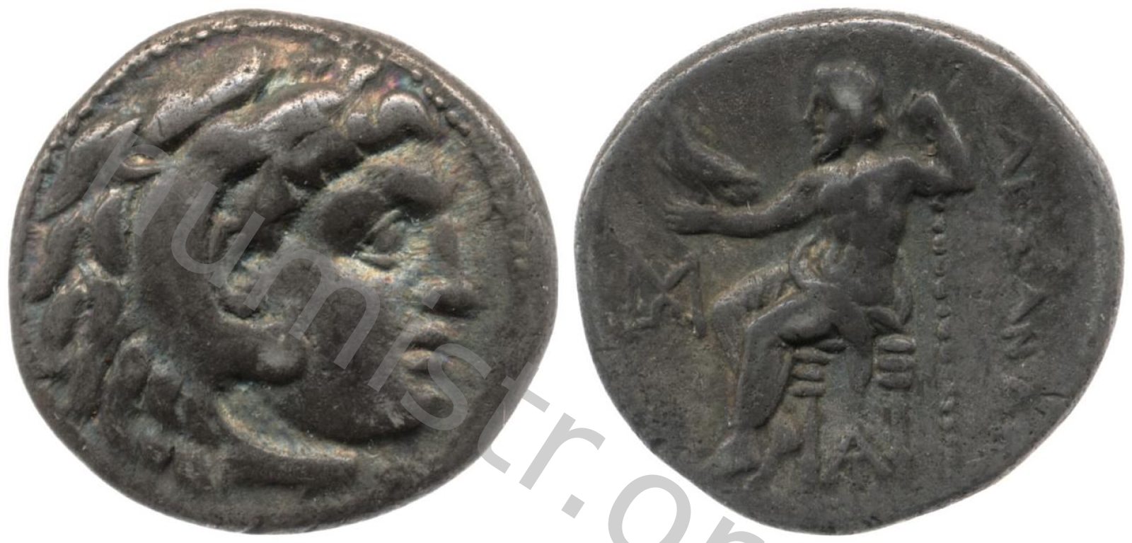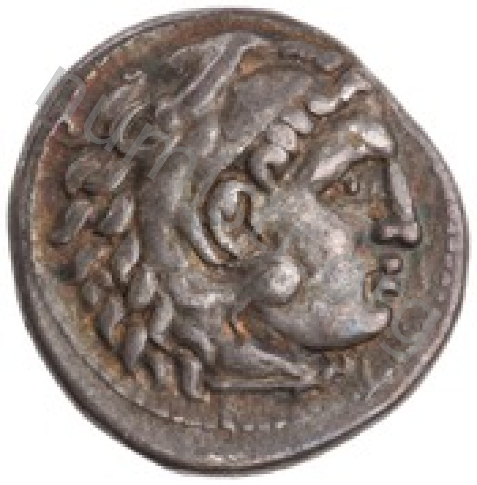 Head of beardless Heracles right wearing lion skin headdress -[en]