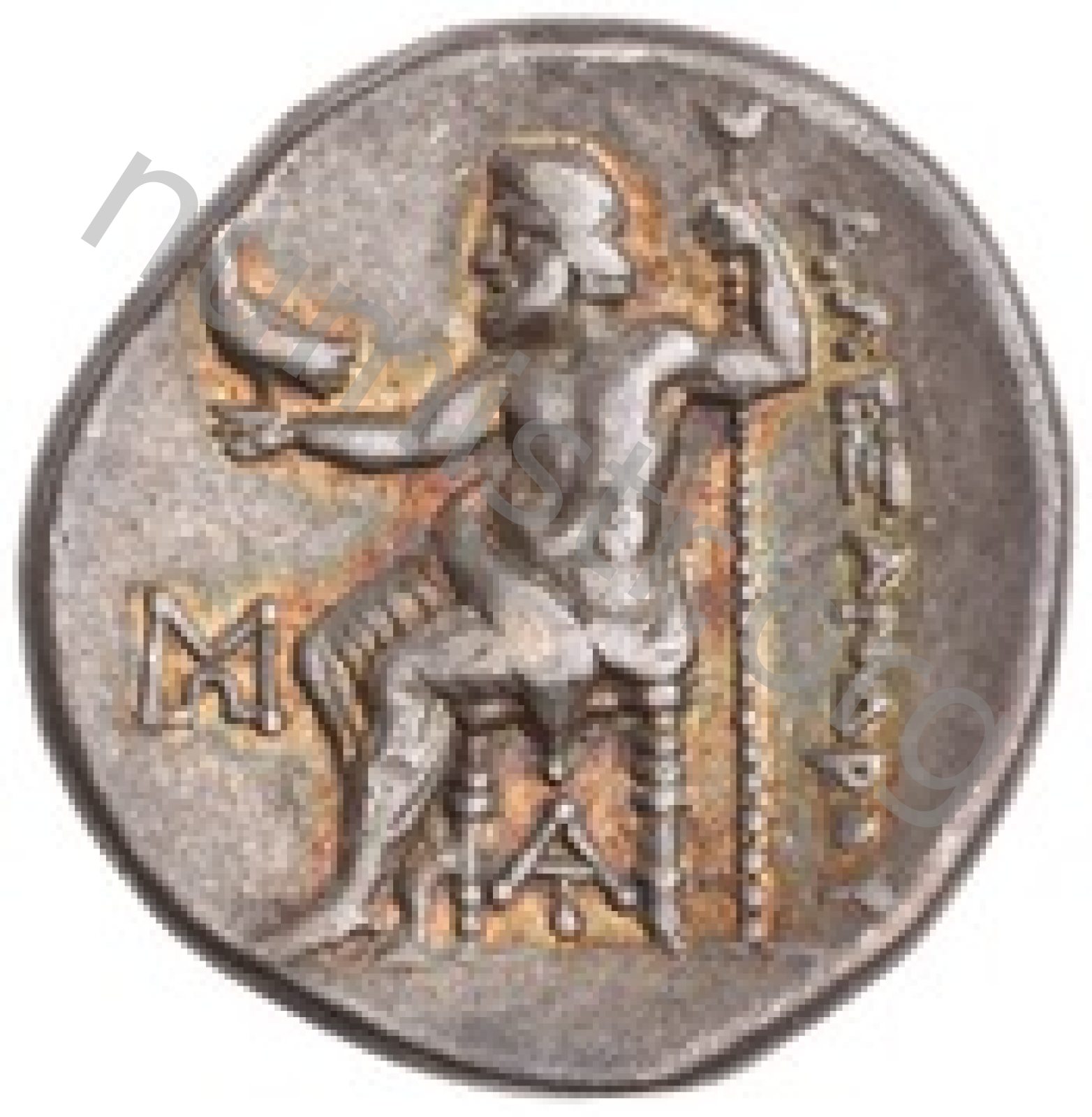 Zeus tabure-tahtta oturuyor sol elinde kartal sağ elinde asa var.