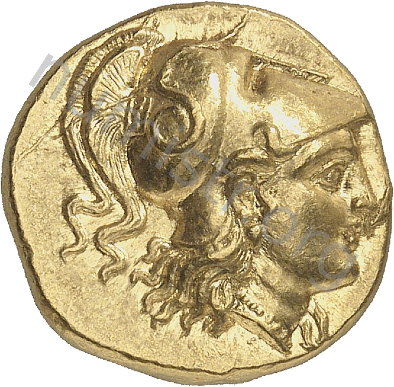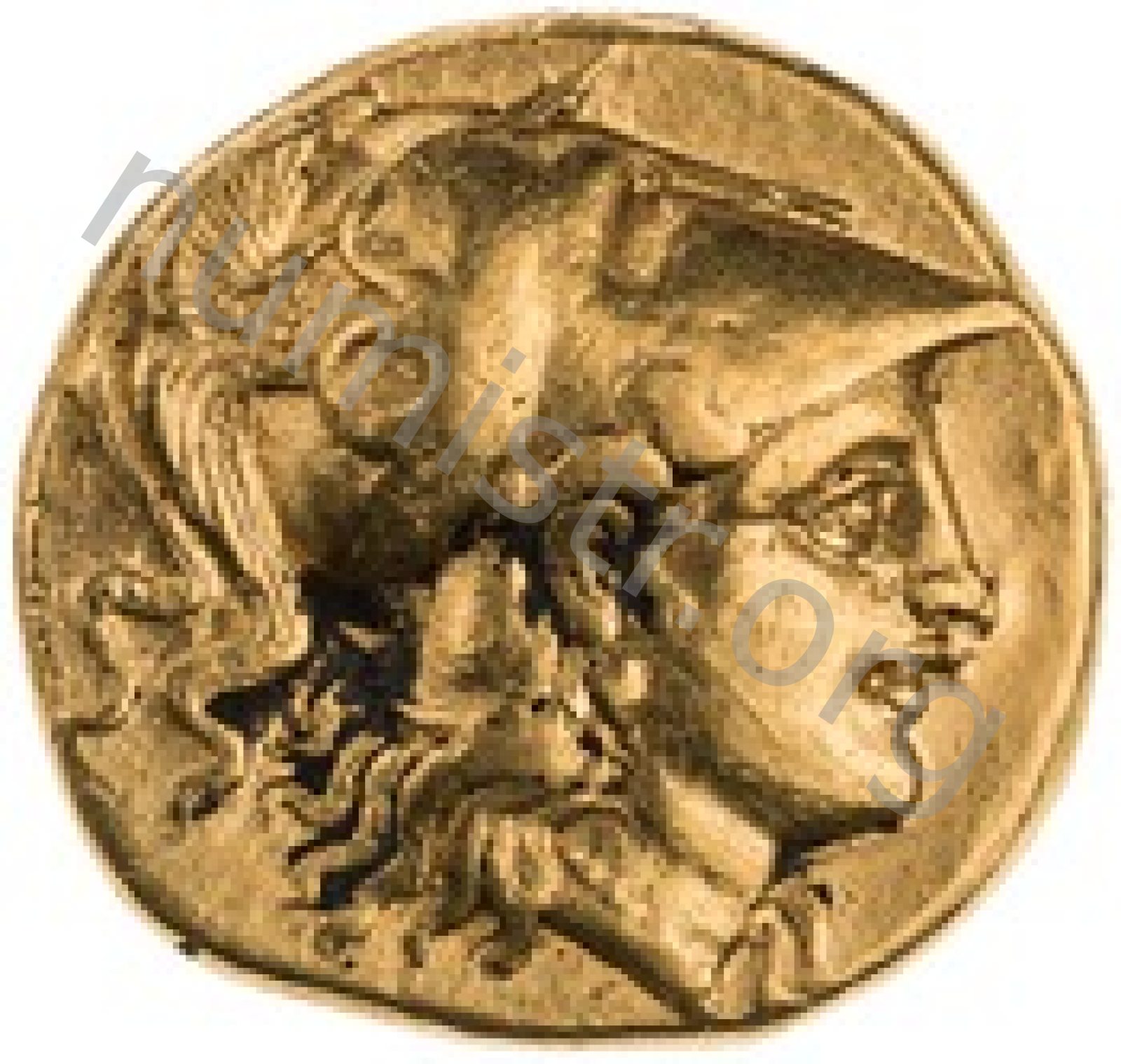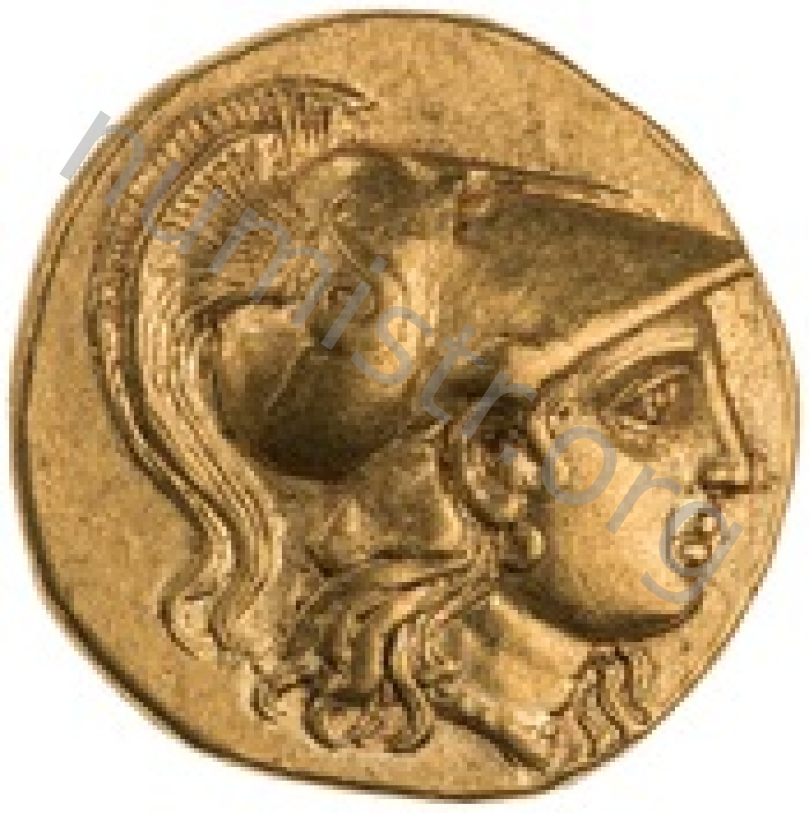 Head of Athena right wearing Corinthian helmet with crest -[en]