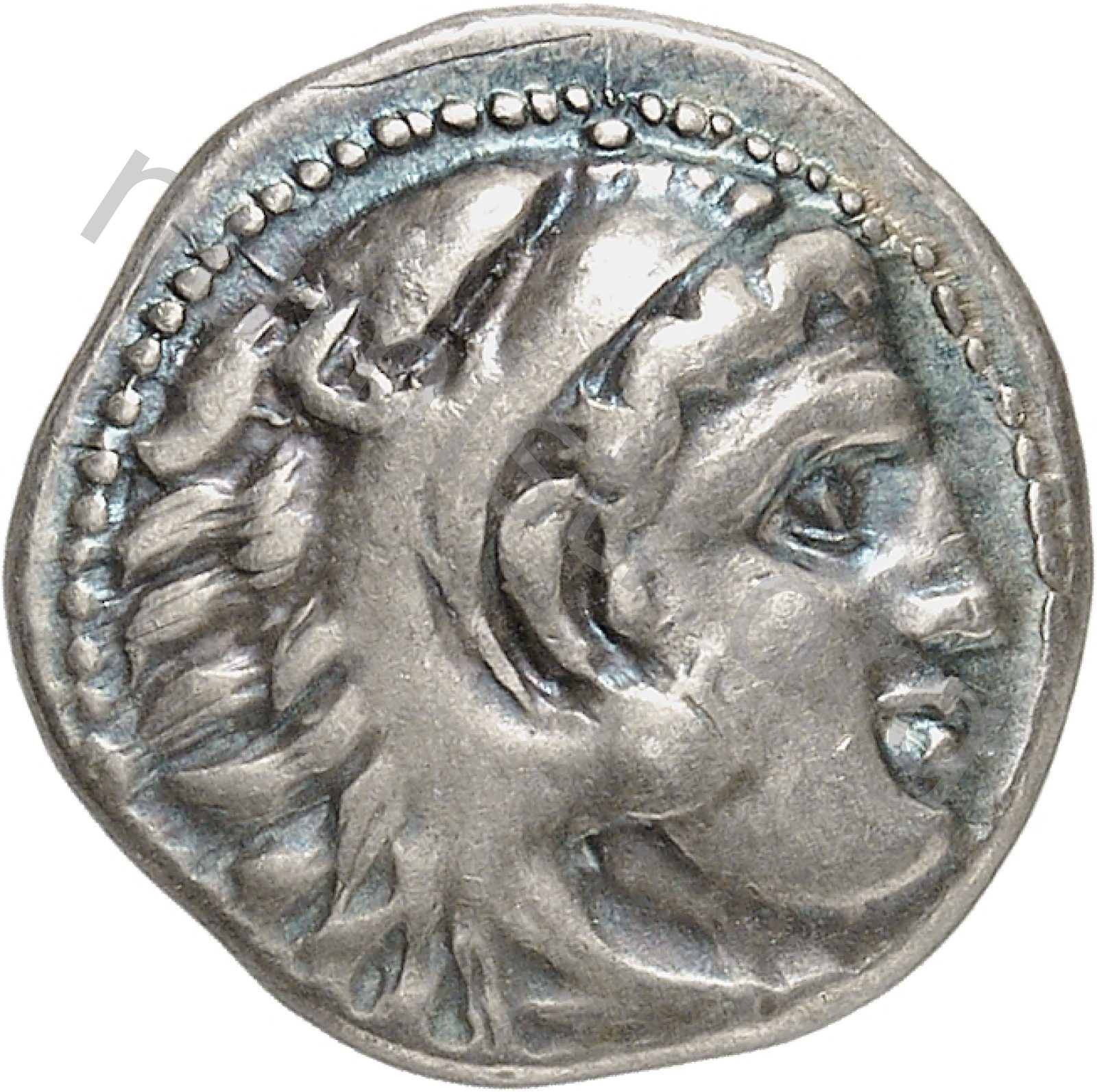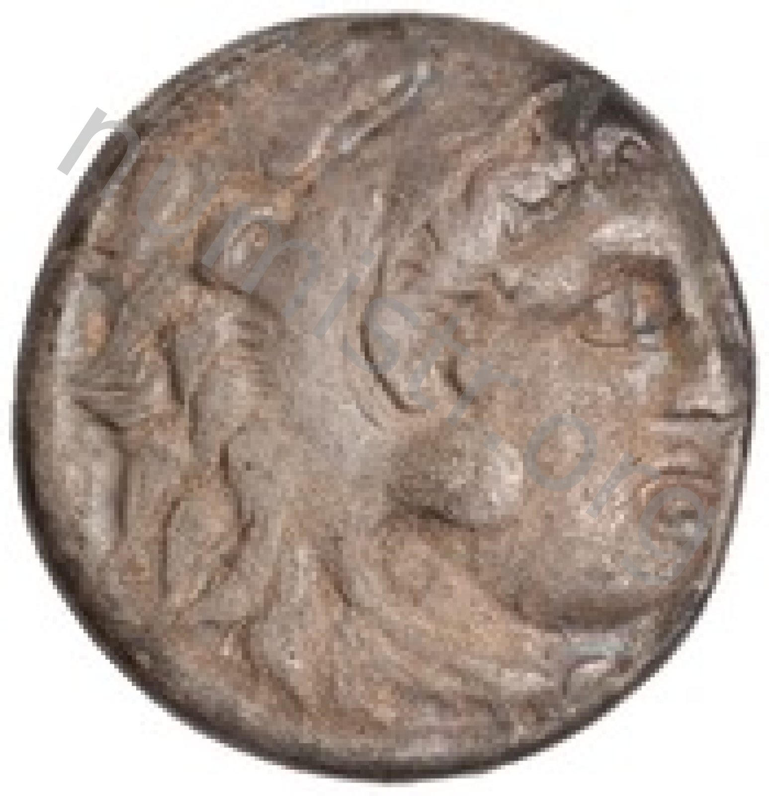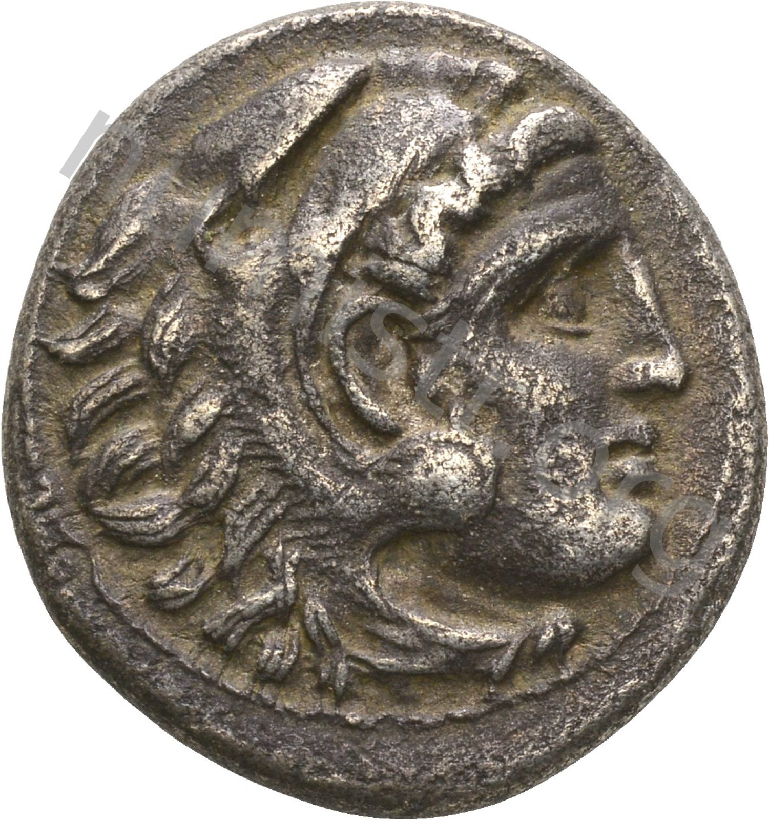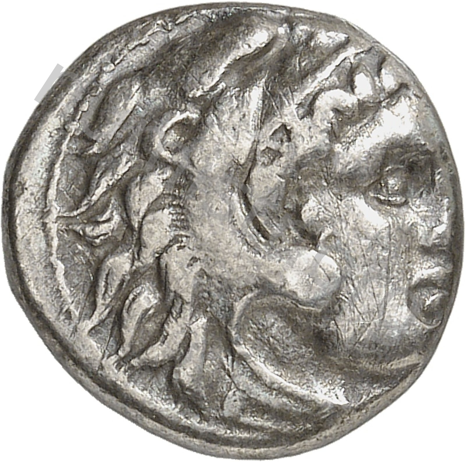 Head of beardless Heracles right wearing lion skin headdress -[en]