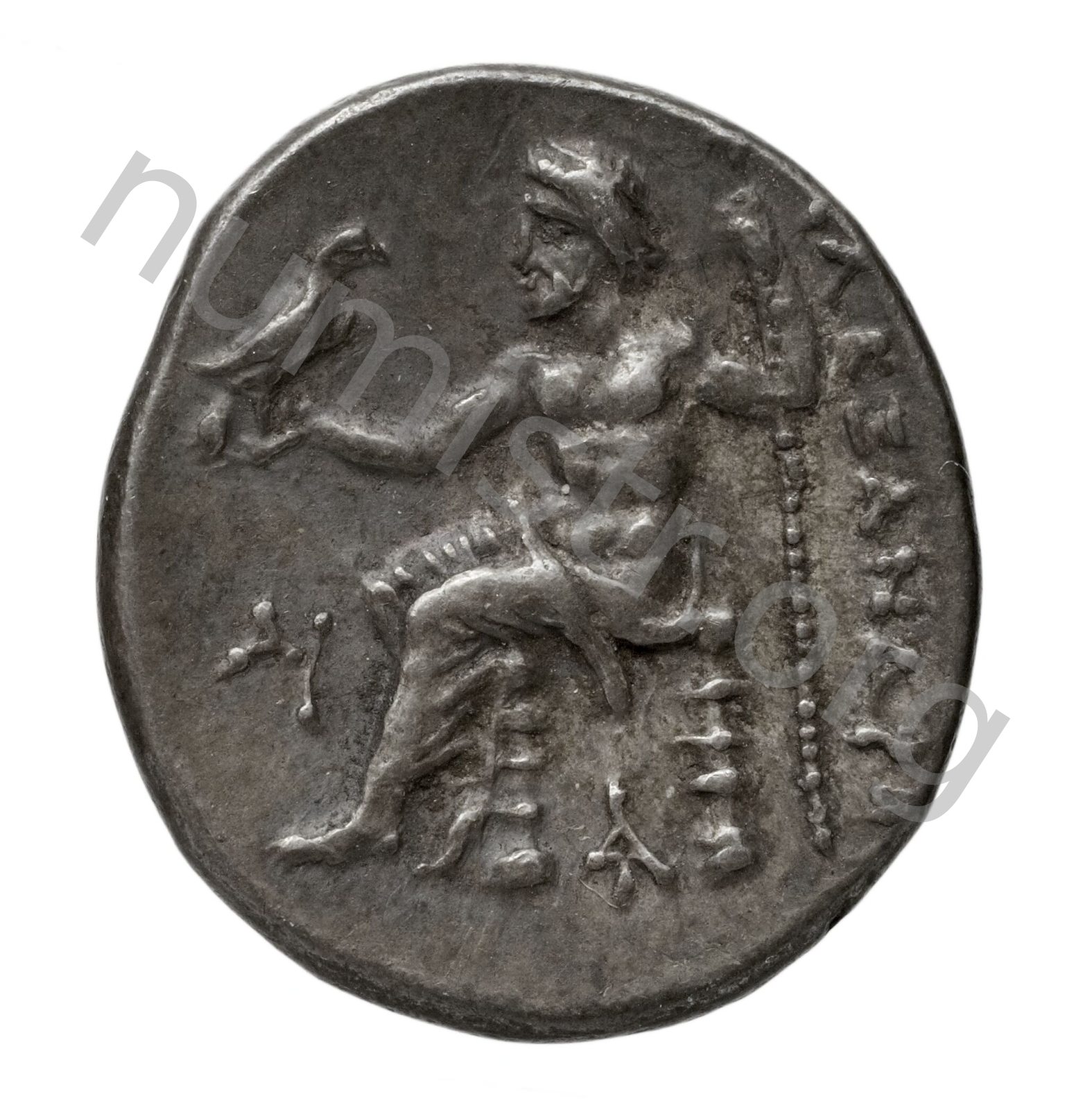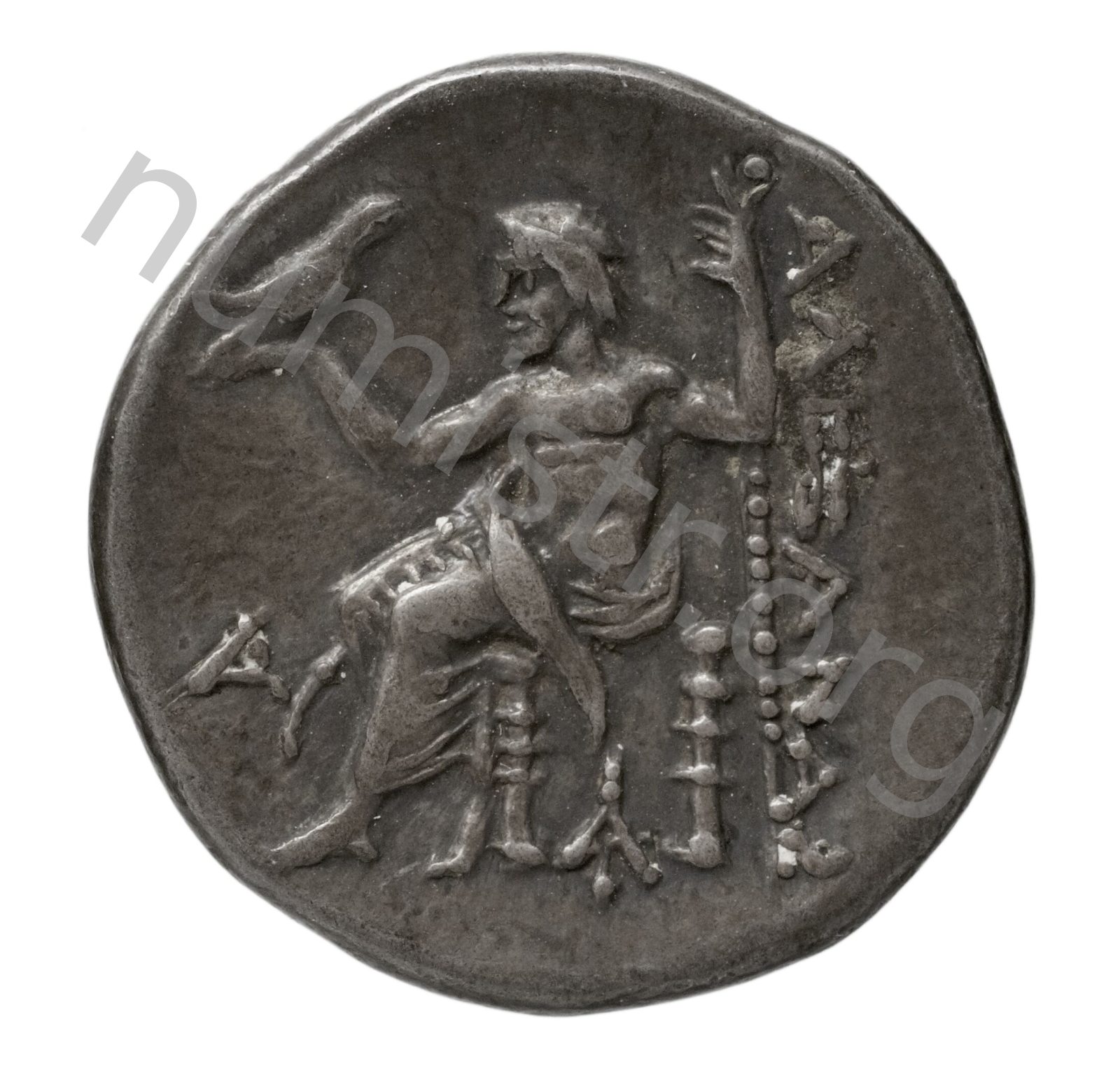 Zeus seated on stool-throne left eagle on outstretched right hand sceptre in left hand -[en]