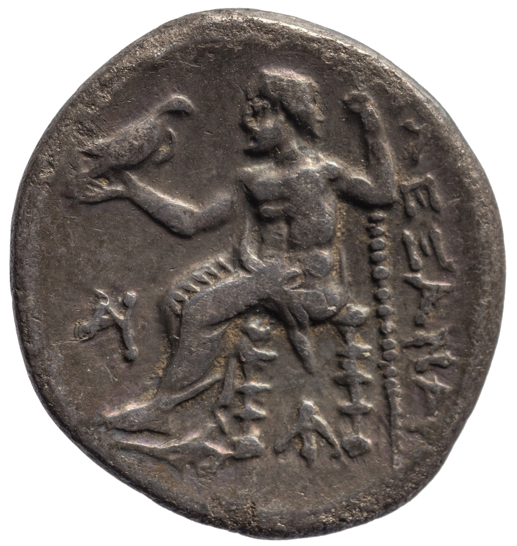 Zeus tabure-tahtta oturuyor sol elinde kartal sağ elinde asa var.