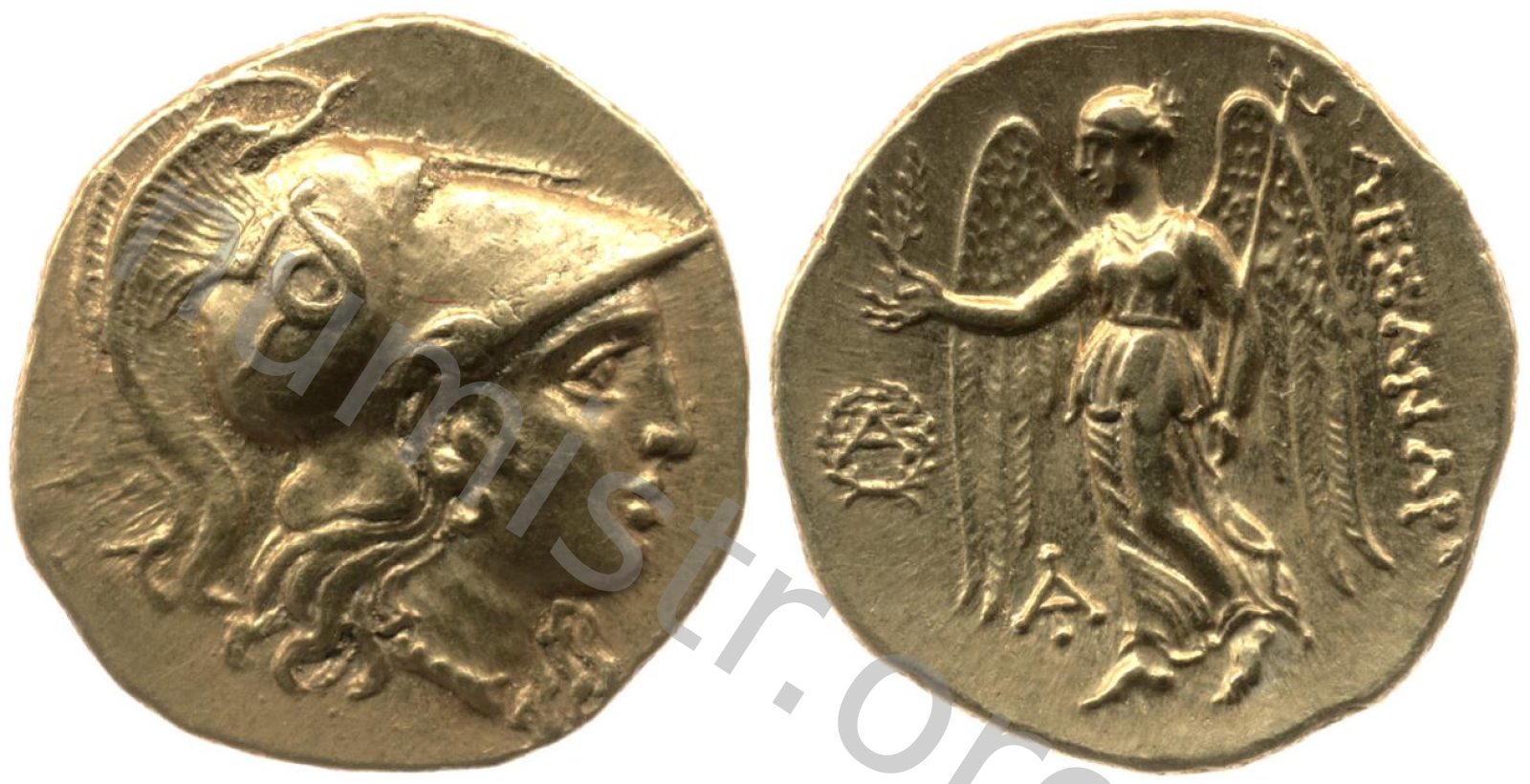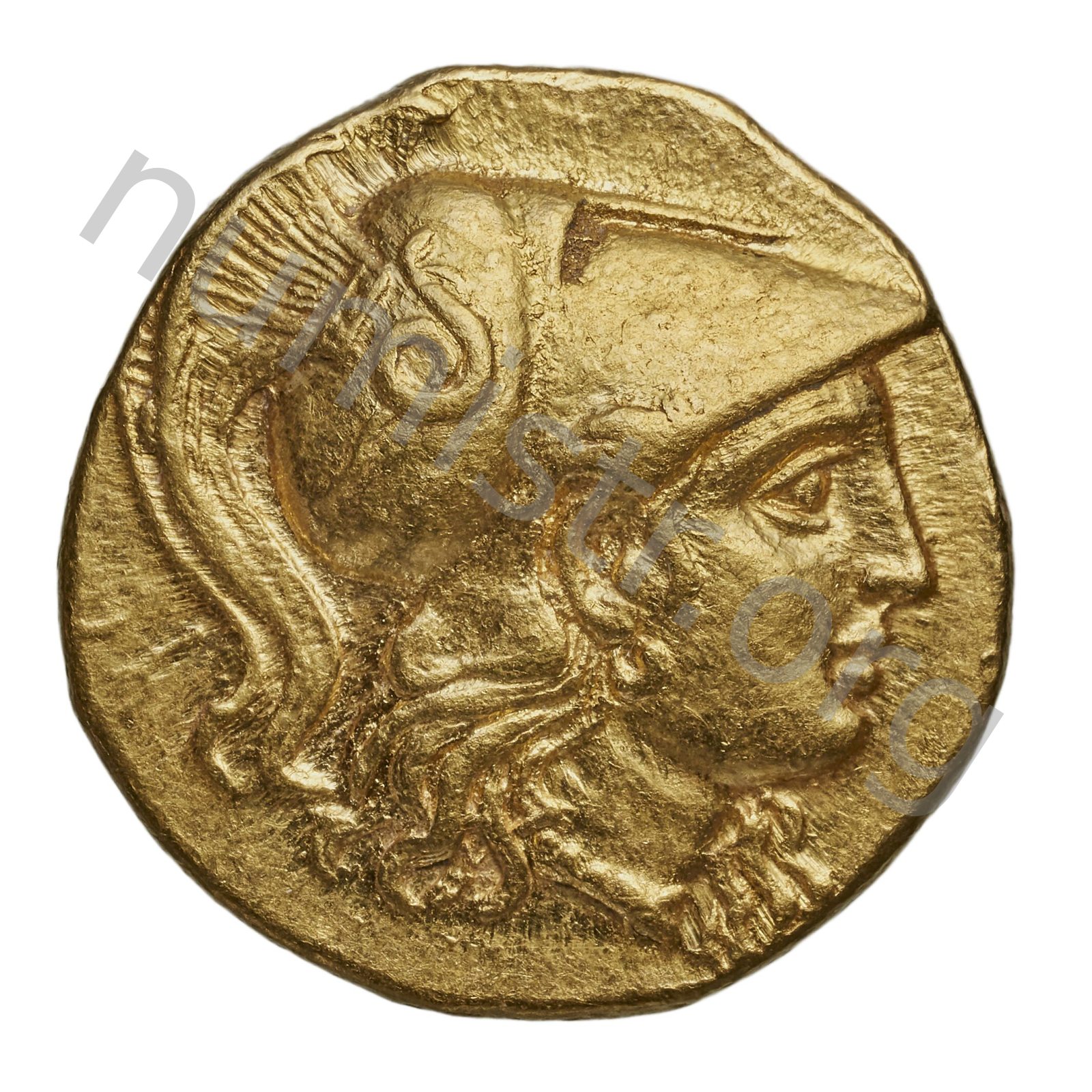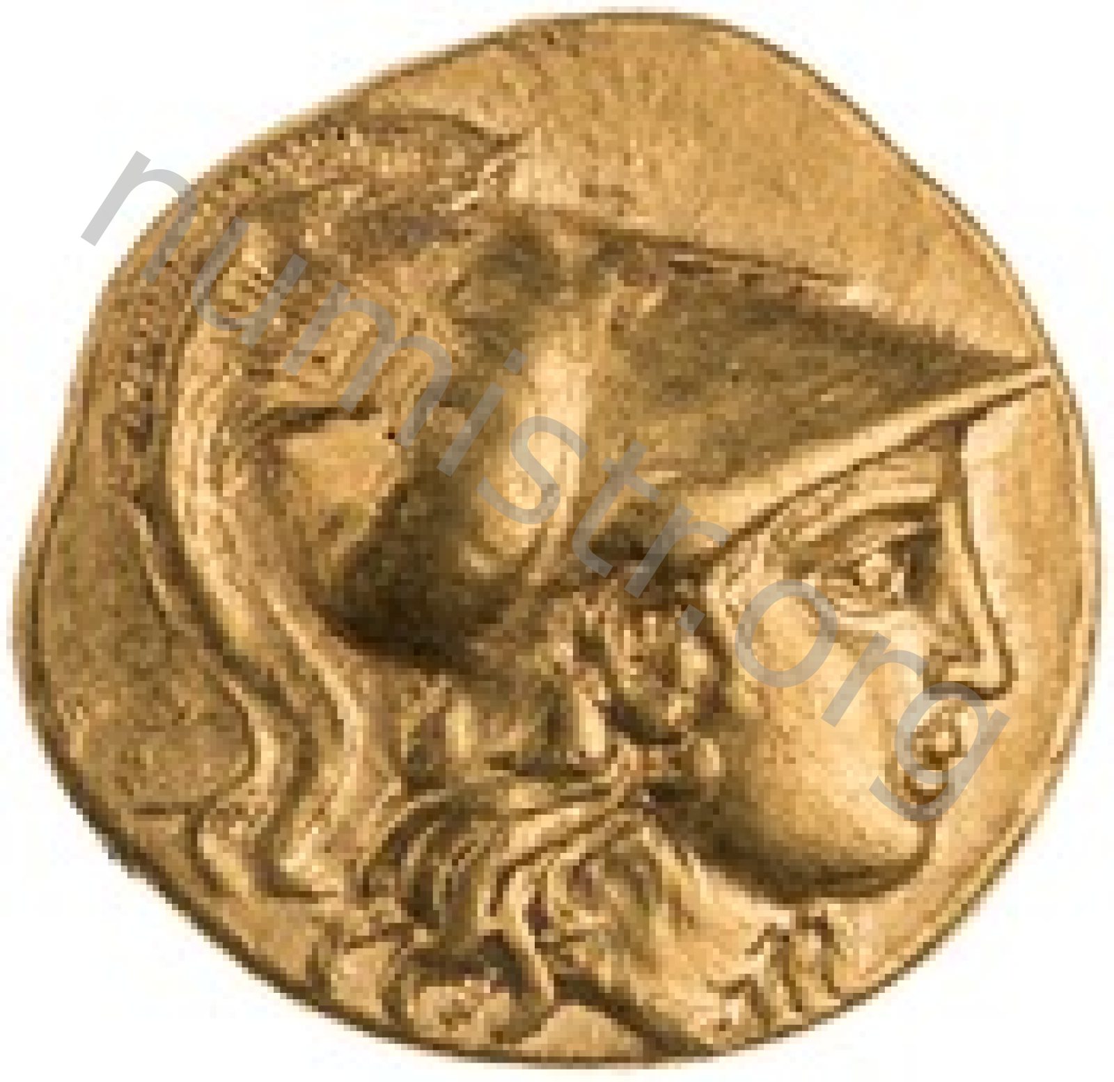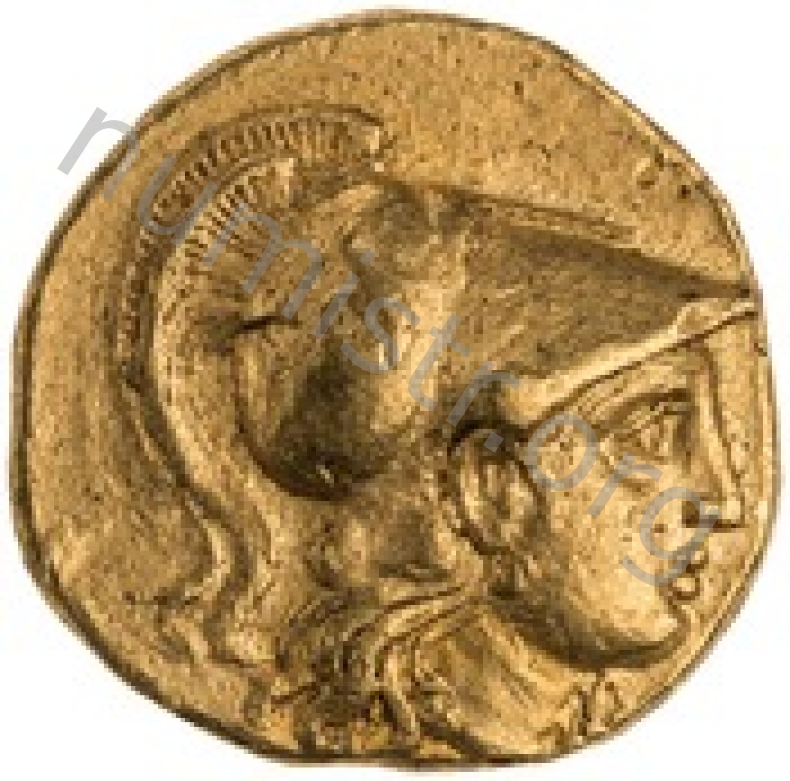 Head of Athena right wearing Corinthian helmet with crest -[en]